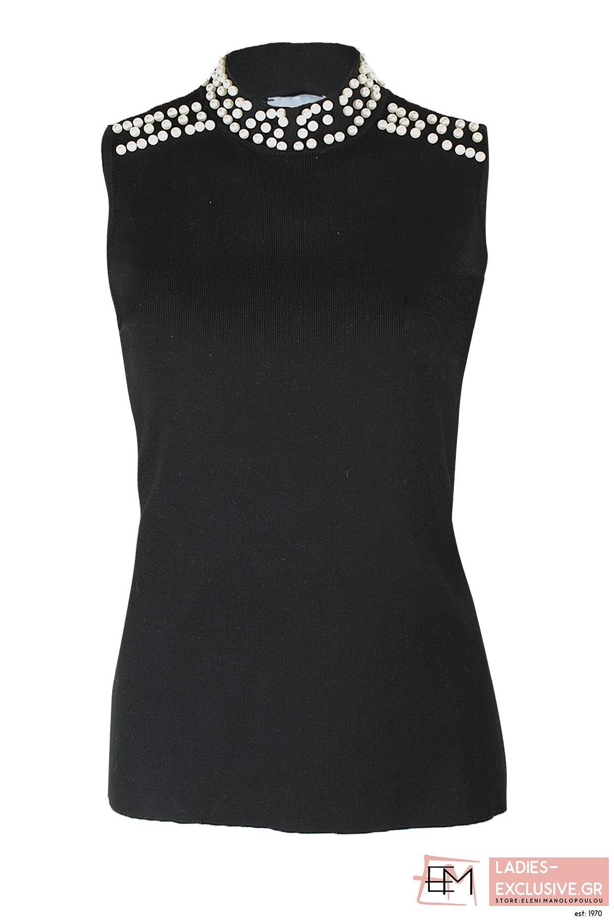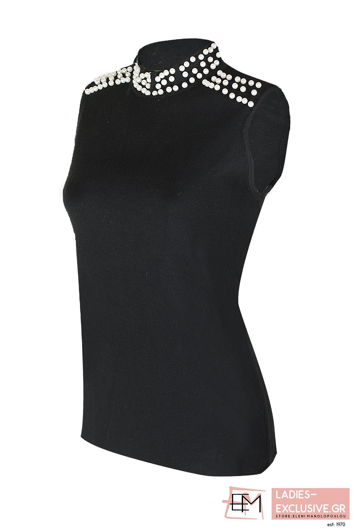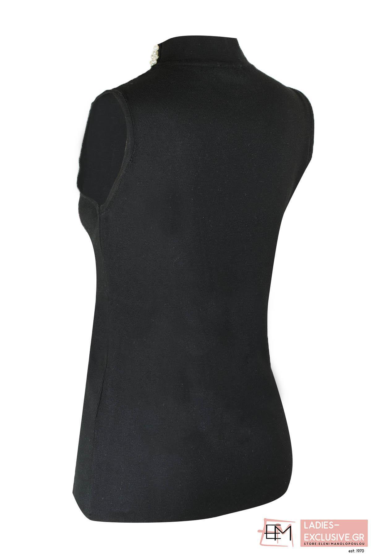NICOLA Μπλούζα μαύρη αμάνικη με λευκές πέρλες και ψηλό λαιμό.