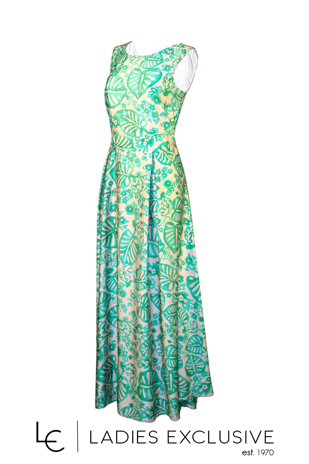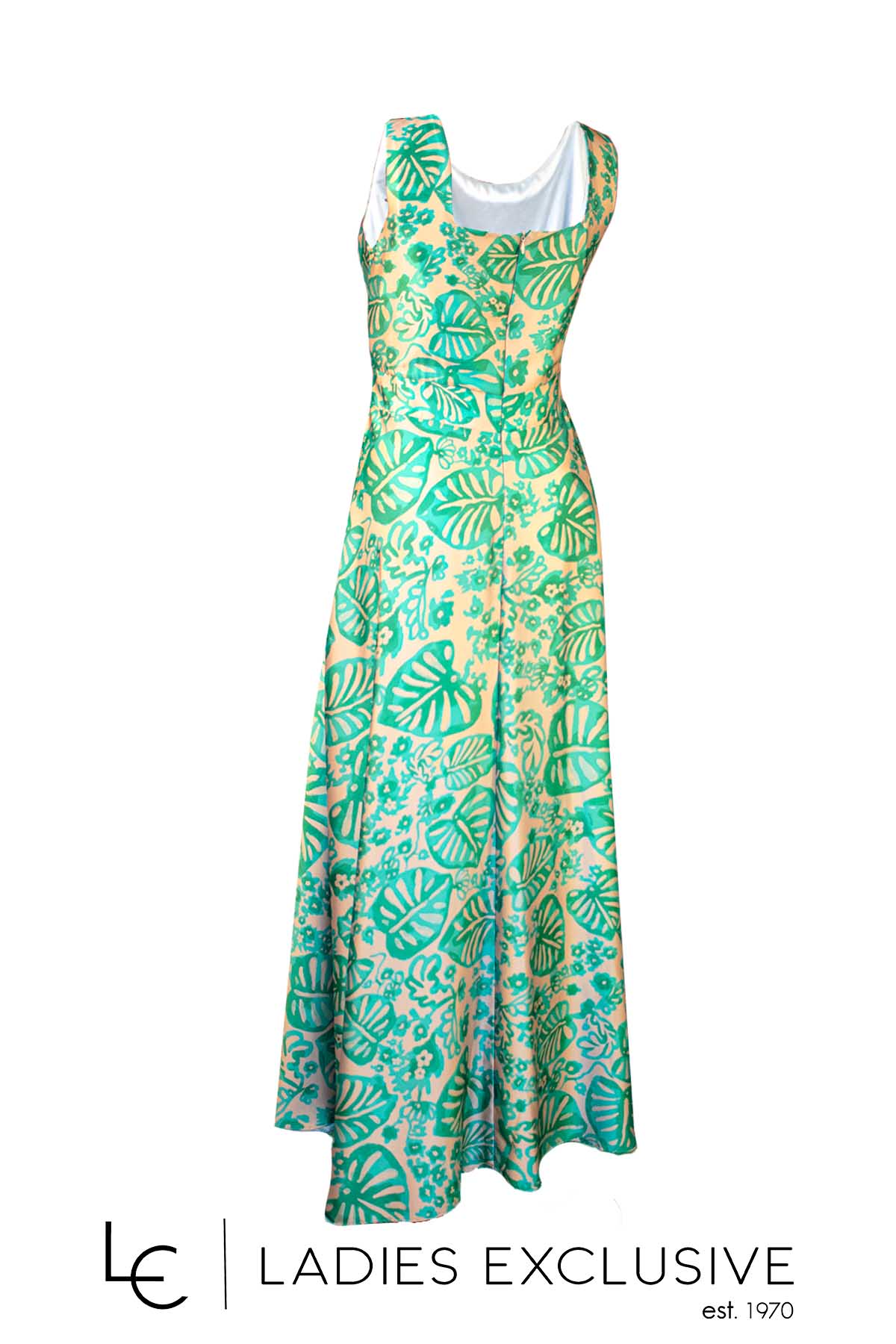 VETO Φόρεμα πράσινο με μπεζ αμάνικο μακρύ σατέν, με ανοιχτή πλάτη και πιέτες. Διαθέτει επιπλέον ύφασμα για τοποθέτηση μανικιού.