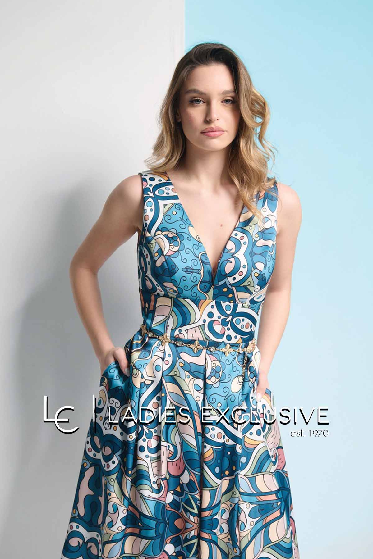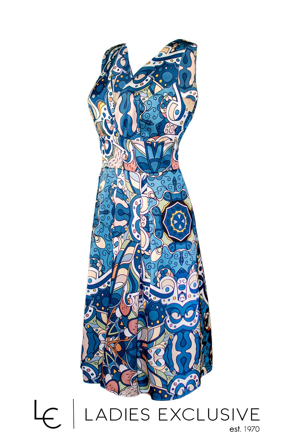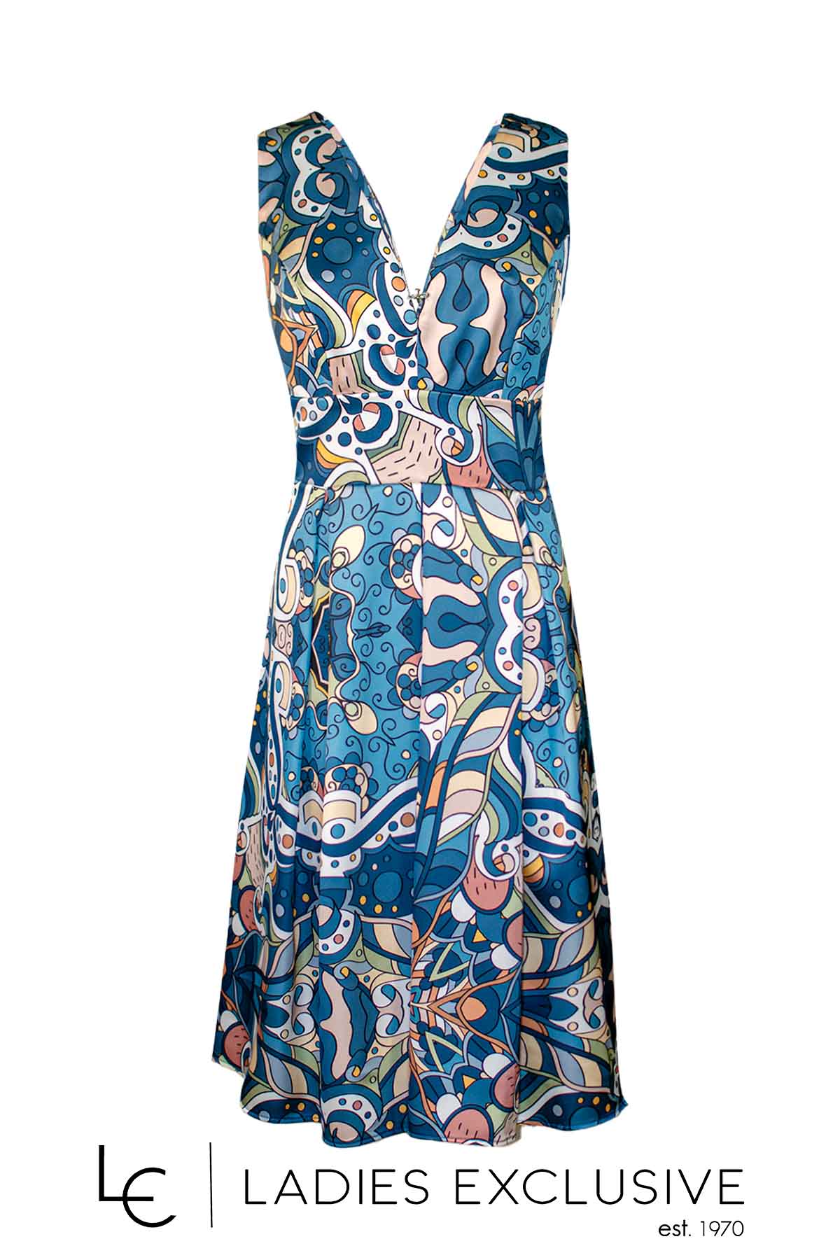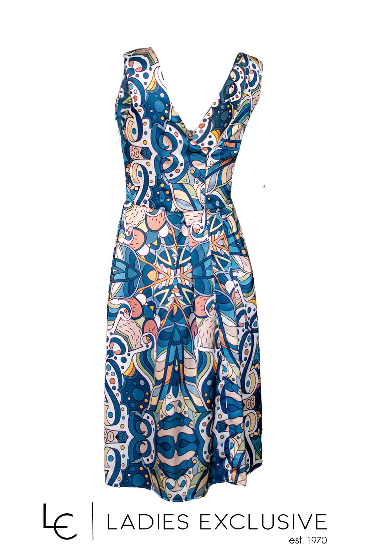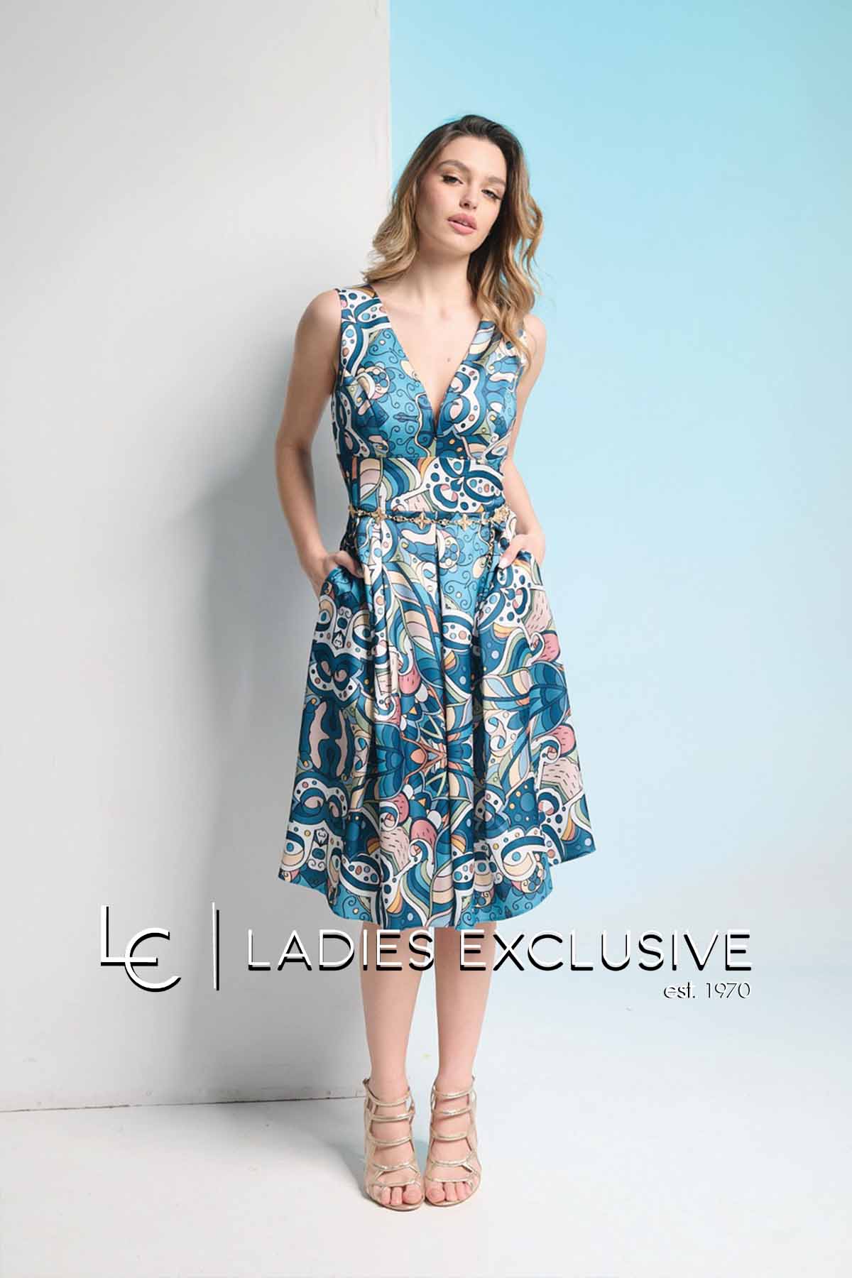 WEFTS Φόρεμα εμπριμέ μίντι αμάνικο σε A γραμμή, με μεγάλο άνοιγμα στο μπούστο και πίσω.