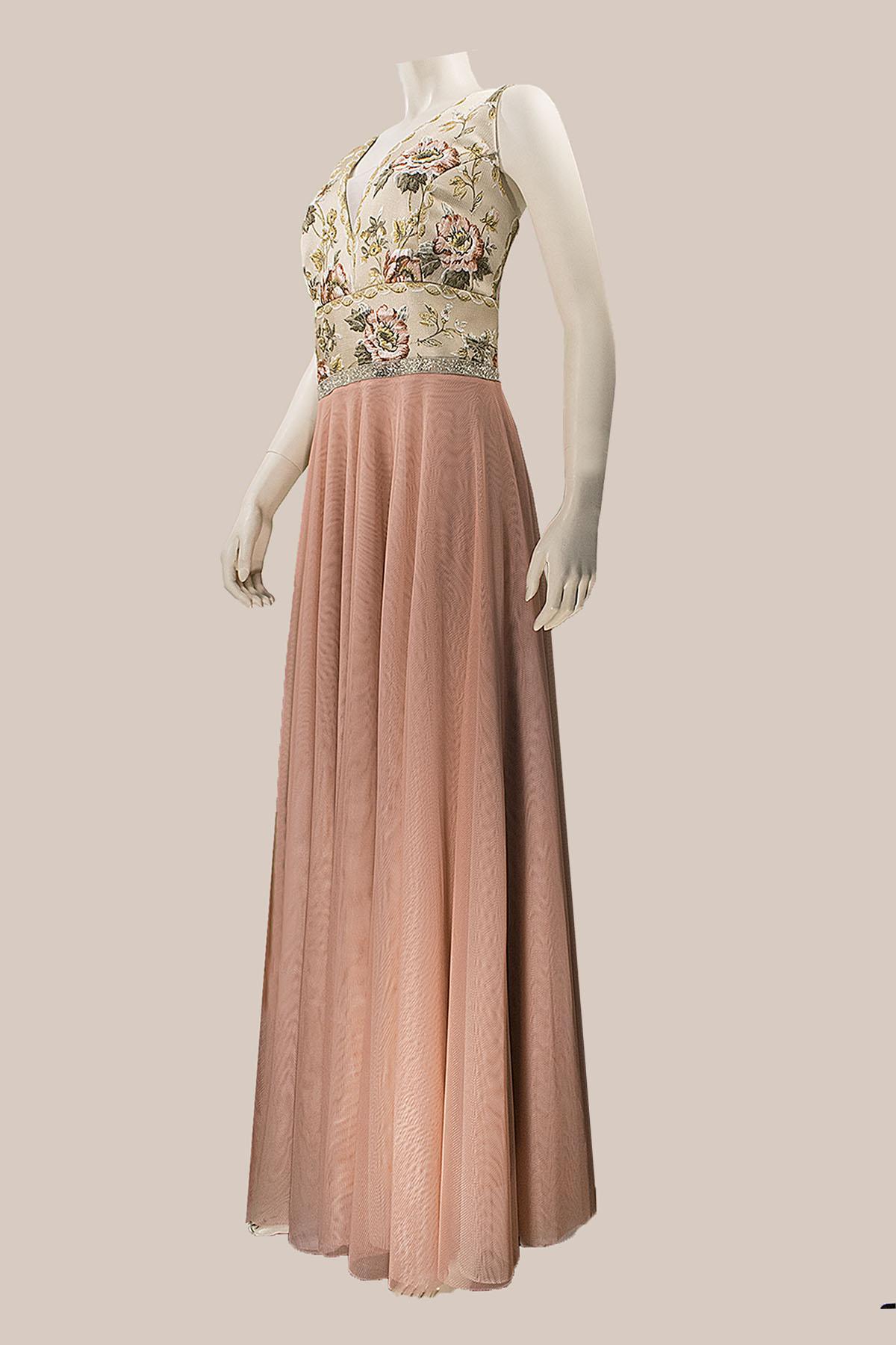 WOMEN'S STYLE Φόρεμα μάξι αμπιγέ με μπροκάρ μπούστο και φούστα με διπλό τούλι. Δυνατότητα προσθήκης μανικιών.