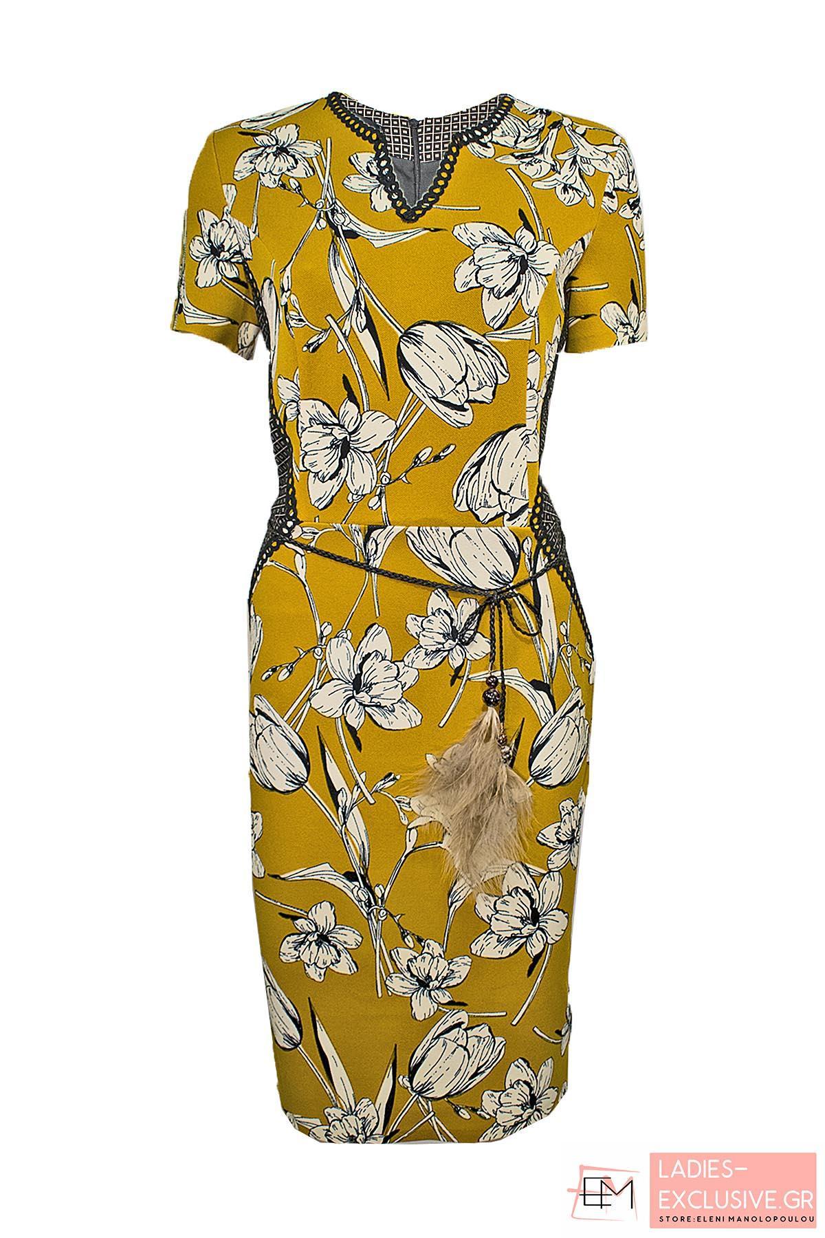 WOMEN'S STYLE Φόρεμα εμπριμέ midi με V λαιμό και κοντό μανίκι, με ζωνάκι στην μέση, φερμουάρ πίσω και ιδιαίτερο print. Ταιριάζει με ζακέτα κωδ: 7045-120.