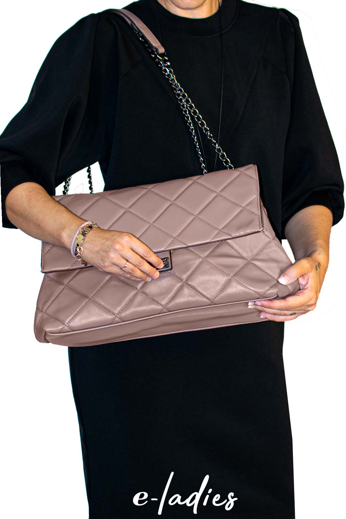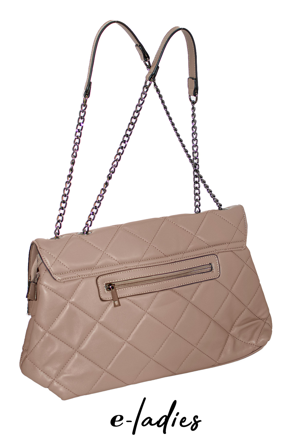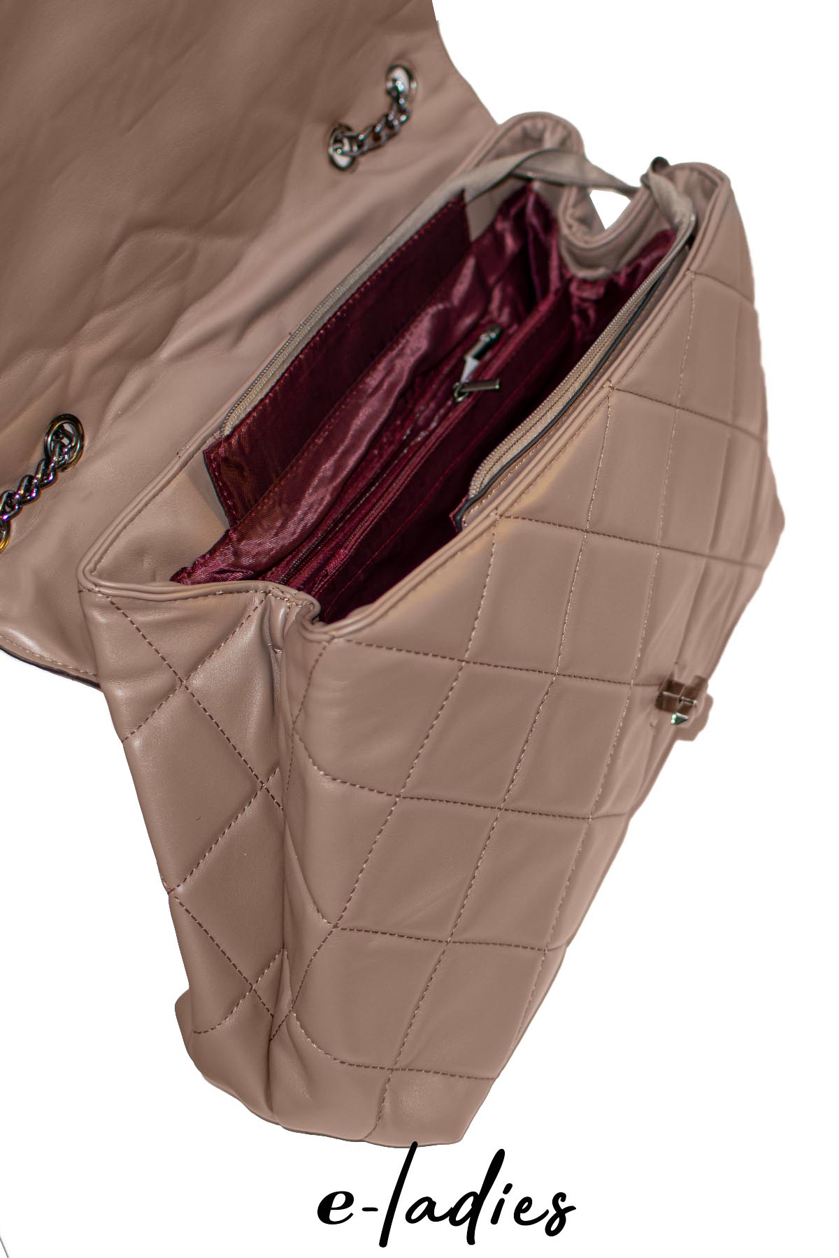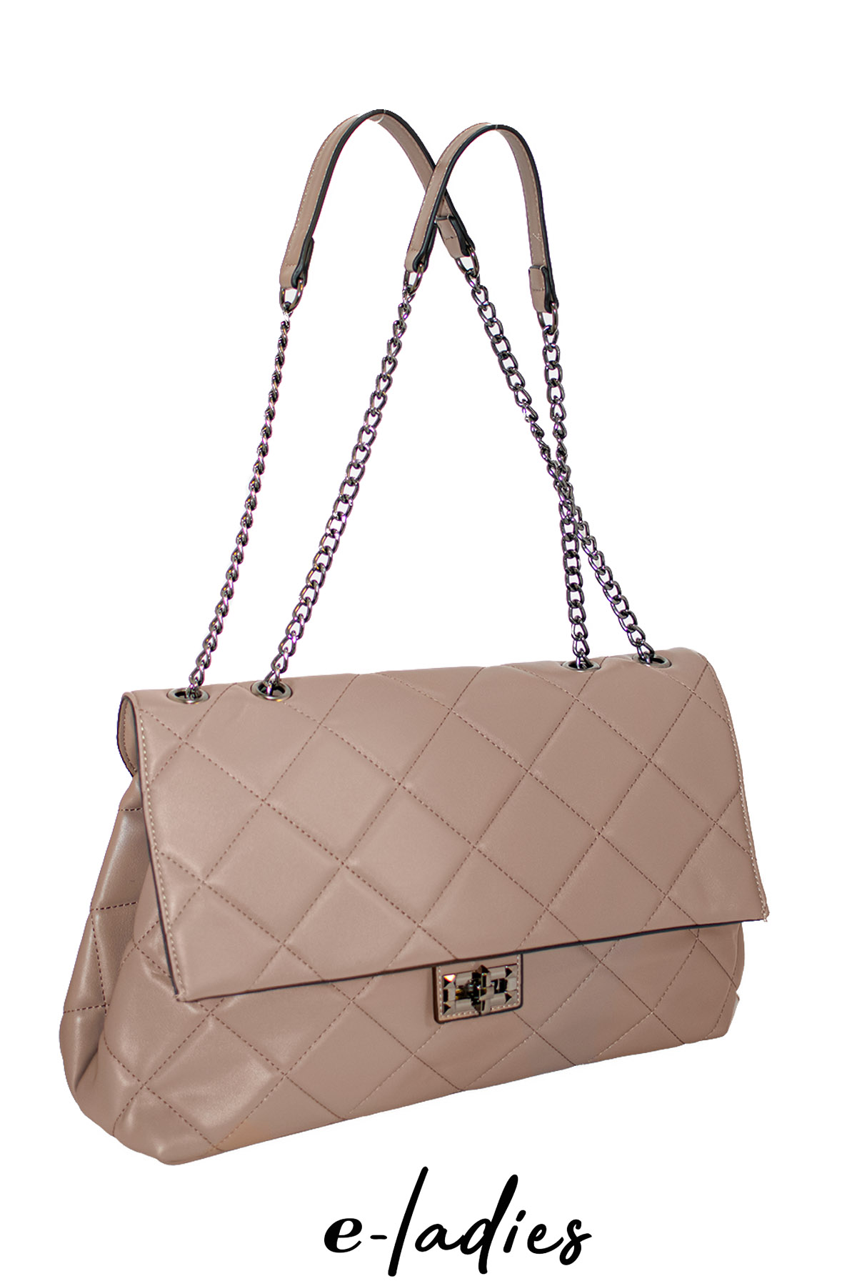 Τσάντα μπεζ ώμου καπιτονέ με αλυσίδα και ιδιαίτερο κλείσιμο εξωτερικά. Εσωτερικά έχει φερμουάρ. Διαστάσεις: 41X23. Σύνθεση: Οικολογικό δέρμα