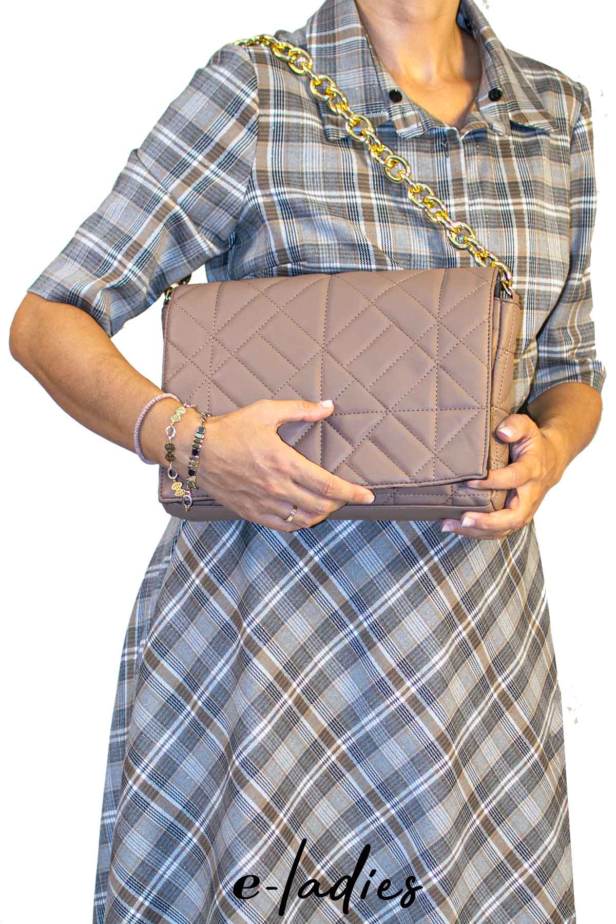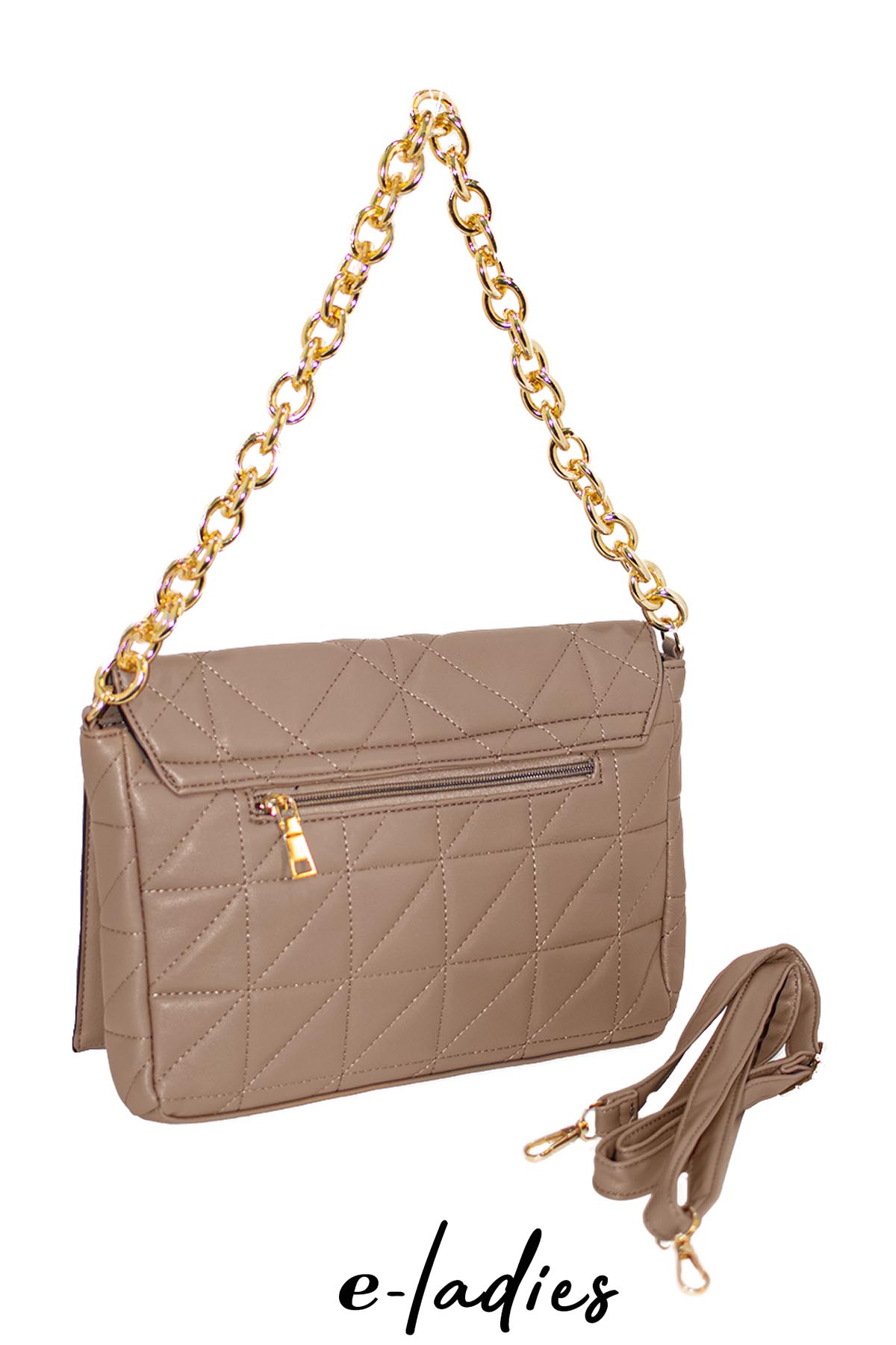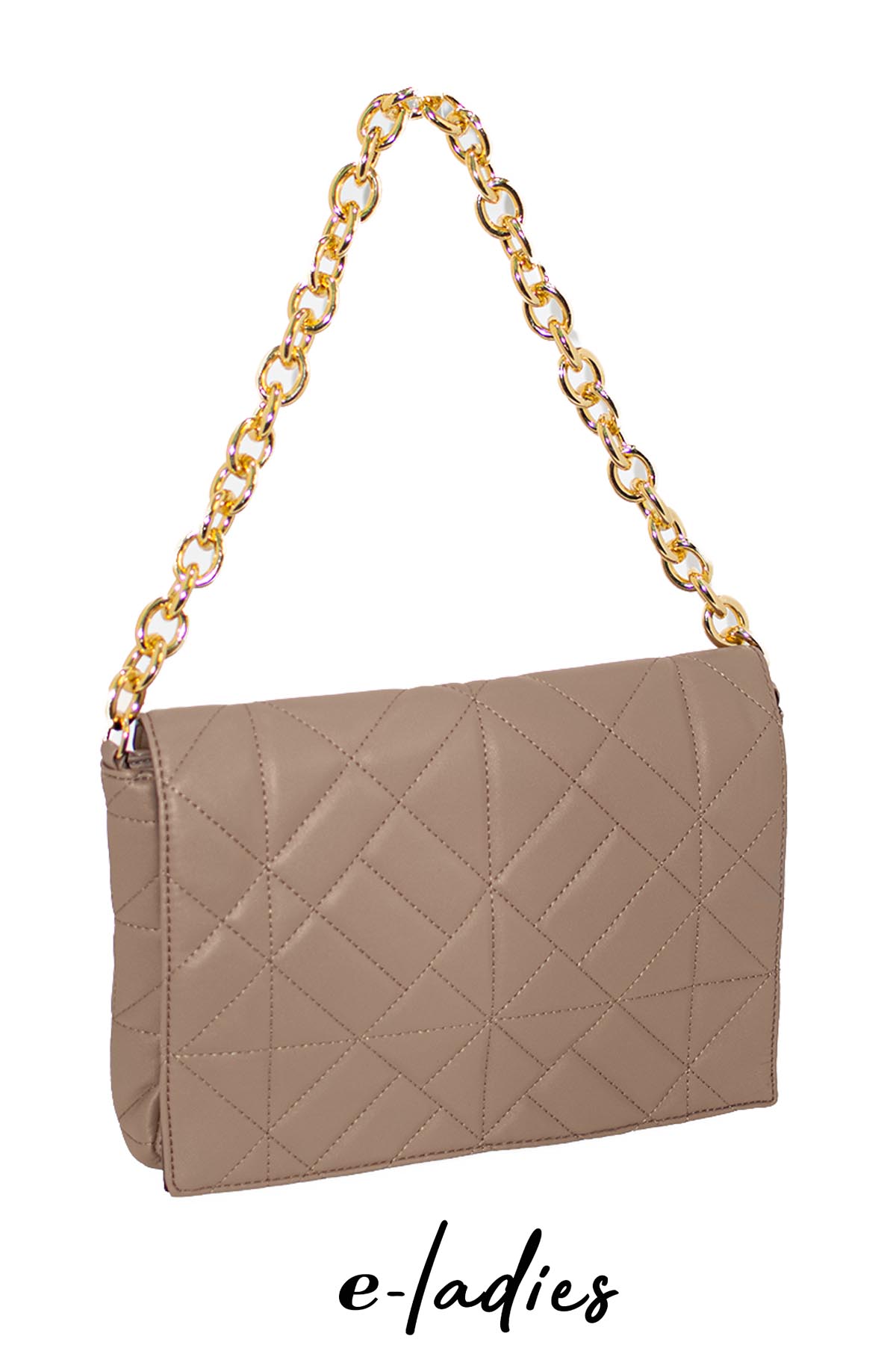 Τσάντα μπεζ ώμου καπιτονέ με αλυσίδα και κλείσιμο με μαγνήτη. Εσωτερικά διαθέτει φερμουάρ και επιπλέον μακρύτερο λουρί. Διαστάσεις: 29X24. Σύνθεση: Οικολογικό δέρμα