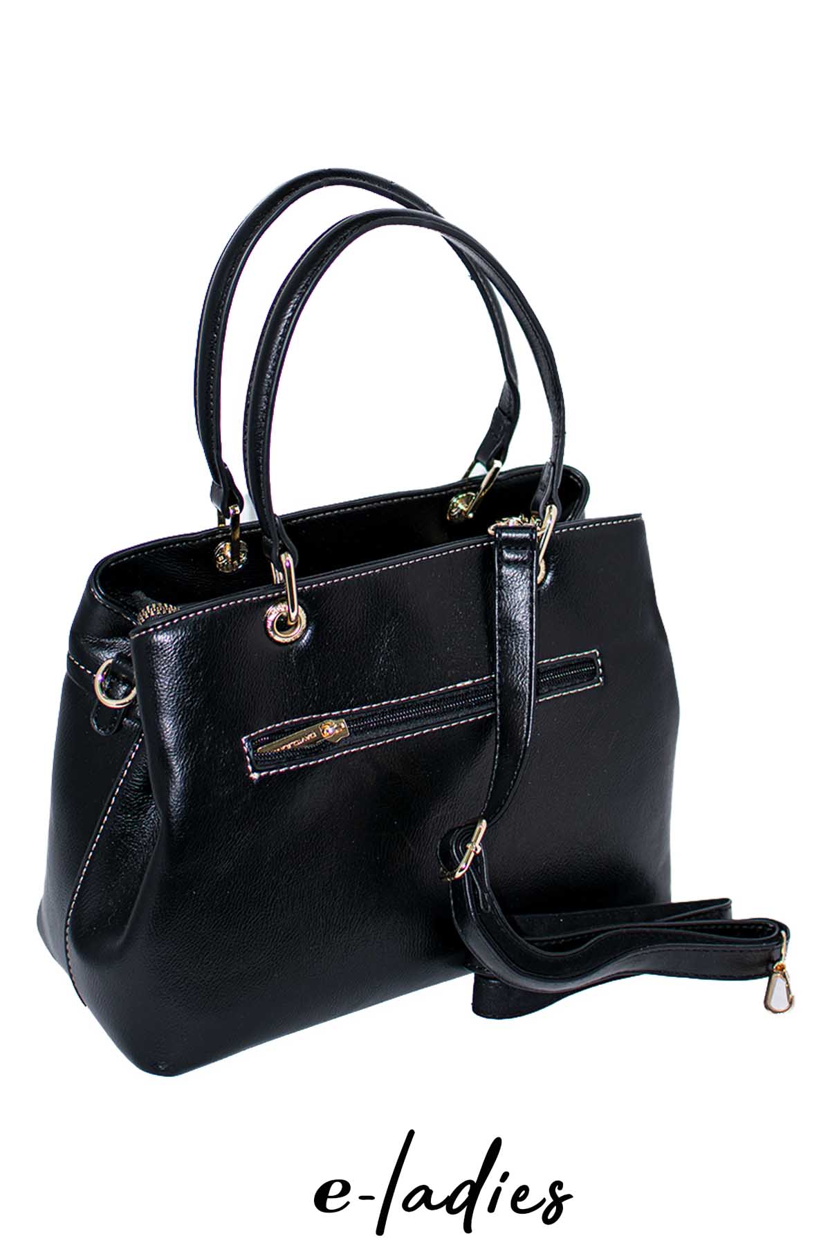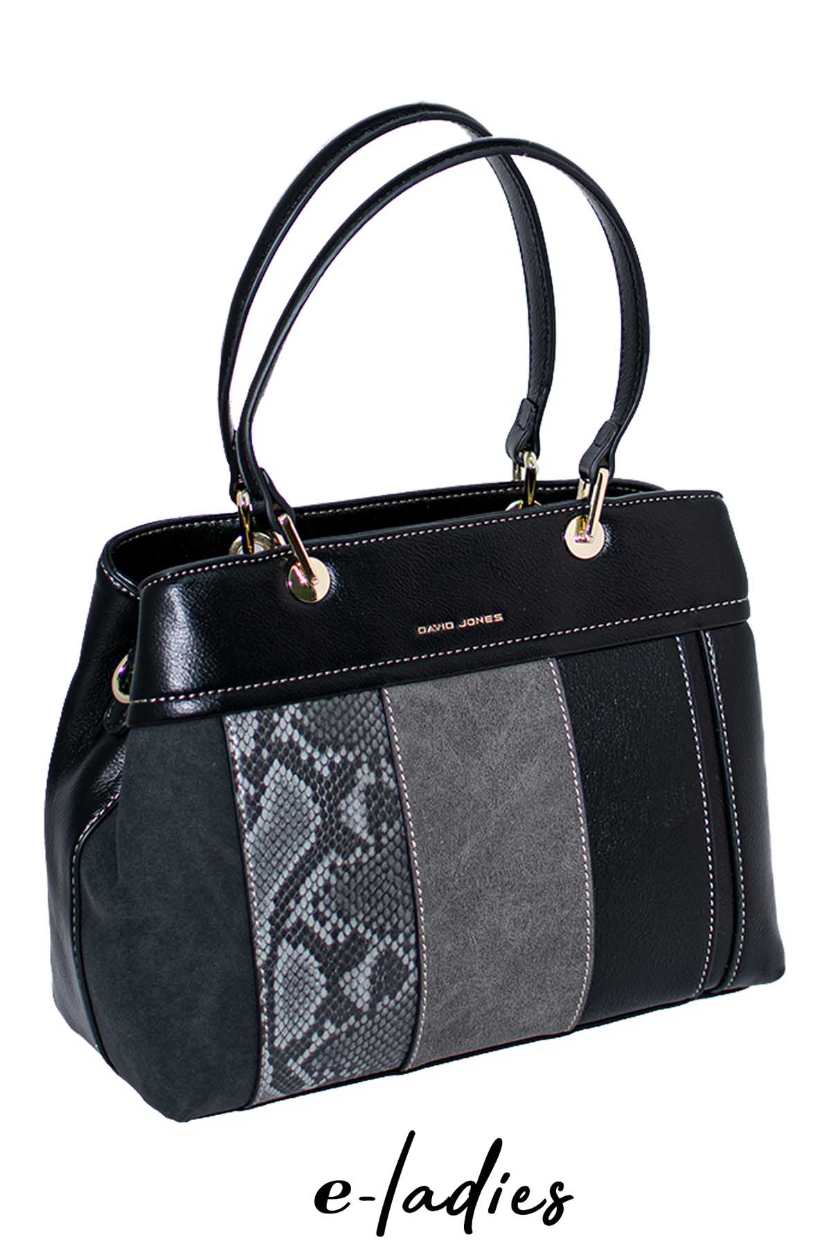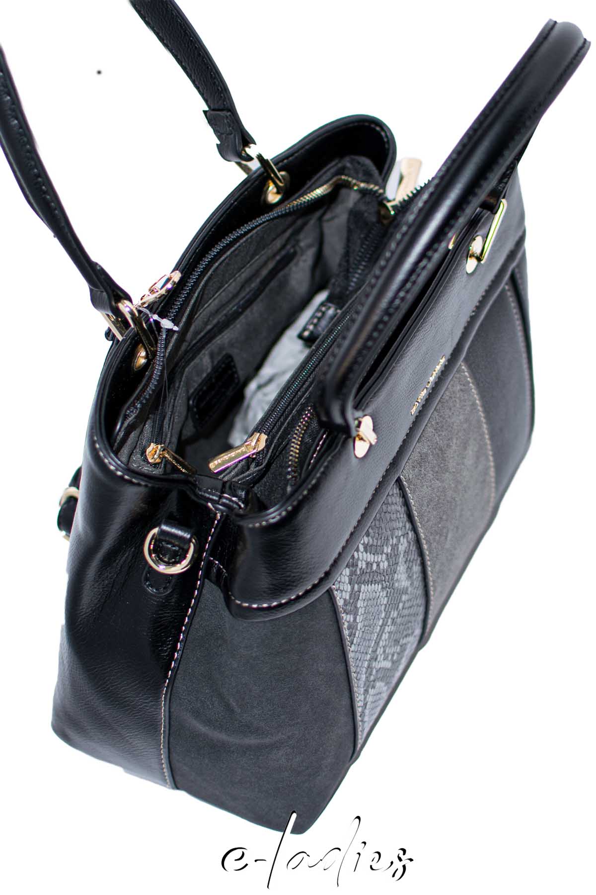 Τσάντα χειρός γκρι με τριπλό μοτίβο και φερμουάρ. Έχει δυο χώρους εσωτερικά και επιπλέον μακρύτερο λουρί. Διαστάσεις: 22X29. Σύνθεση: Οικολογικό δέρμα