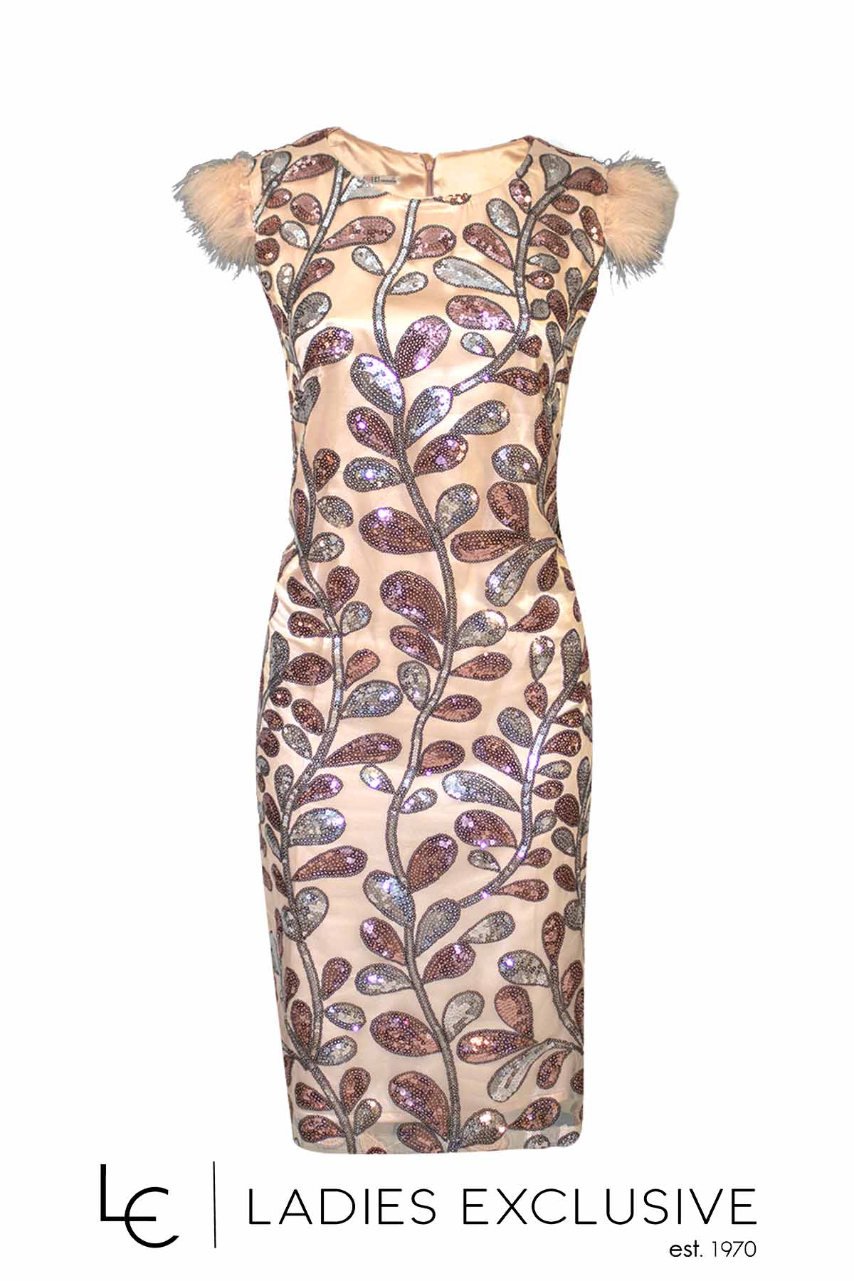 EFFECT Φόρεμα αμάνικο βραδινό σε ίσια γραμμή με πολύχρωμες παγιέτες και πούπουλο στο τελείωμα των ώμων.