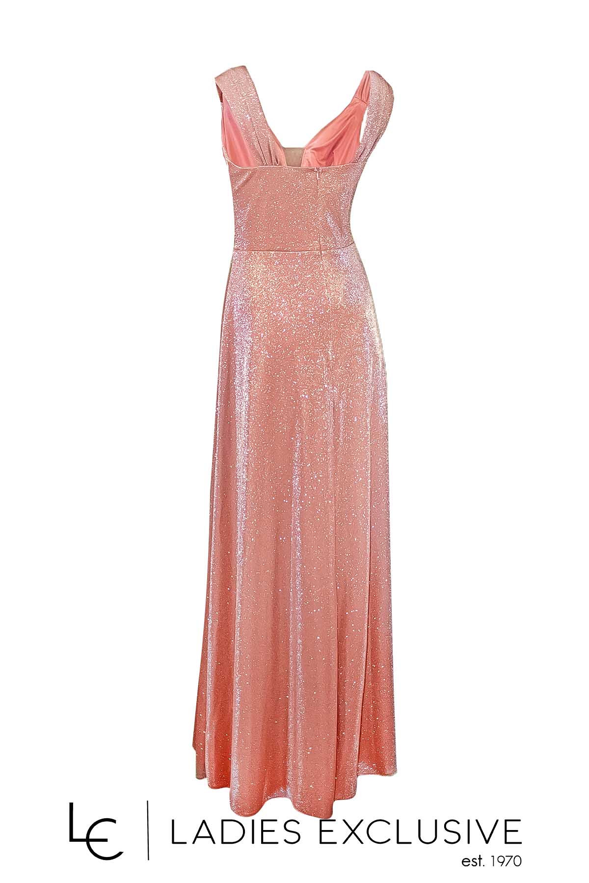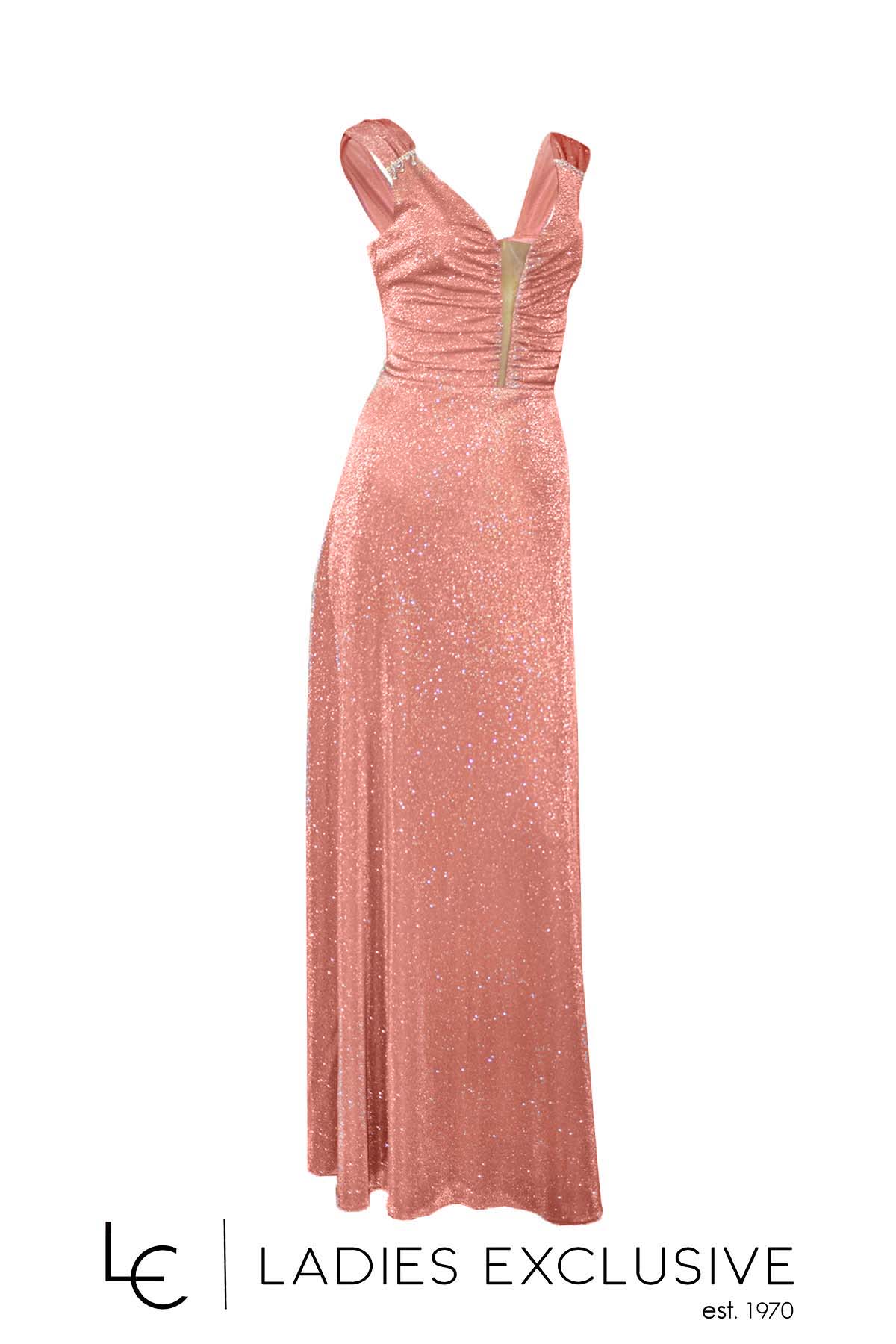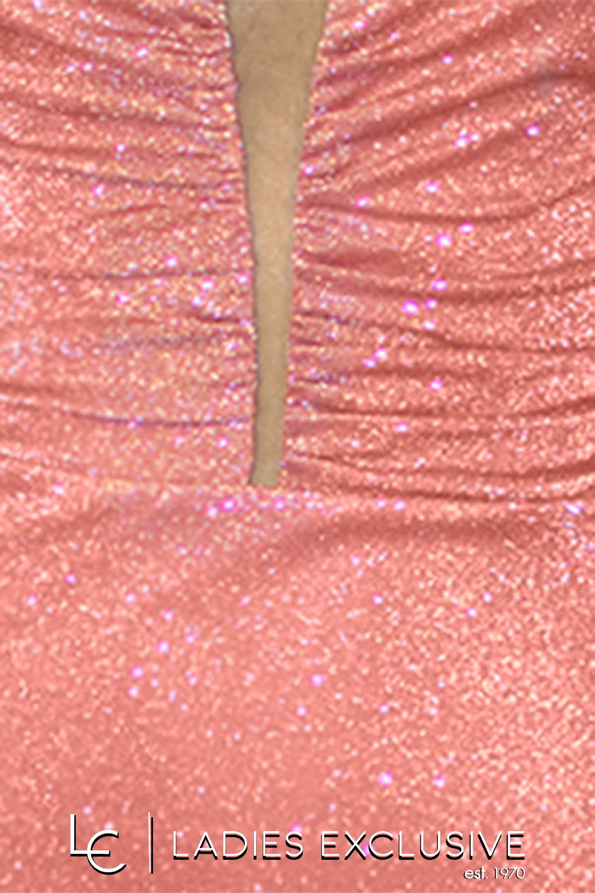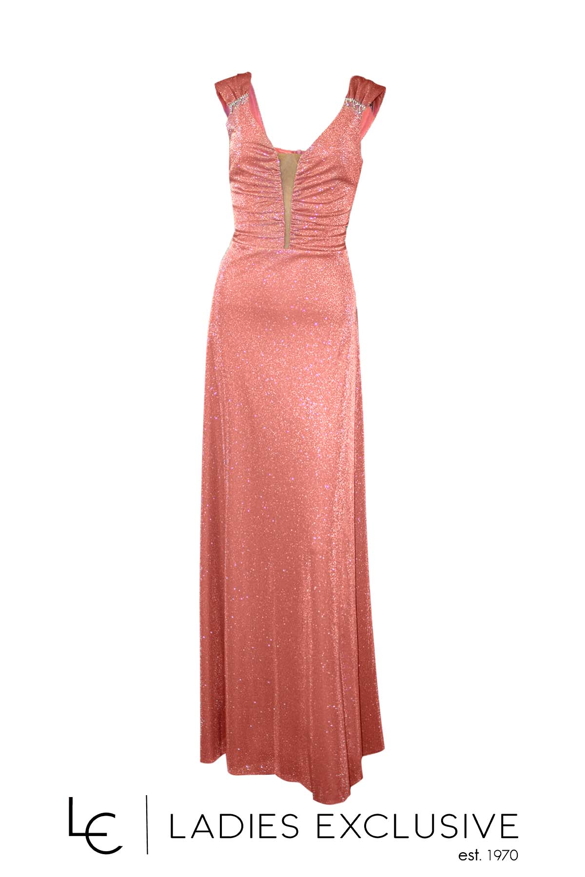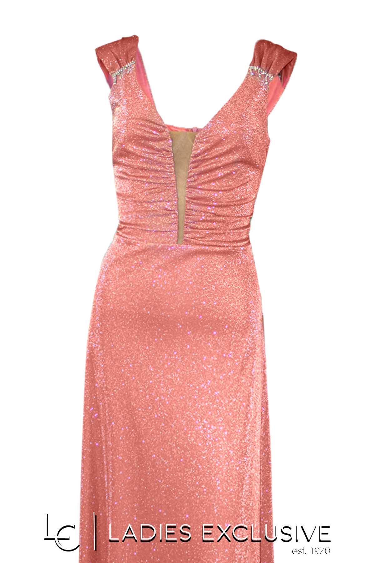 EFFECT Φόρεμα ροζ βραδινό μακρύ αμάνικο, με γκλίτερ στην ύφανση και ιδιαίτερο κόσμημα στις ράντες. Έχει επιπλέον ύφασμα για κάλυψη της διαφάνειας στο μπροστινό μέρος.