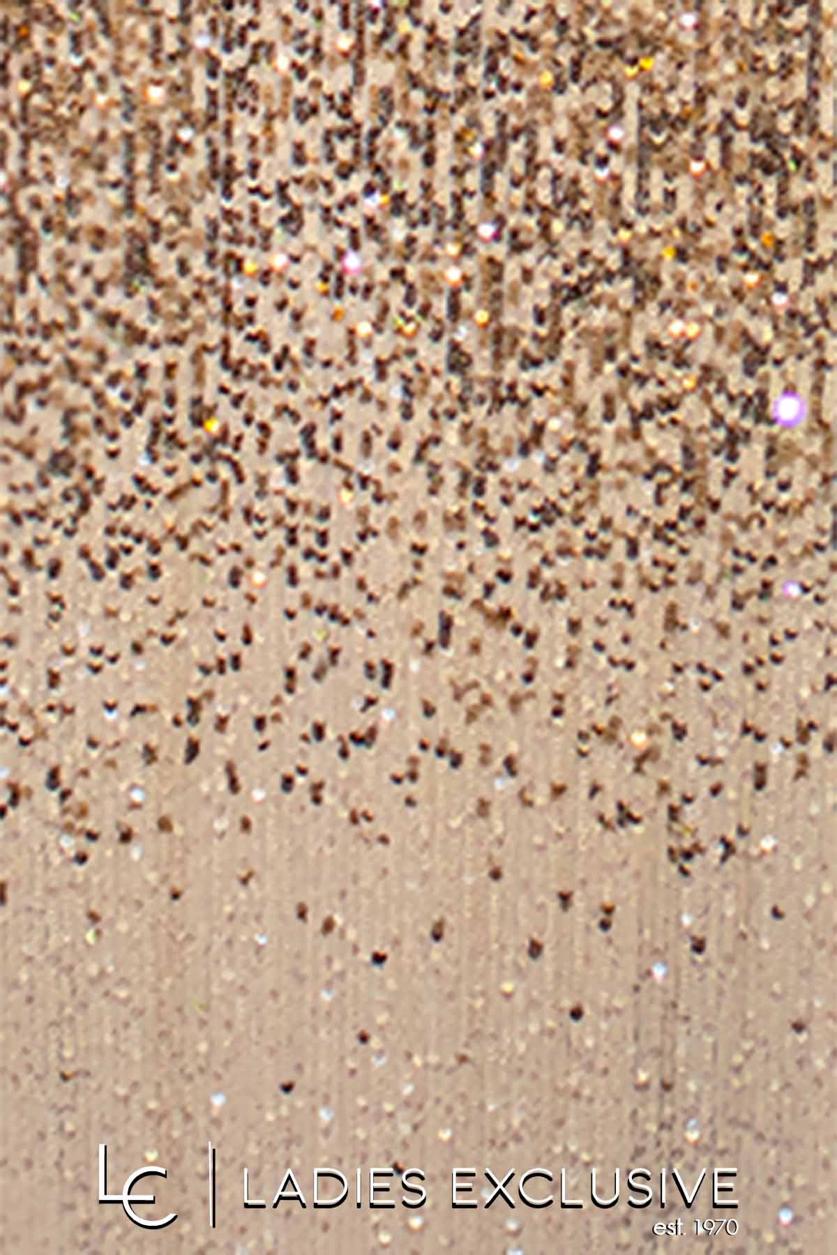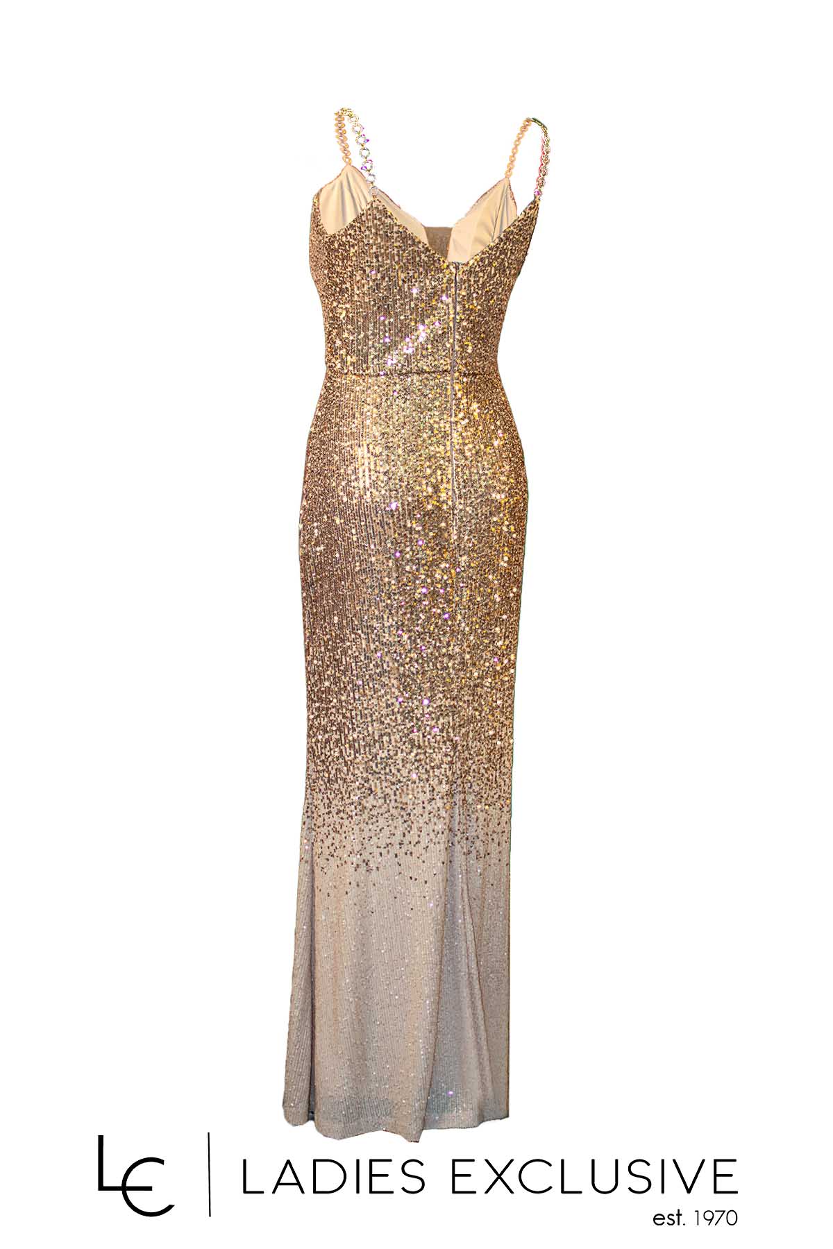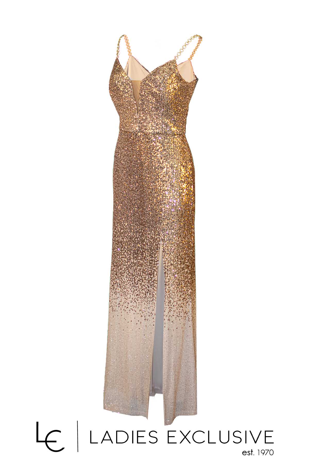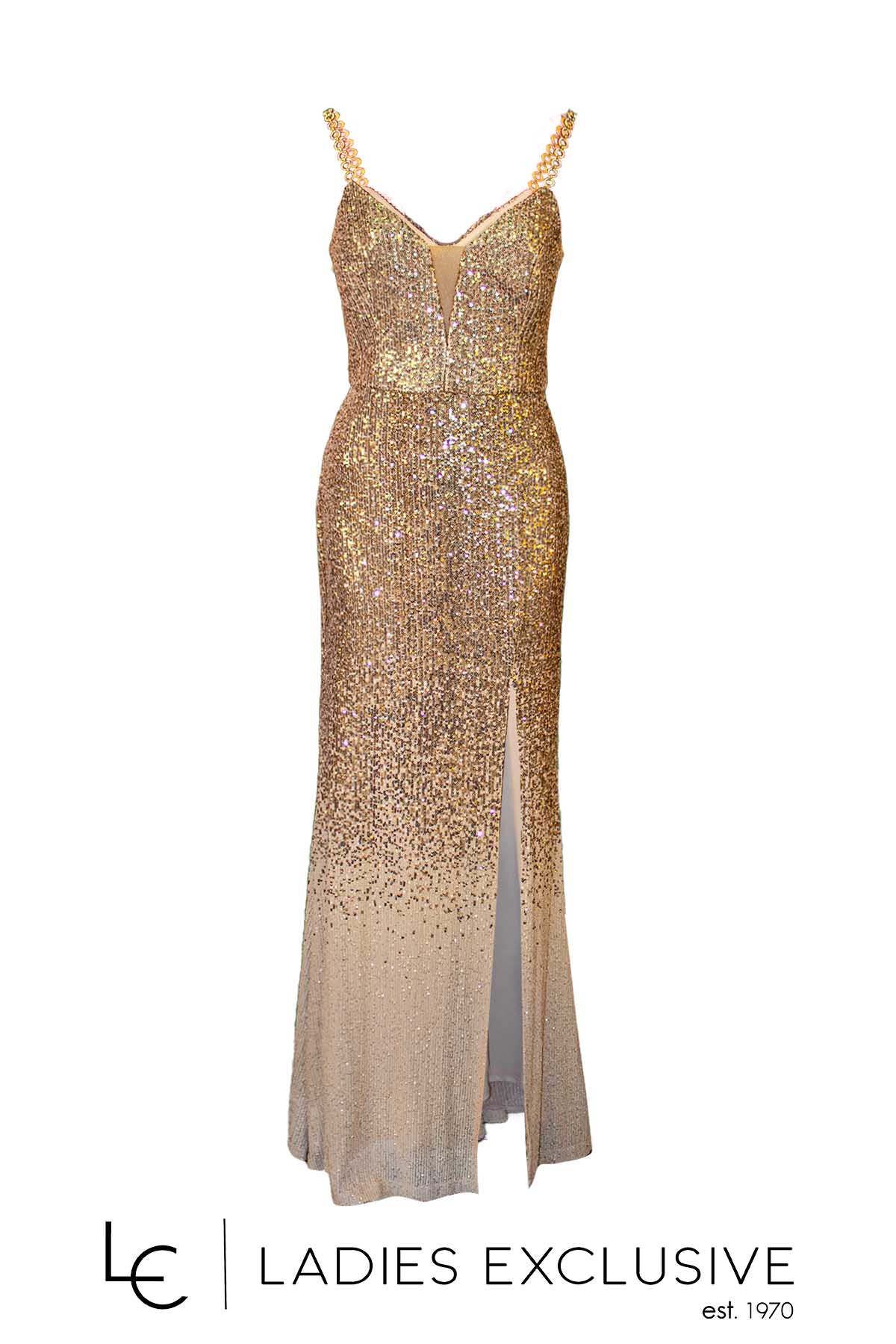 EFFECT Φόρεμα χρυσό βραδινό μακρύ ντεγκραντέ, κεντημένο με παγιέτες και μεγάλο άνοιγμα στο κάτω μέρος. Στο μπούστο έχει διακτιρική διαφάνεια και οι ράντες είναι στρογγυλή αλυσίδα με στρας.