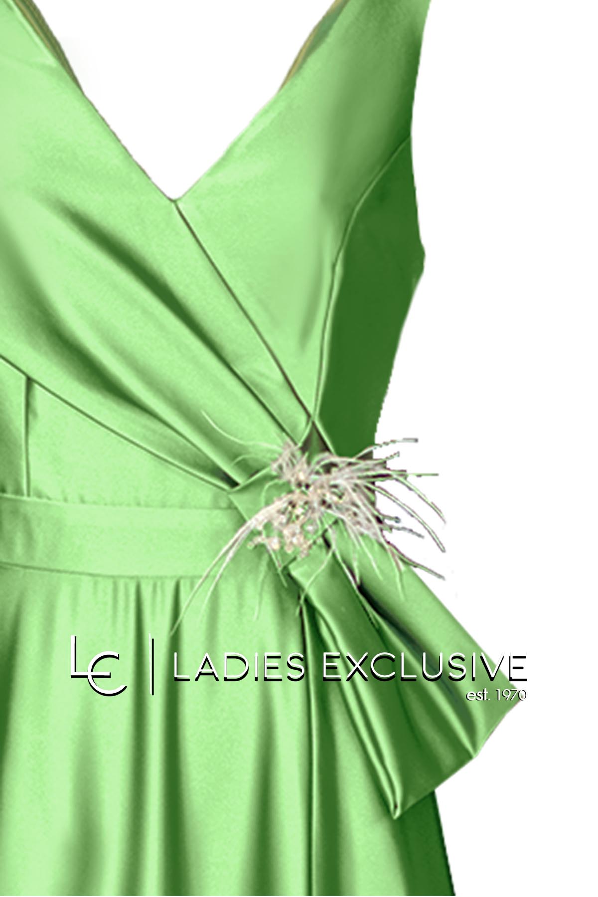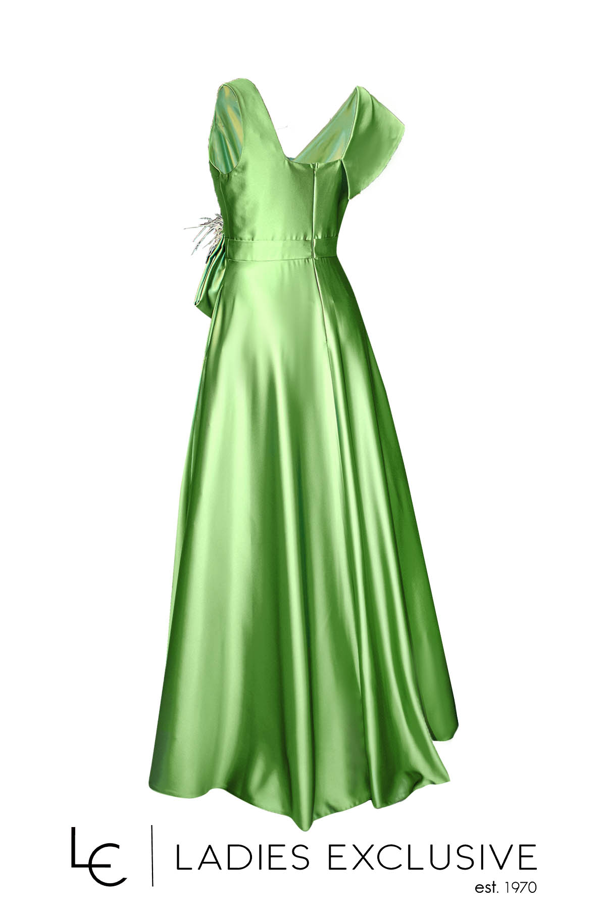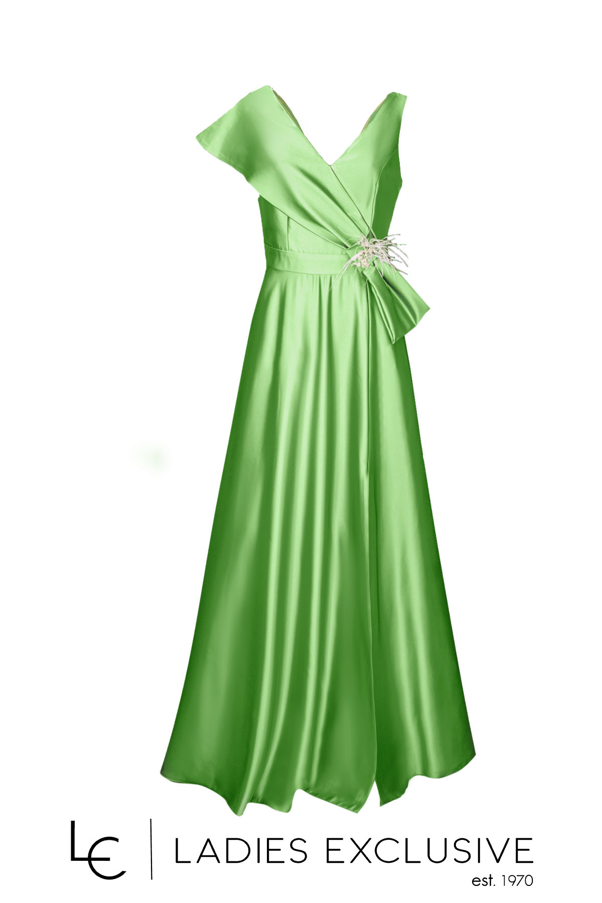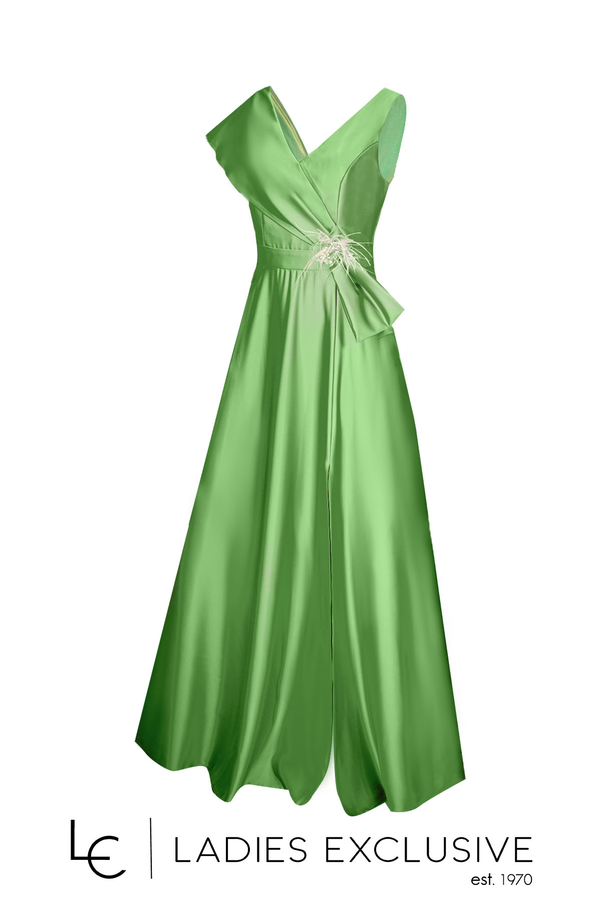 EFFECT Φόρεμα πράσινο βραδινό μακρύ σατέν αμάνικο με άνοιγμα v και καρφίτσα με φτερά και στρας. Έχει μεγάλο άνοιγμα στο κάτω μέρος και διαθέτει ύφασμα πρόσθετο για τοποθέτηση μανικιού.