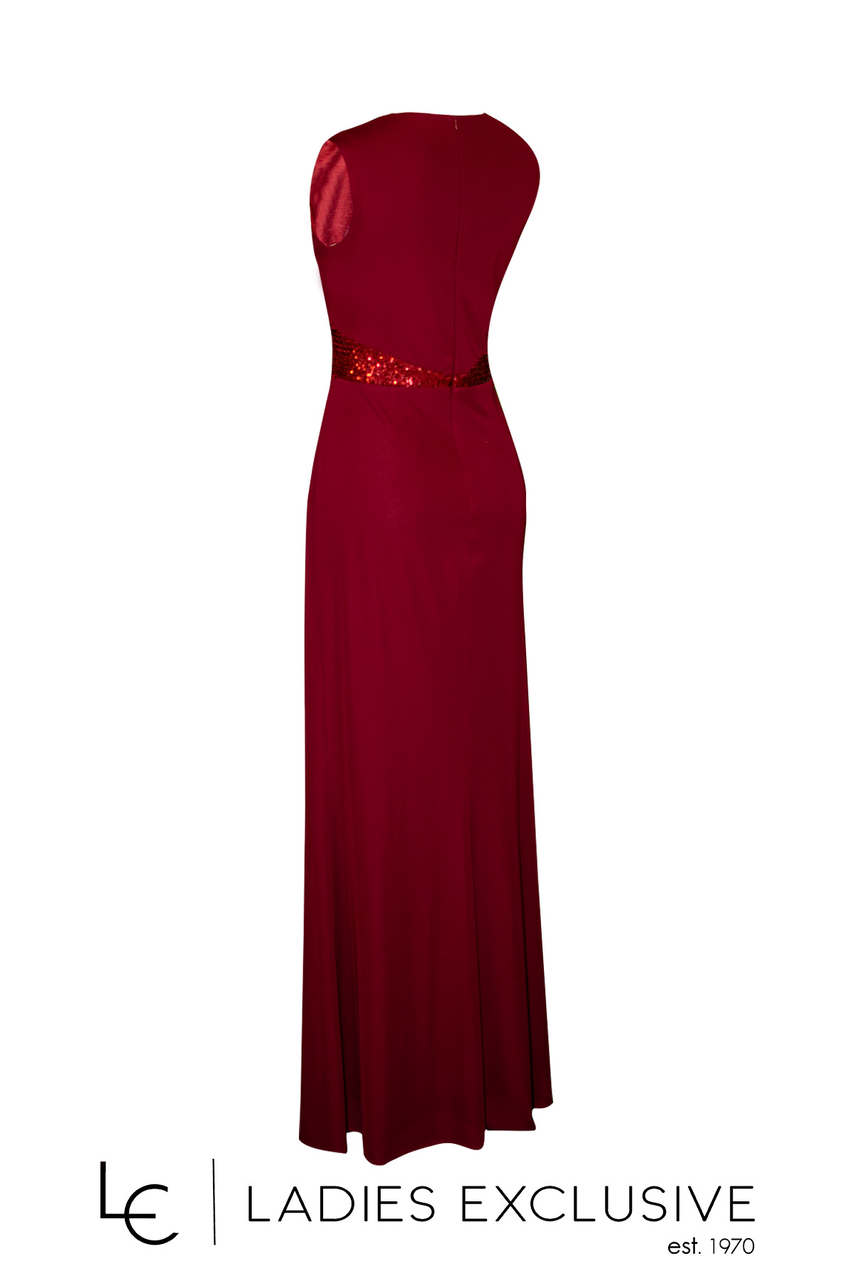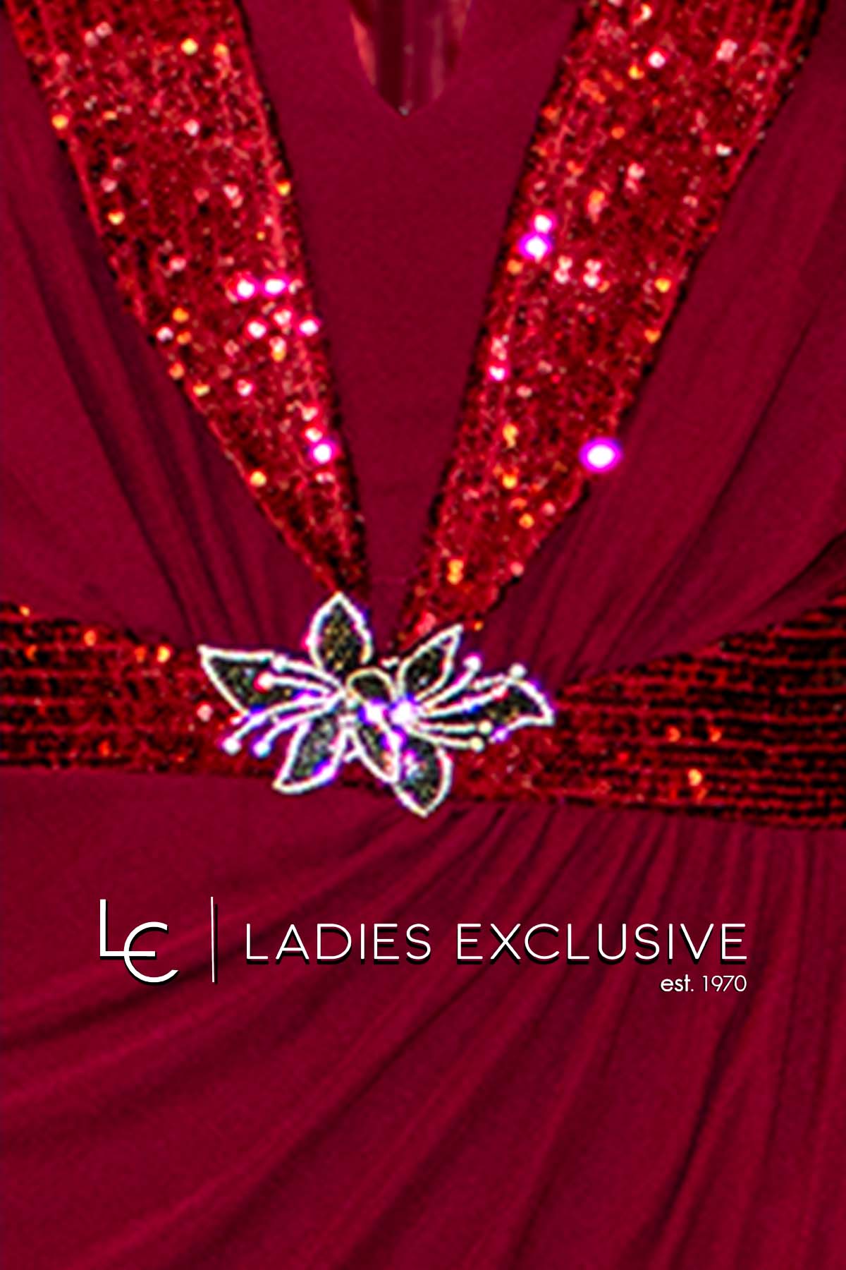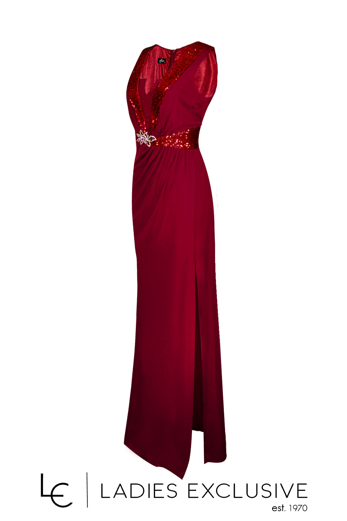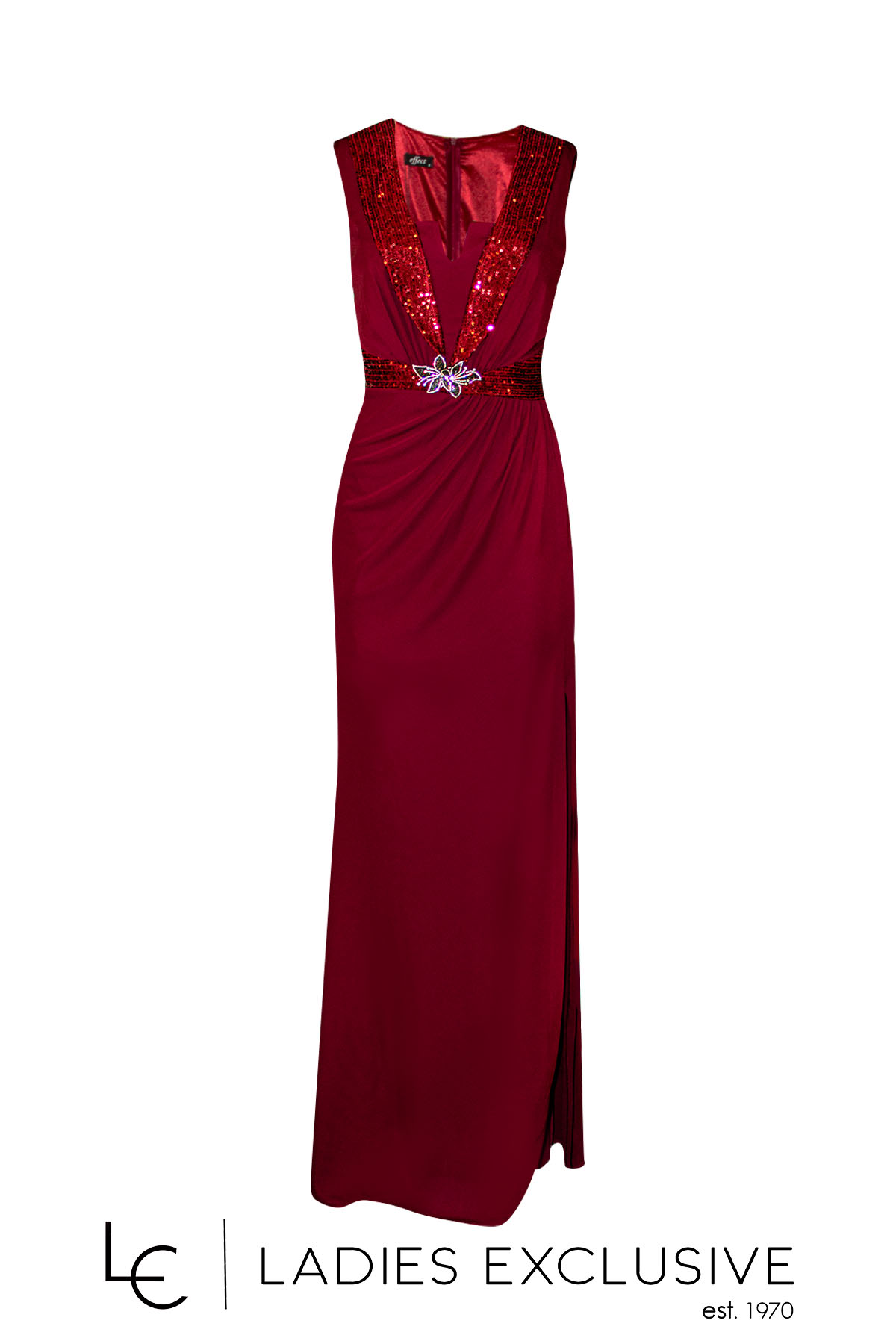 EFFECT Φόρεμα μπορντώ βραδινό μακρύ αμάνικο, με παγιέτα στο μπούστο και στη μέση και καρφίτσα μπουτουνιέρα με στρας. Το ύφασμα είναι ελαστικό και στο κάτω μέρος έχει μεγάλο σκίσιμο.