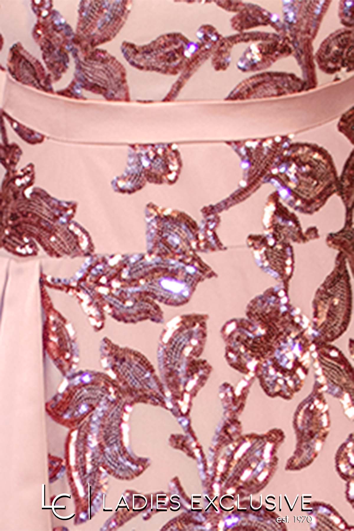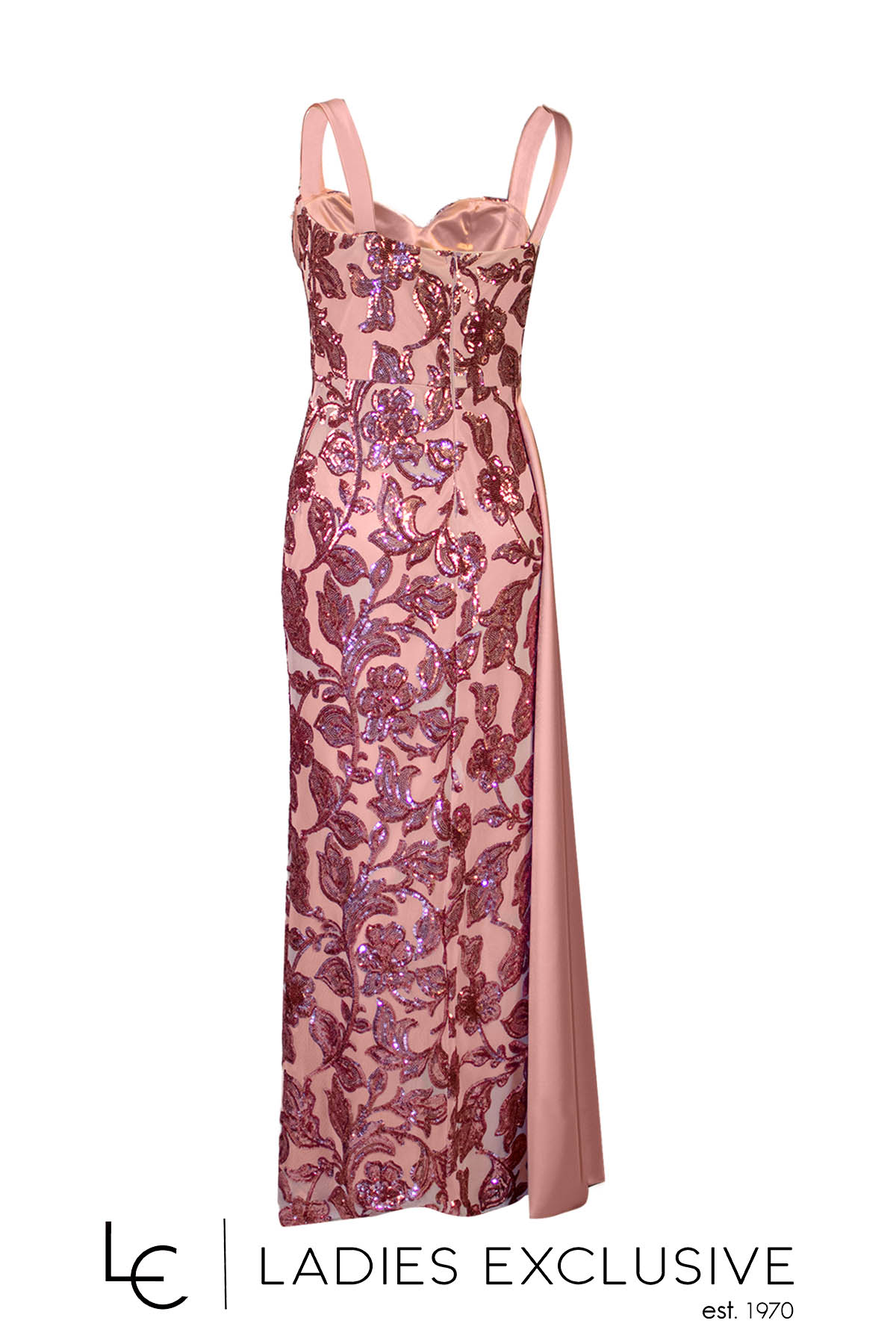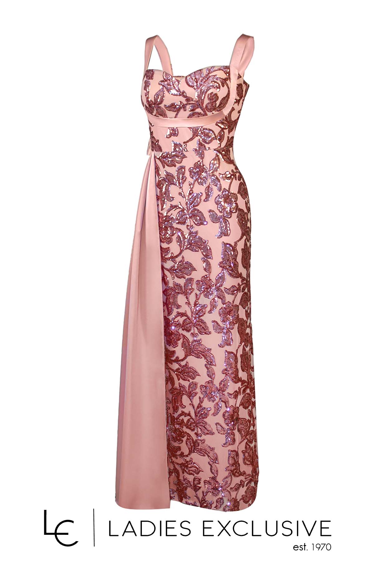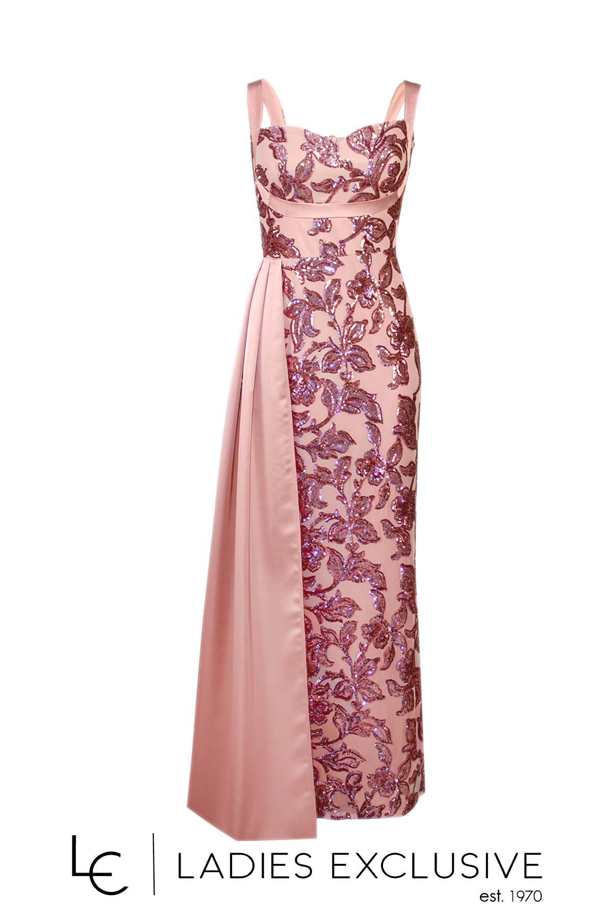 EFFECT Φόρεμα ροζ βραδινό μακρύ, με λεπτή ράντα, κεντημένο με στρας και αέρινη σατέν ουρά στη μια πλευρά.
