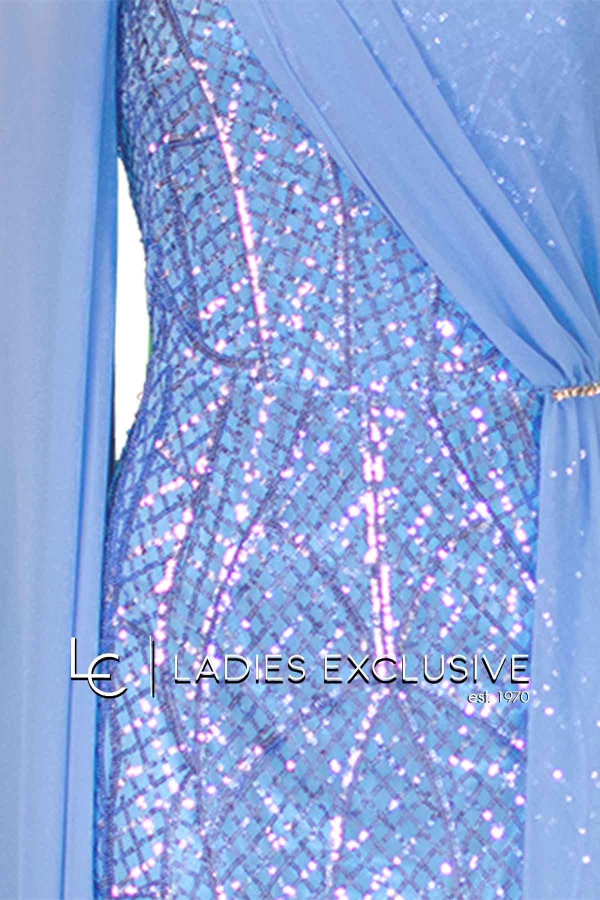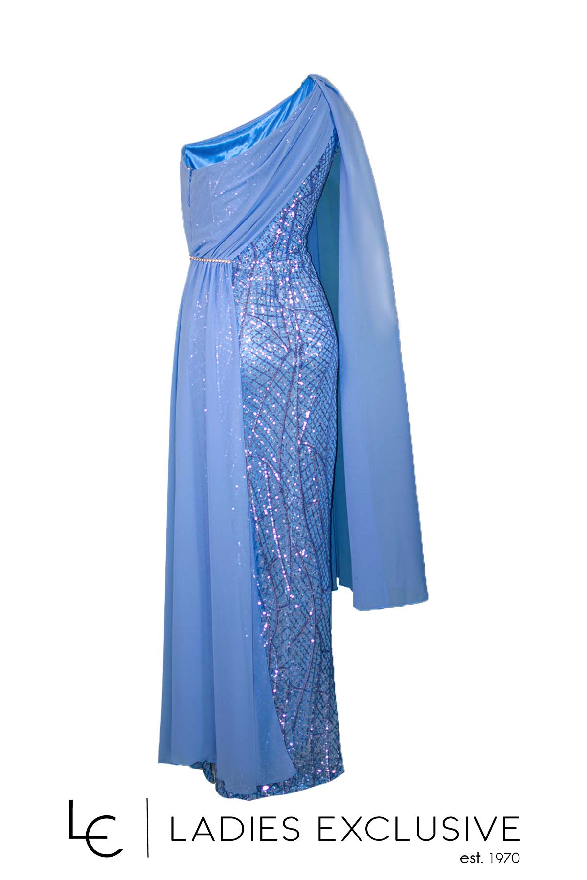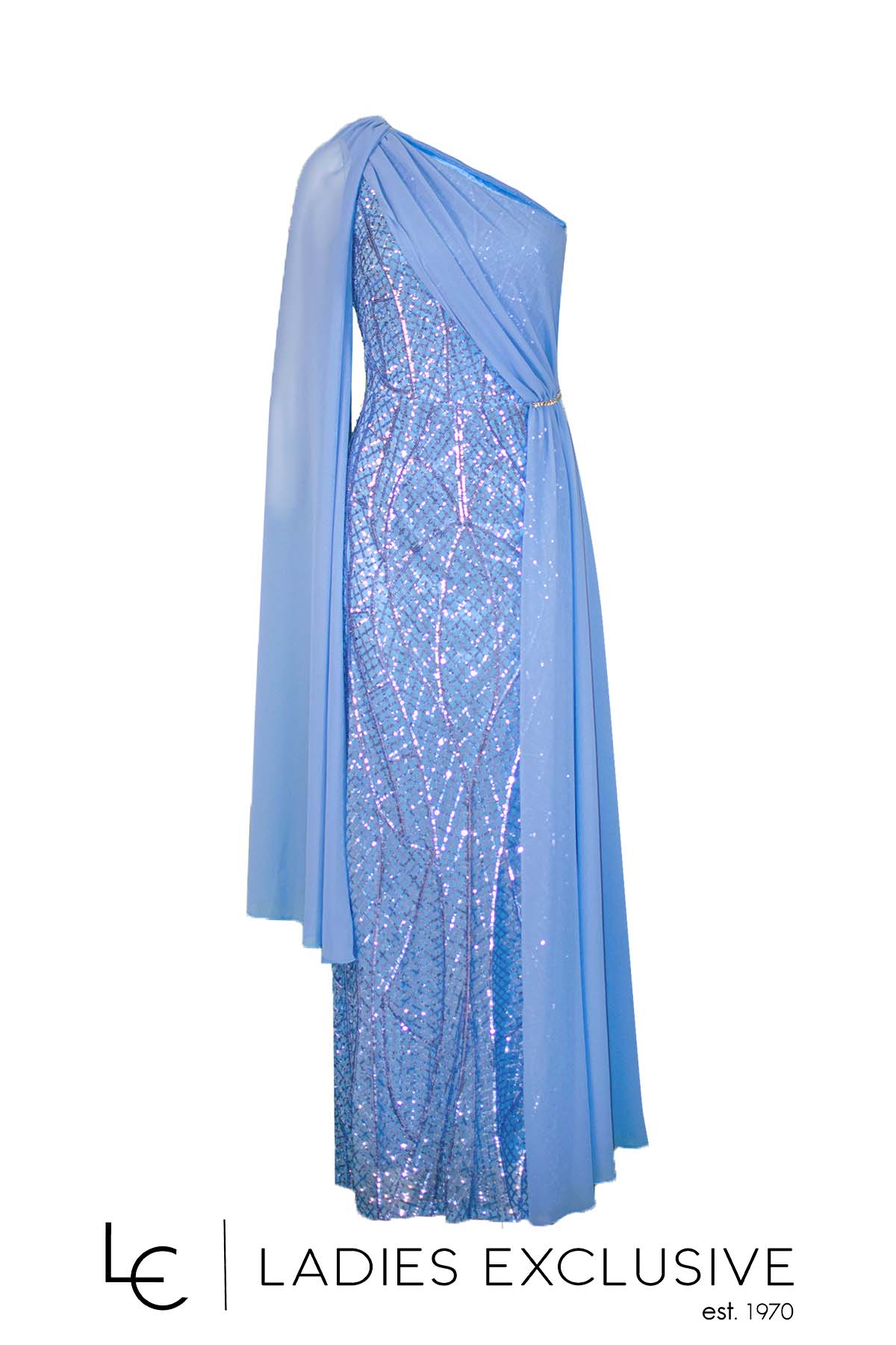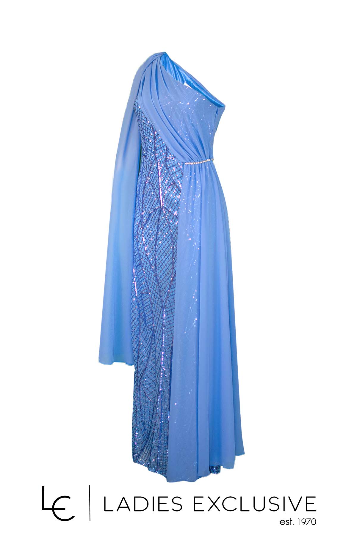 EFFECT Φόρεμα σιέλ βραδινό μακρύ κεντημένο με παγιέτες, με έναν ώμο και μπέρτα από μουσελίνα. Στο μπροστινό μέρος έχει ντραπέ από μουσελίνα που πιάνει με στρας και πέφτει ανάλφρα μέχρι κάτω.