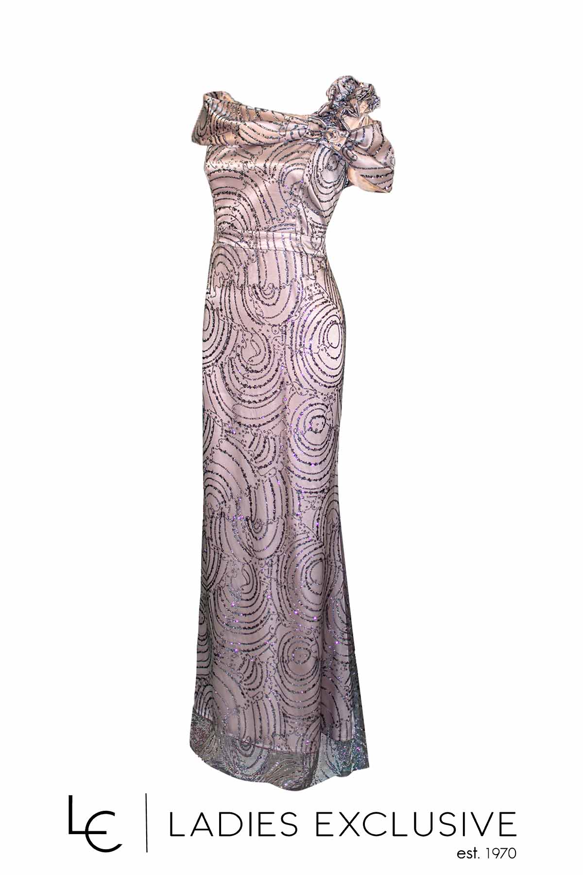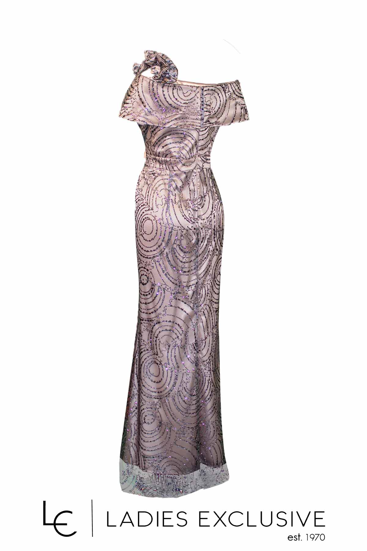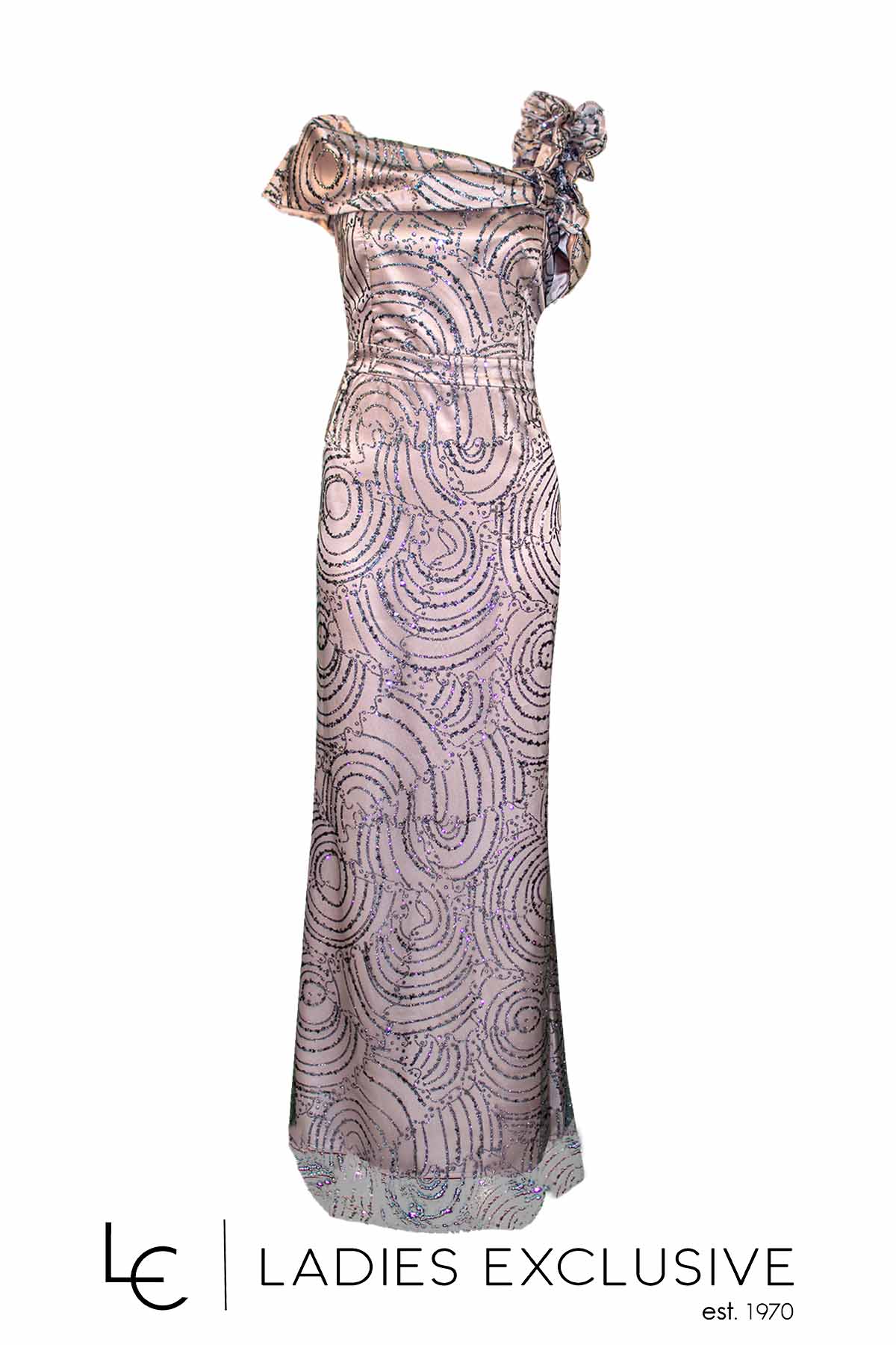 EFFECT Φόρεμα λιλά βραδινό μακρύ, με κεντήματα από γκλίτερ και ιδιαίτερο φραμπαλά στον έναν ώμο, που καταλήγει σε μπουτουνιέρα. Έχει επιπλέον ύφασμα για τοποθέτηση τιράντας.