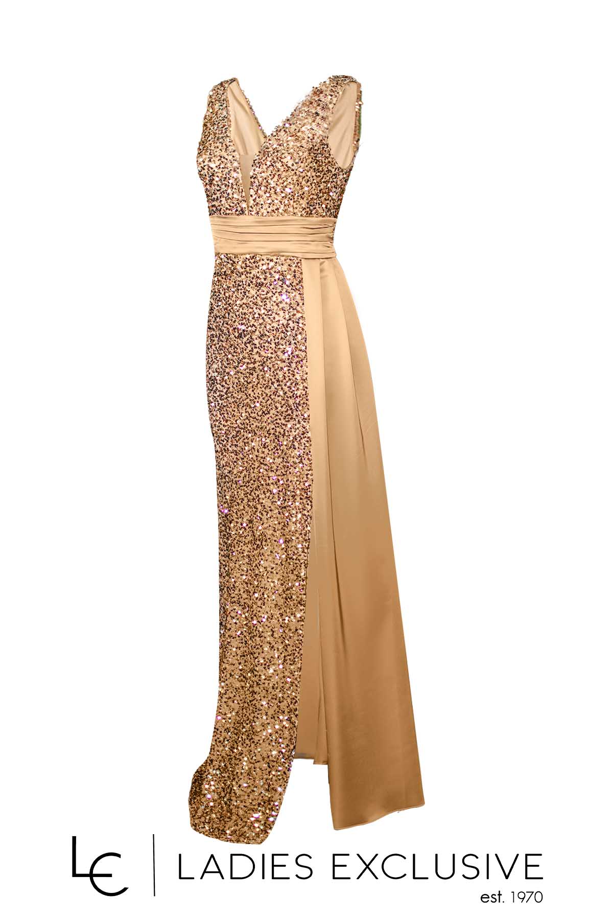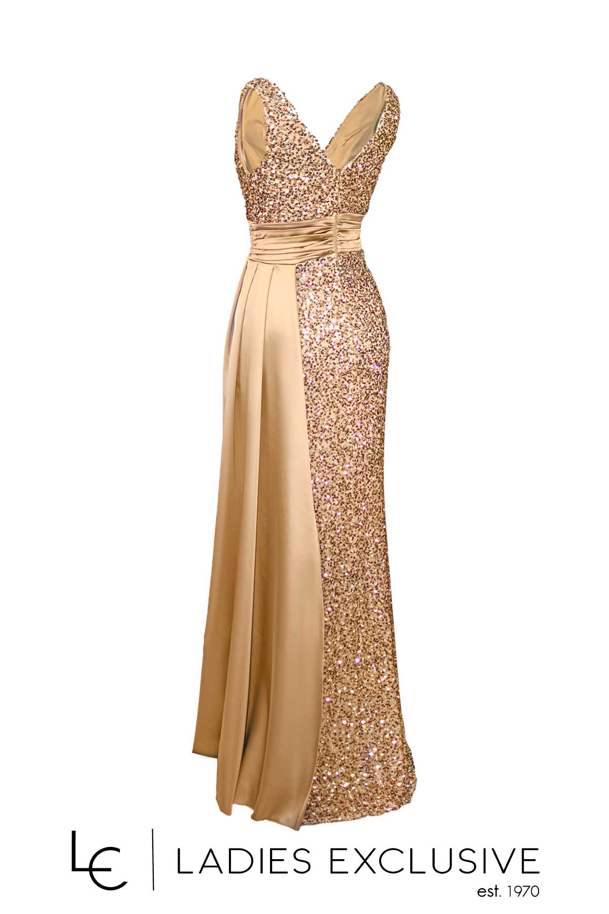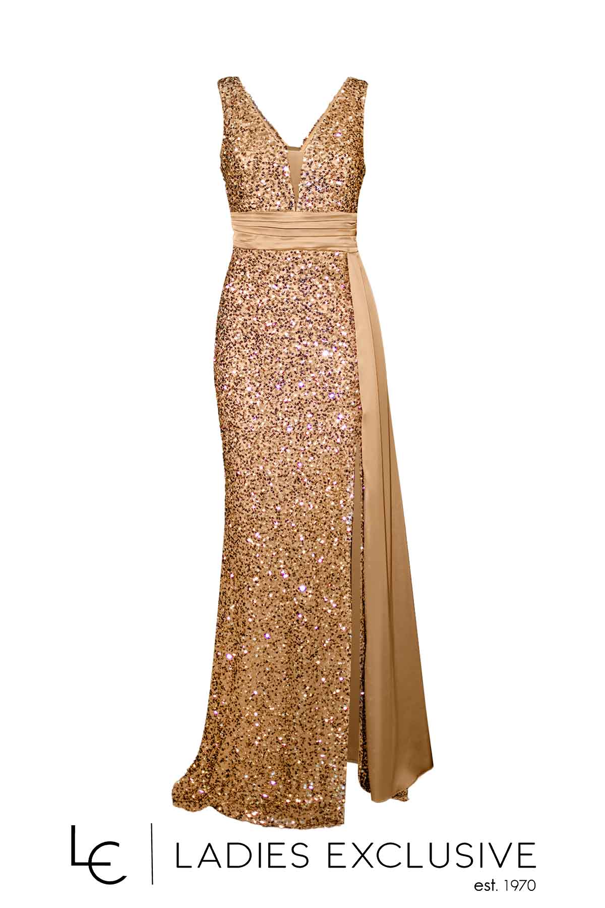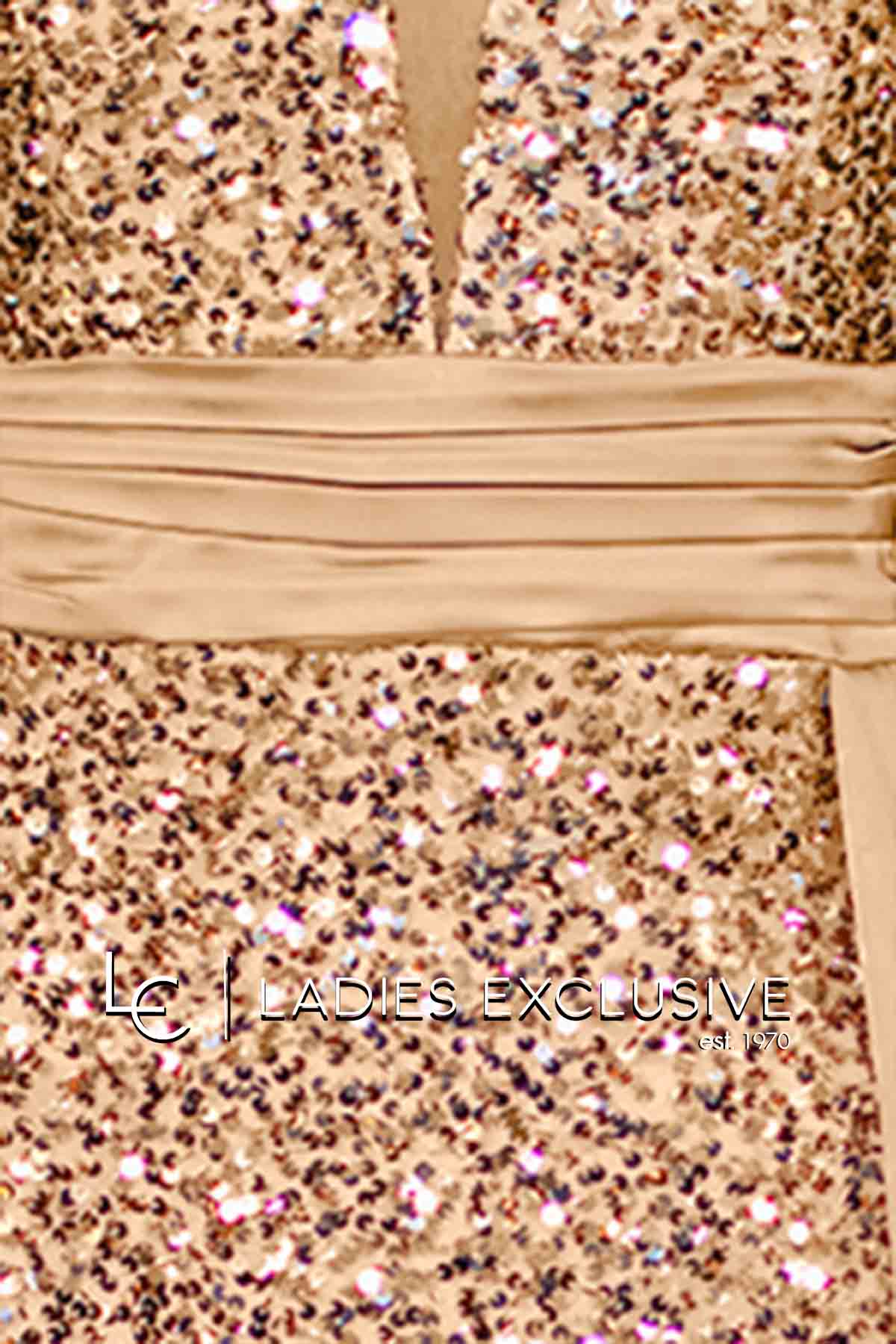 EFFECT Φόρεμα χρυσό βραδινό μακρύ αμάνικο, με κεντημένες παγιέτες και σατέν λεπτομέρεια στη μέση. Από το πλάι έχει σατέν πρόσθετο ύφασμα σαν ουρά, που δίνει ανάλαφρη κίνηση και μεγάλο άνοιγμα.