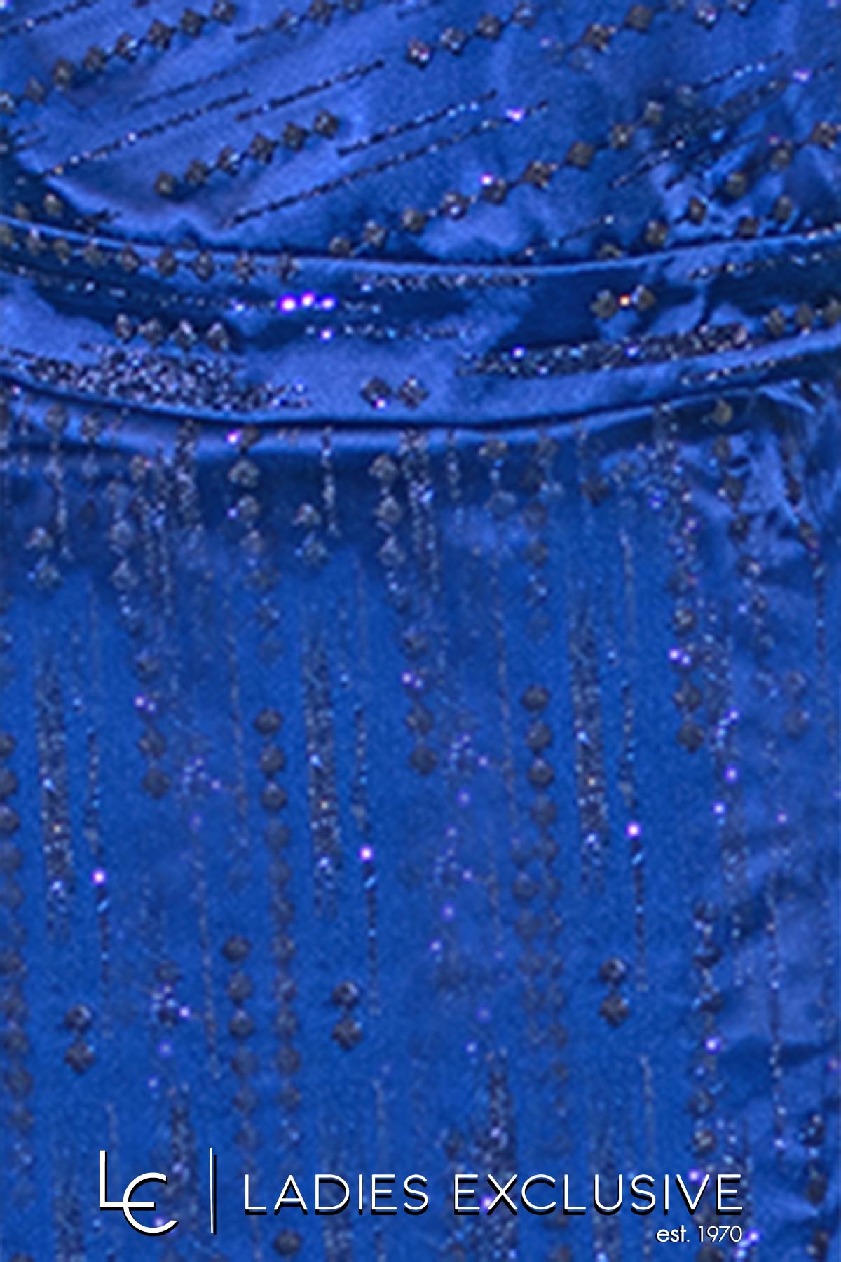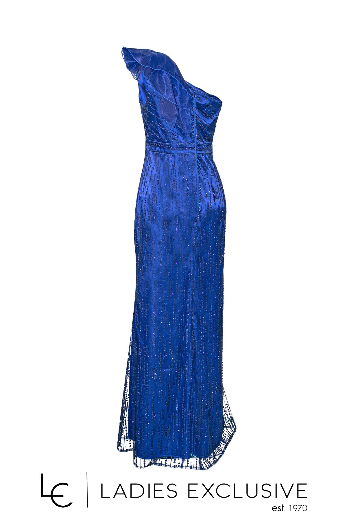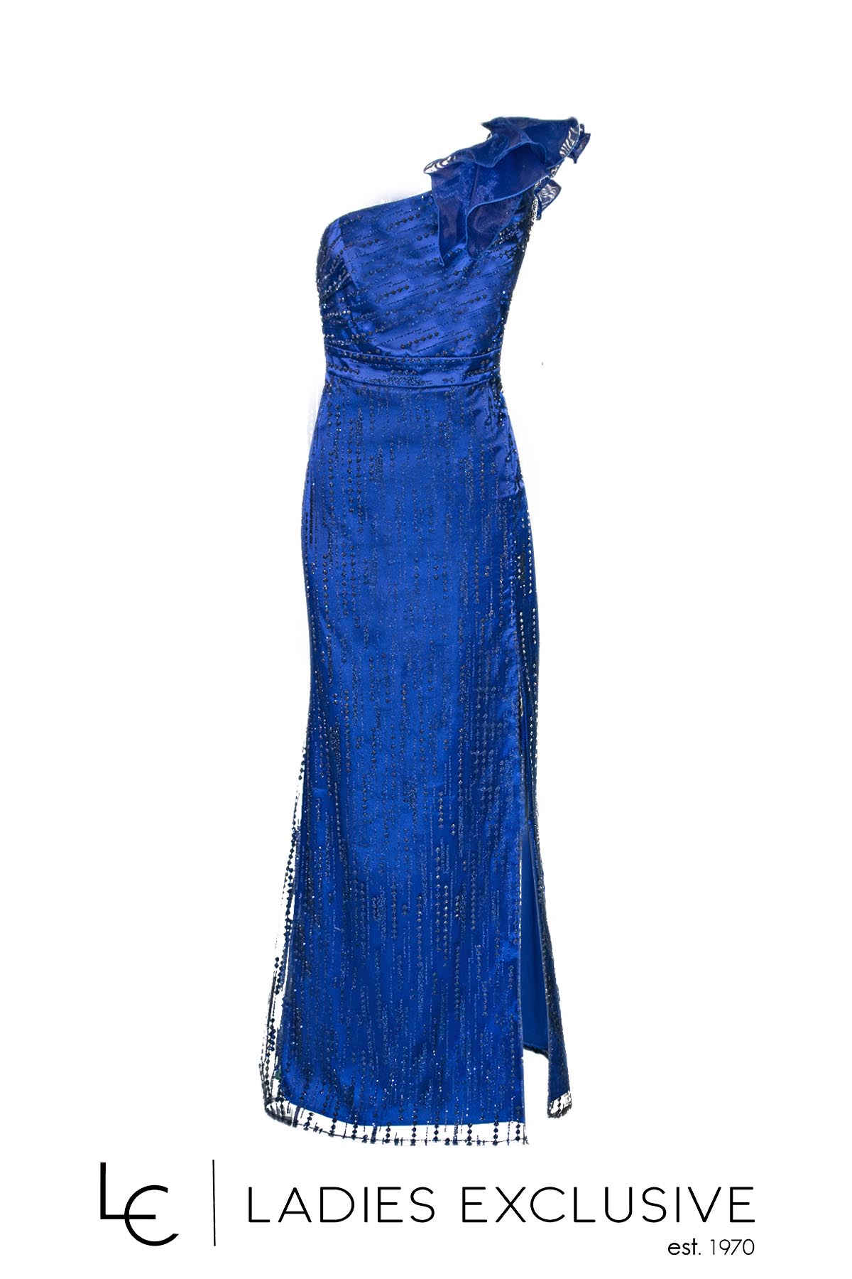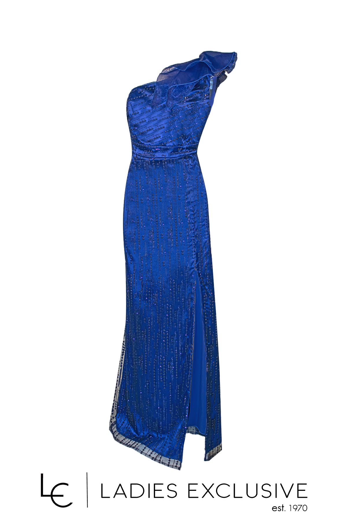 EFFECT Φόρεμα μπλε ρουά βραδινό μακρύ με έναν ώμο έξω και γκλίτερ. Στον έναν ώμο έχει λεπτομέρεια από οργάντζα και διαθετει επιπλέον ύφασμα για τιράντα στον άλλο ώμο.