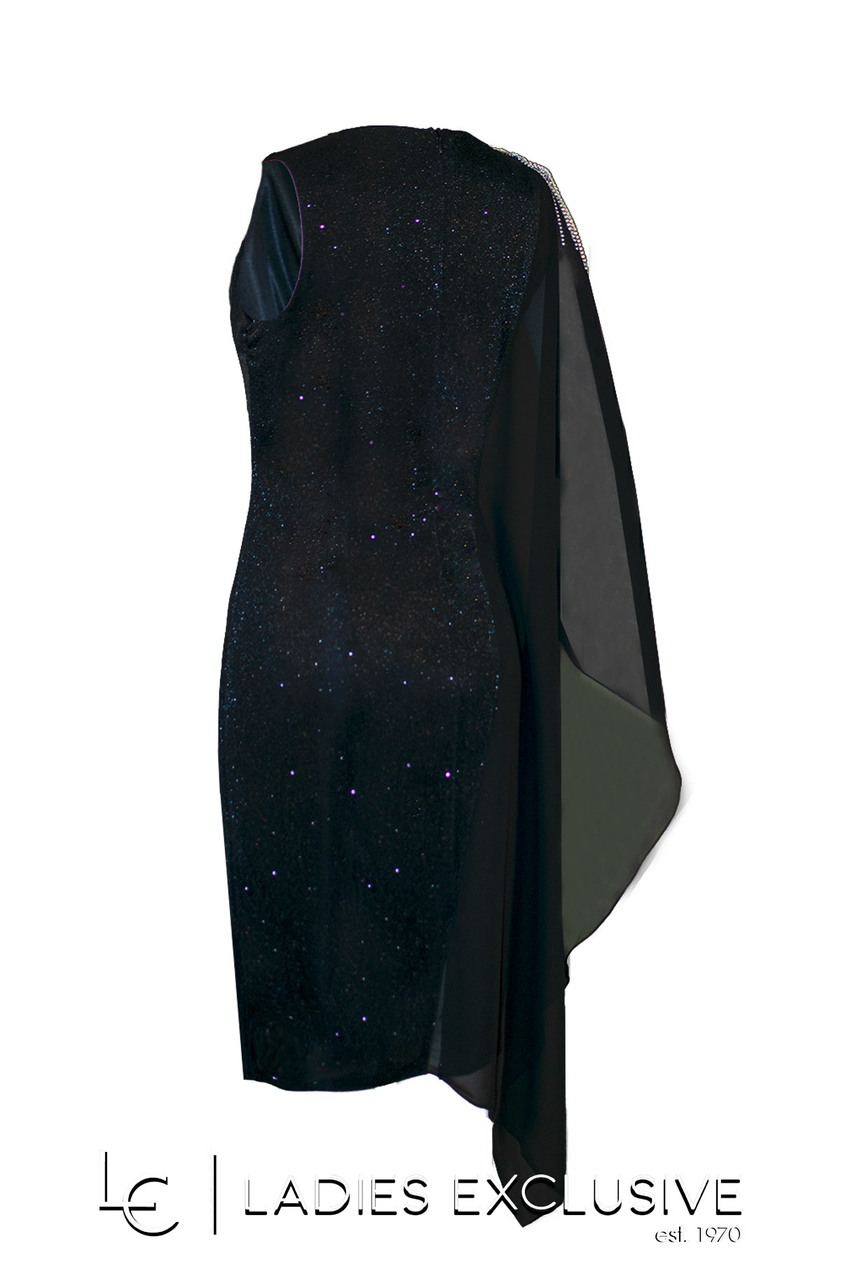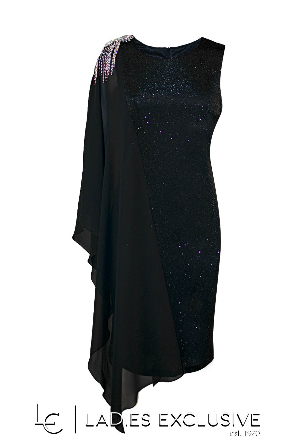 EFFECT Φόρεμα μαύρο βραδινό αμάνικο με γκλίτερ στην ύφανση και μουσελίνα στον ένα ώμο, που πέφτει αέρινη μέχρι κάτω. Στον ένα ώμο έχει ενα μεγάλο κόσμημα από λαμπερά στρας.