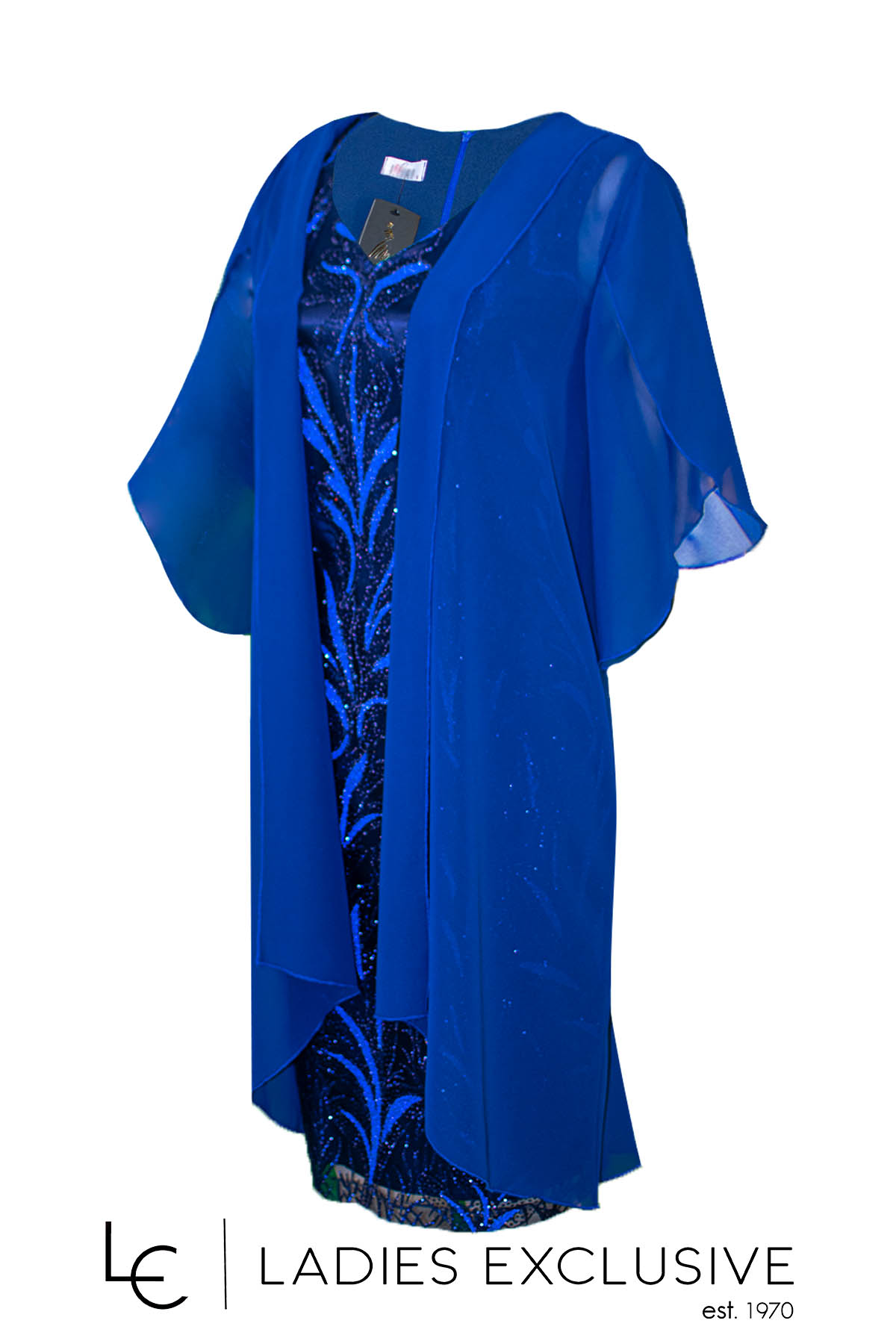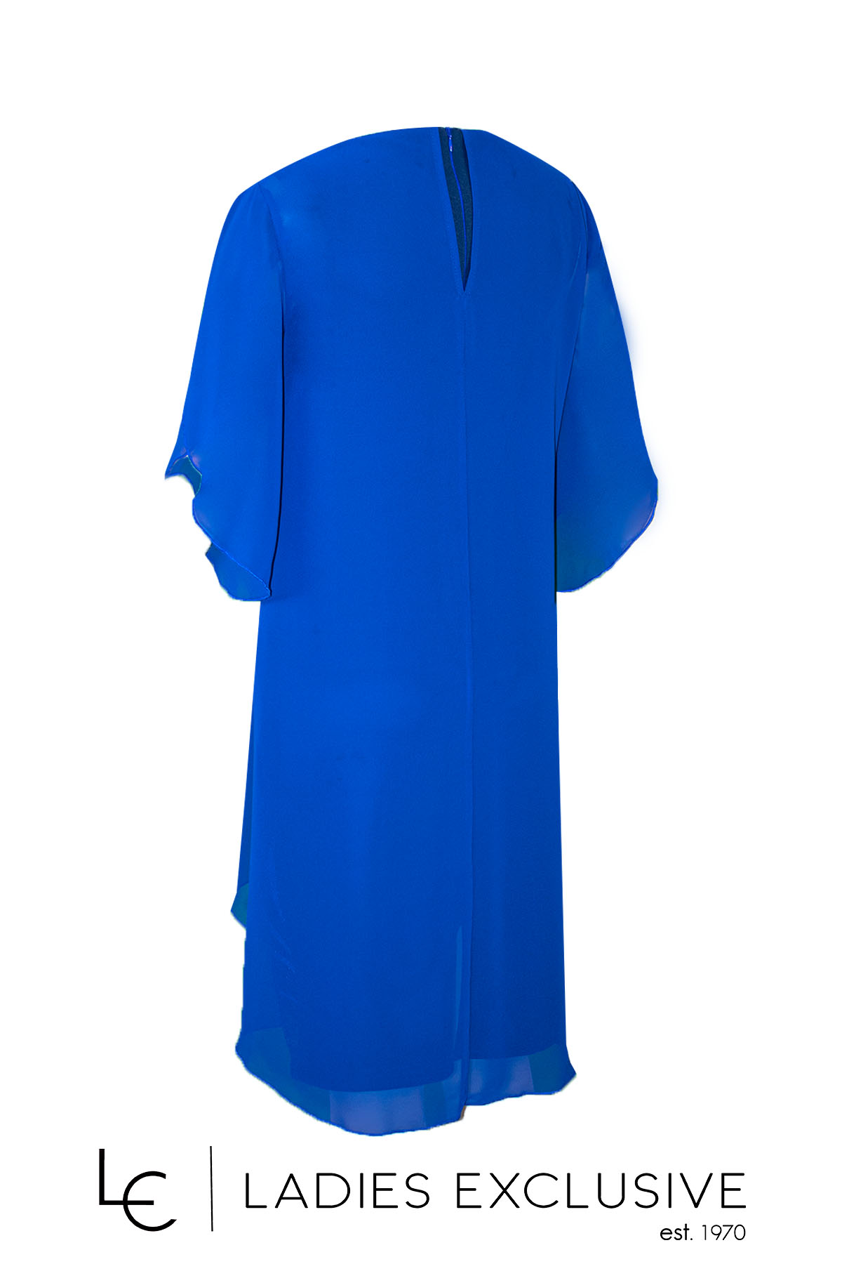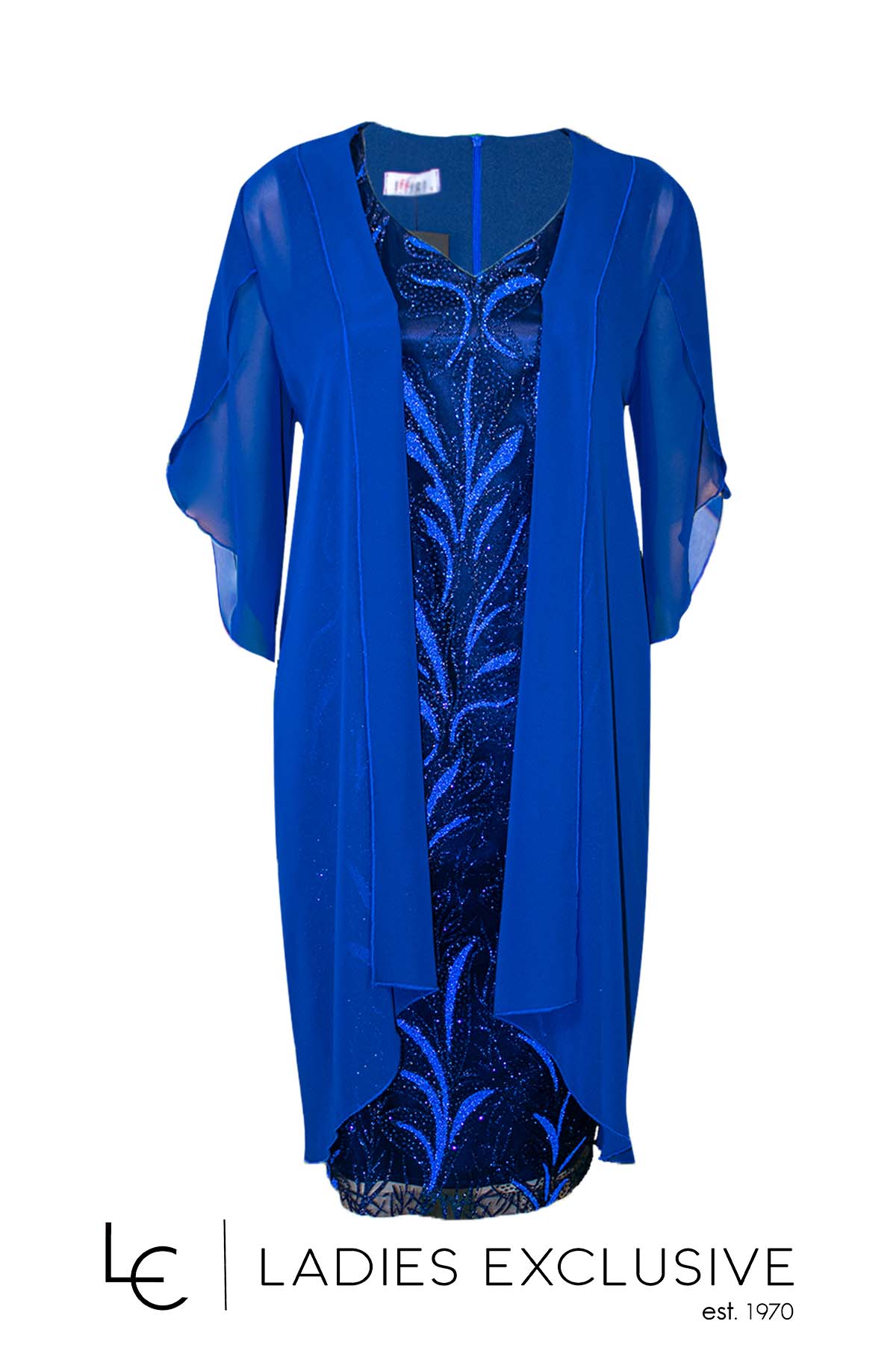 EFFECT Φόρεμα μπλε βραδινό μέχρι το γόνατο, κεντημένο με δαντέλα με στρας και μπέρτα μουσελίνα.