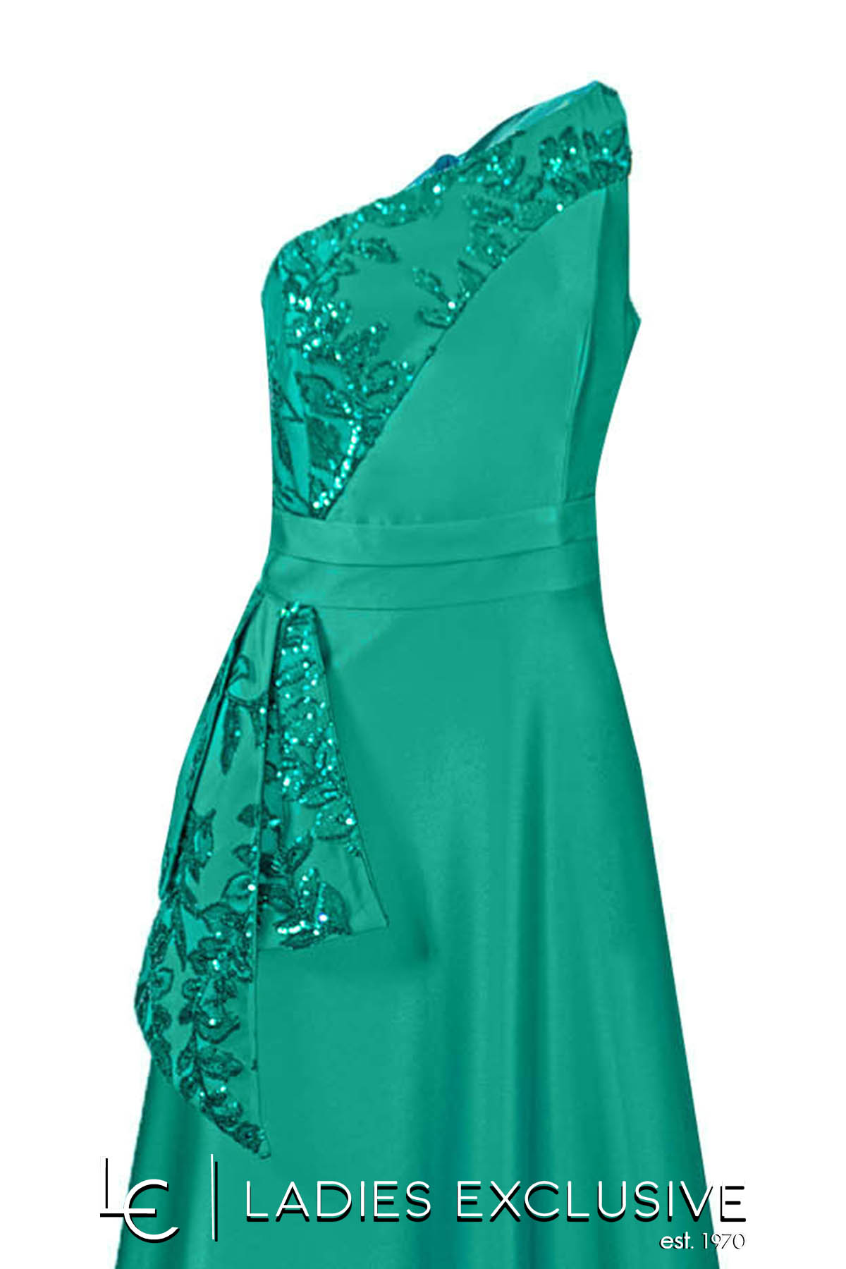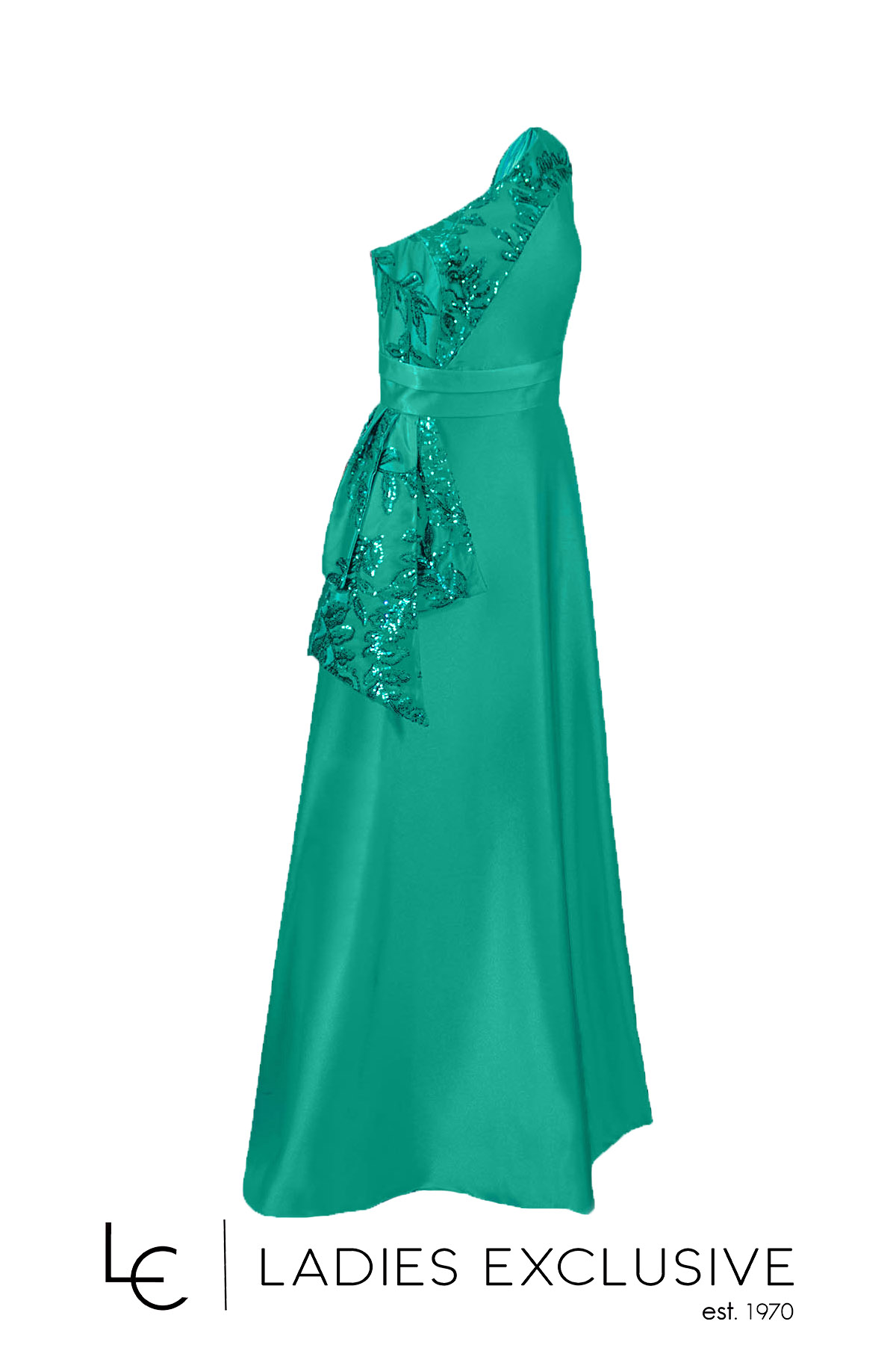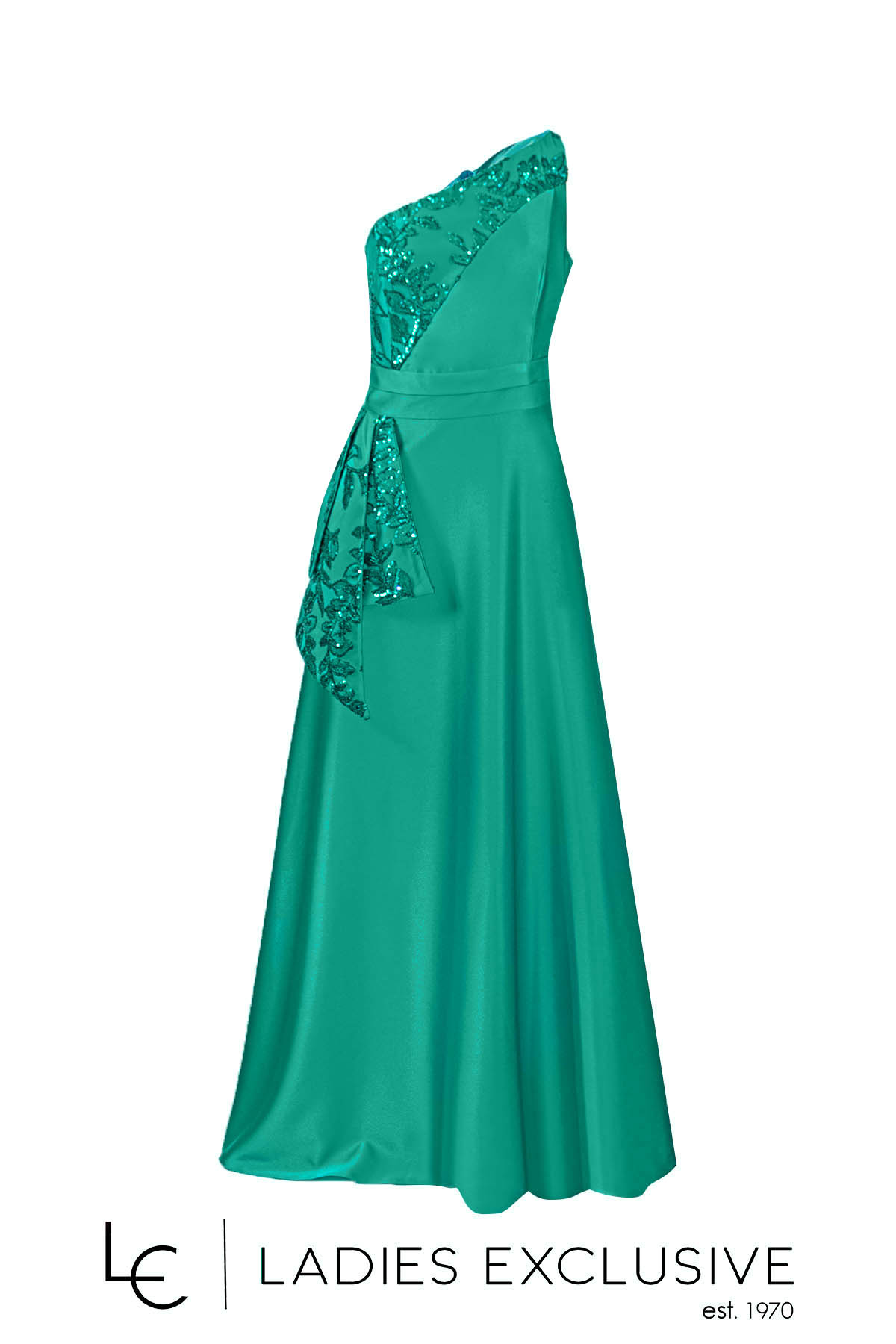 EFFECT Φόρεμα πράσινο σμαραγδί μακρύ βραδινό, με ακάλυπτο τον ένα ώμο και ιδιαίτερο κέντημα με παγιέτες στο μπούστο και σε ύφασμα που πέφτει κάτω από τη μέση. Διαθέτει επιπλέον ύφασμα γα τοποθέτηση ράντας.