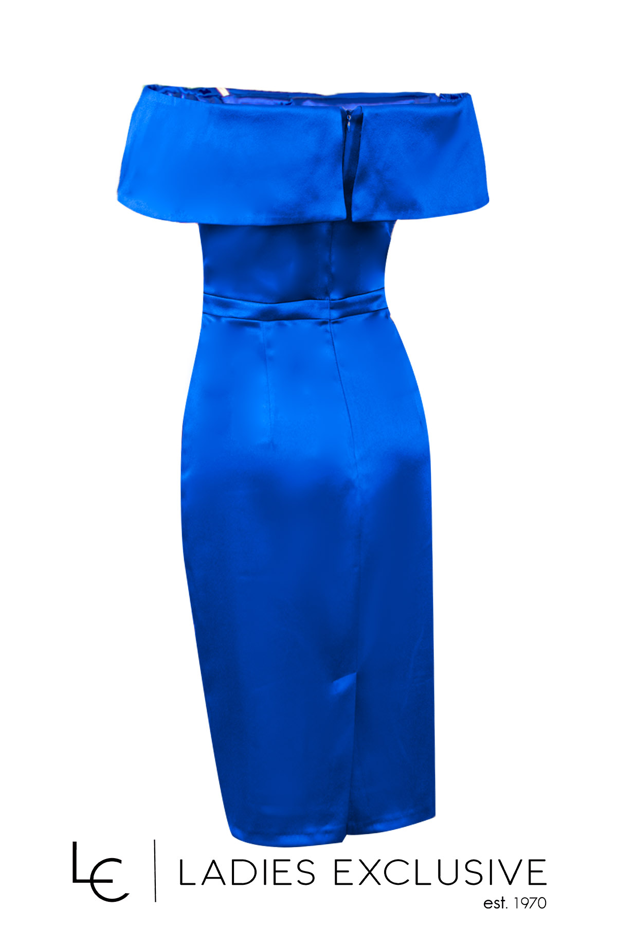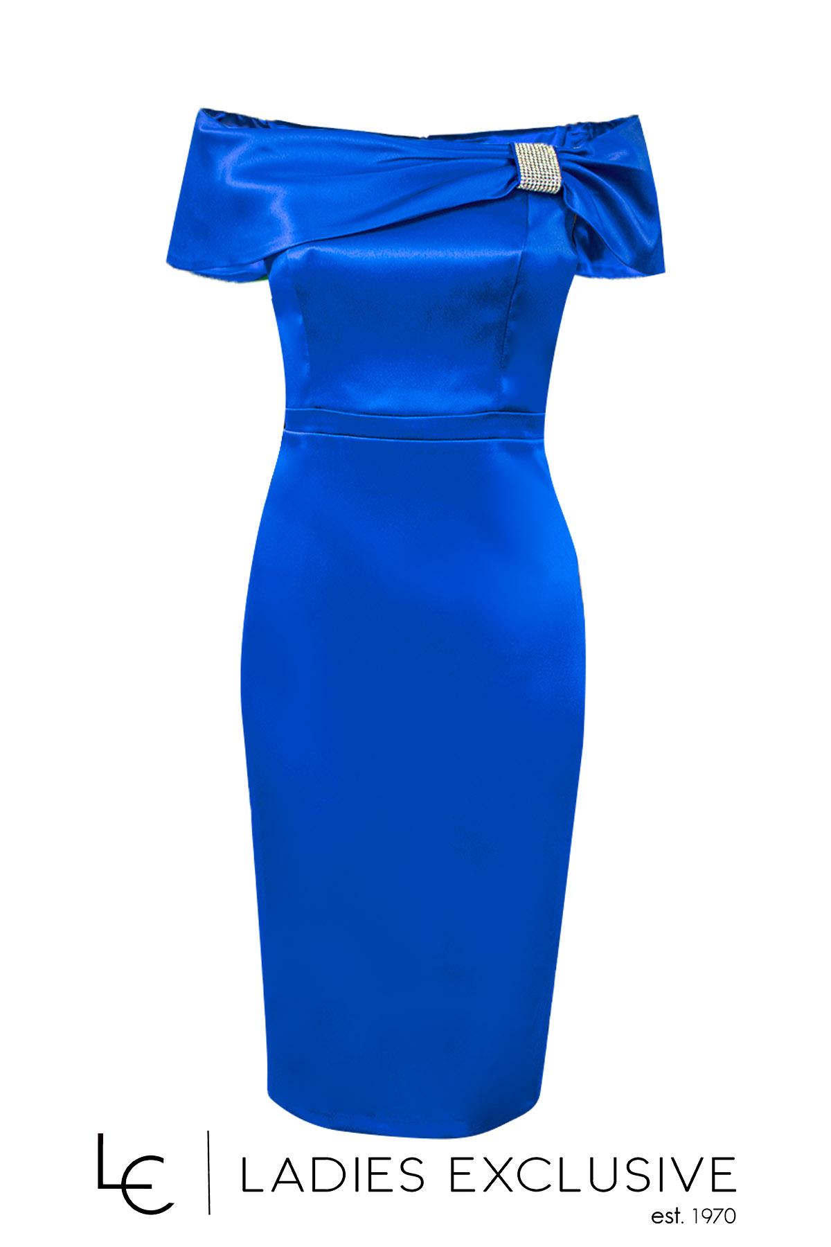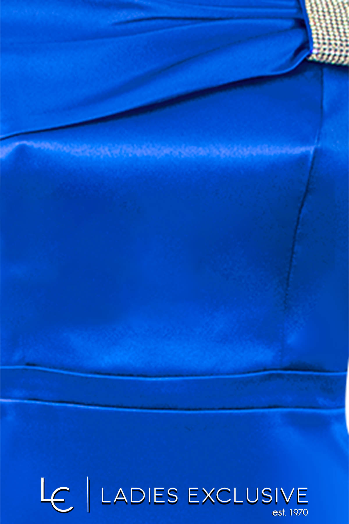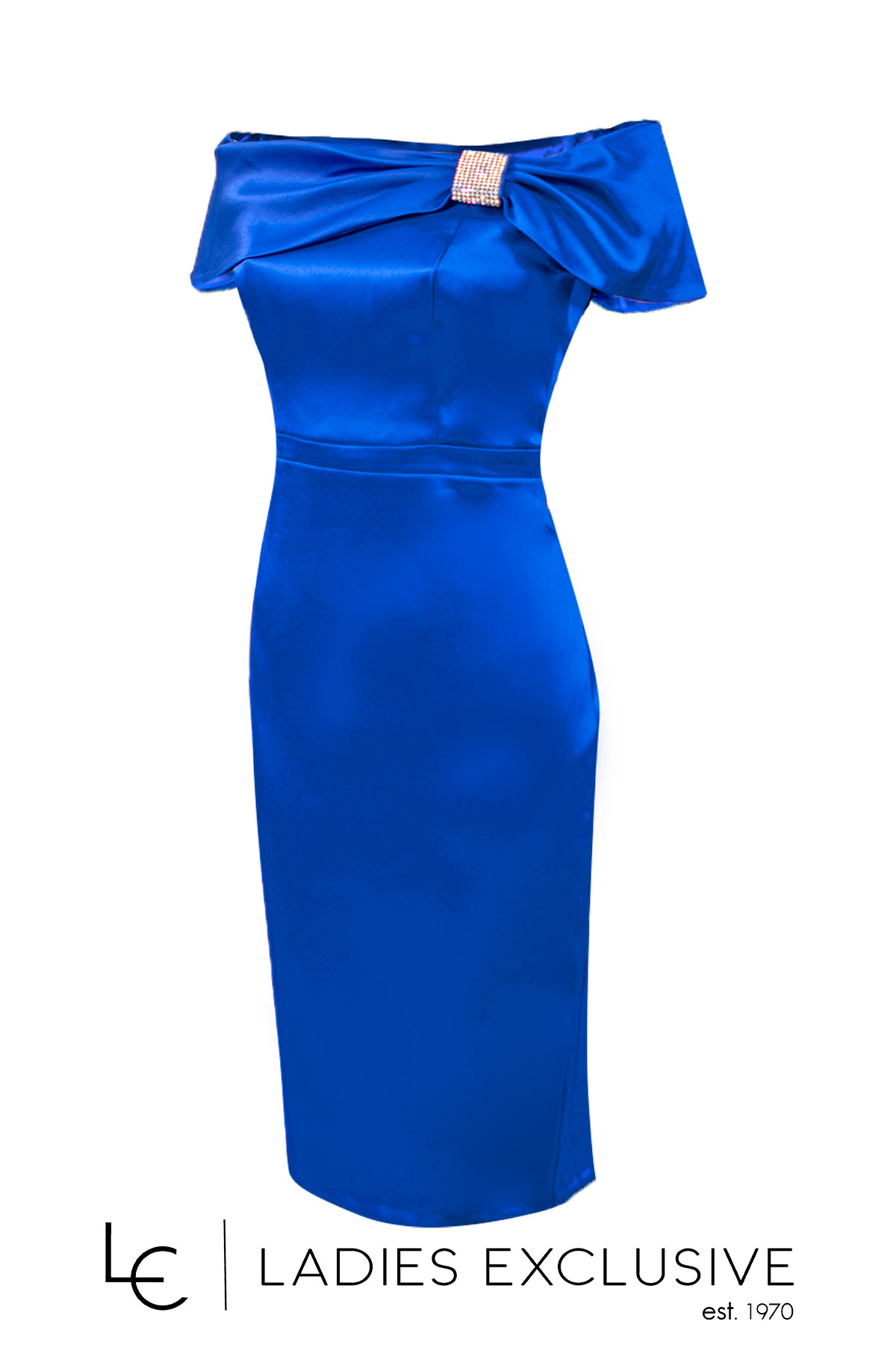 EFFECT Φόρεμα μπλε ρουά σατέν βραδινό σε ίσια γραμμή μέχρι το γόνατο. Το πάνω μέρος είναι ρηχτό στους ώμους με λεπτομέρεια με στρας και έχει επιπλέον ύφασμα γα τοποθέτηση ράντας.