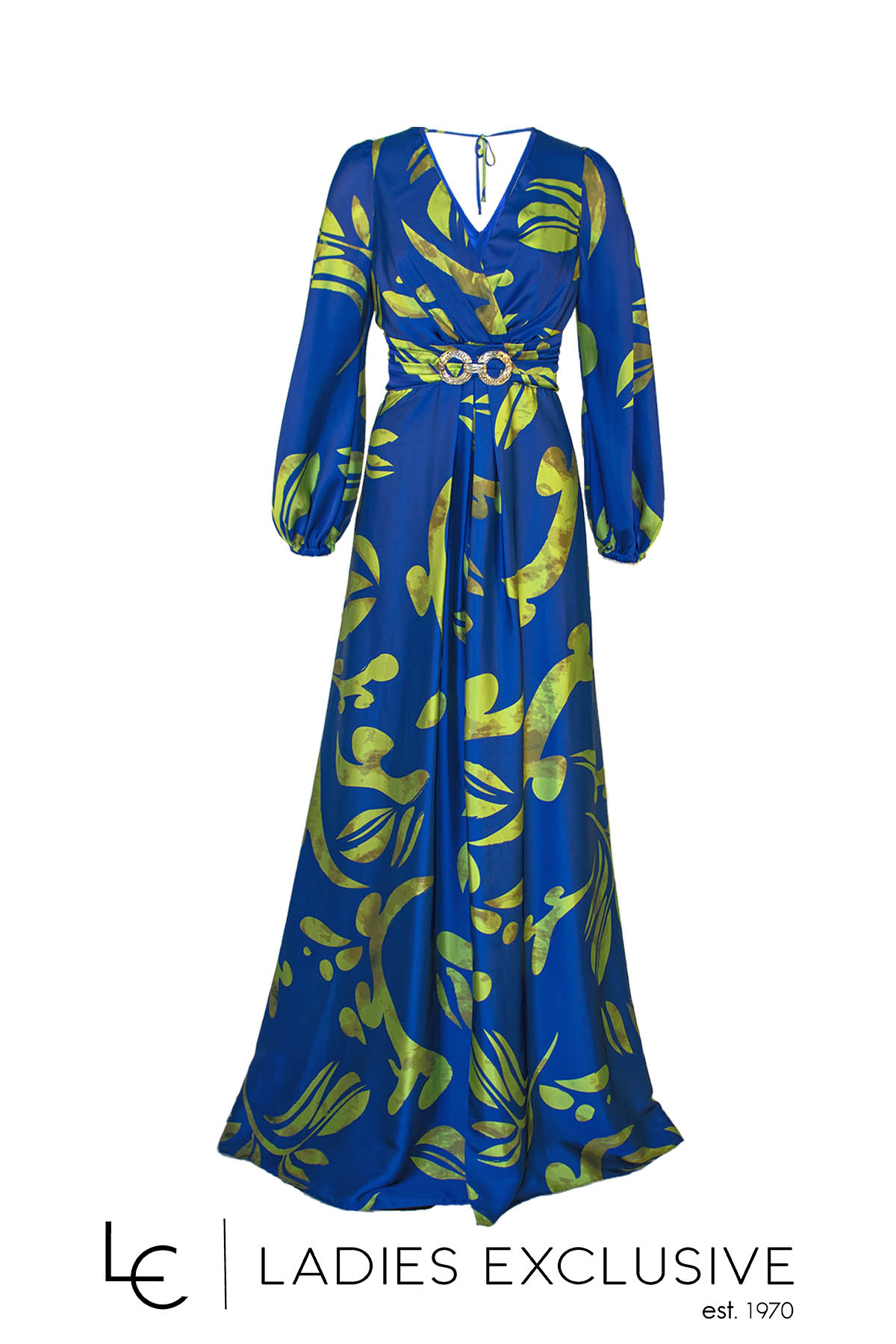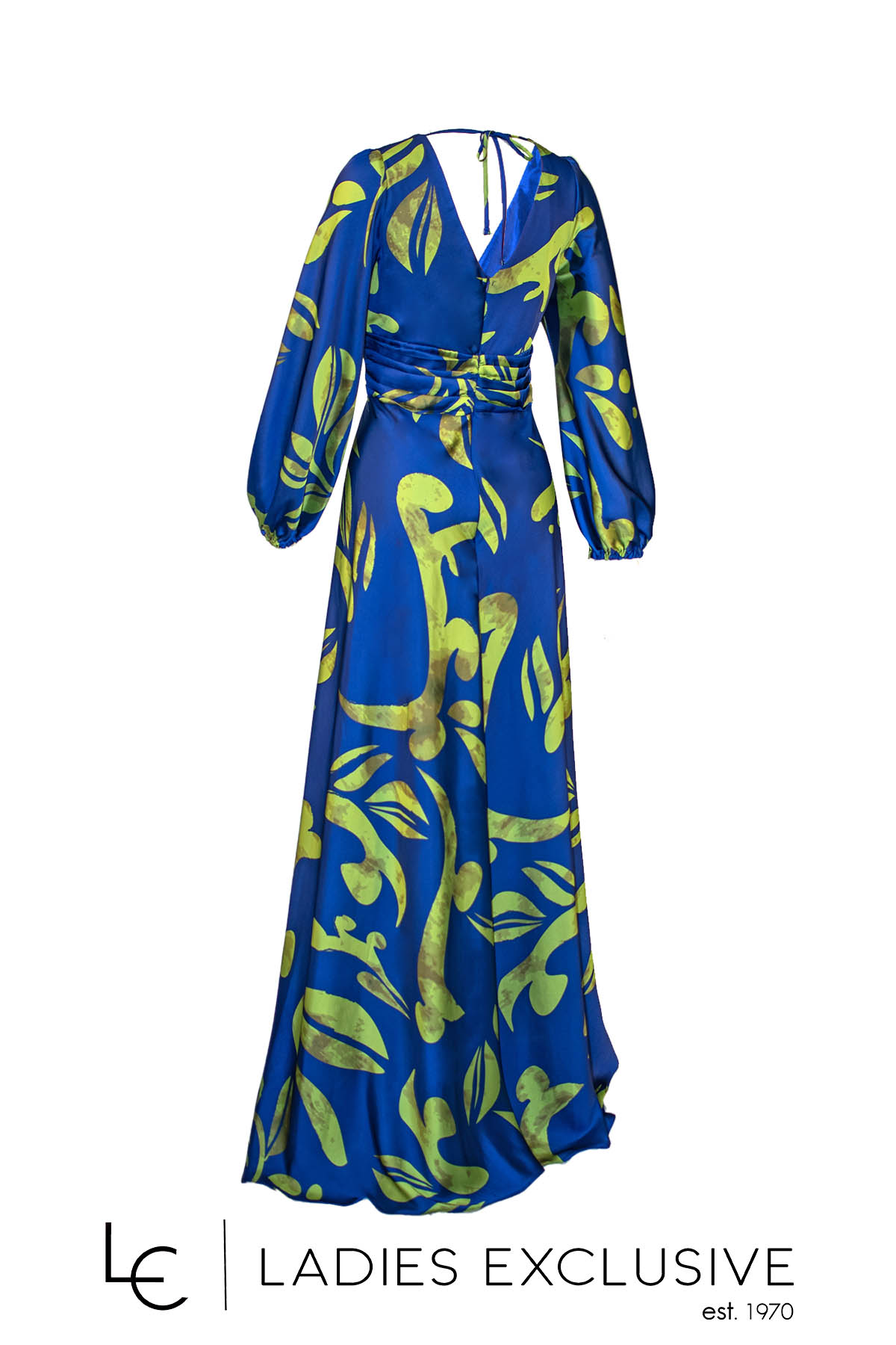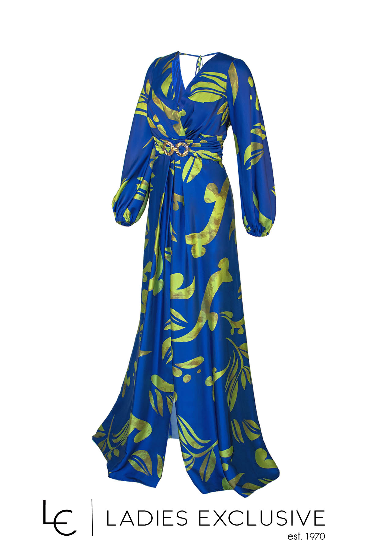 EFFECT Φόρεμα εμπριμέ σατέν μακρύ, με μακρύ μανίκι που έχει λάστιχο στο τελείωμα και μεγάλο σκίσιμο στο μπροστινό μέρος. Στην πλάτη έχει άνοιγμα και ιδιαίτερο δέσιμο.