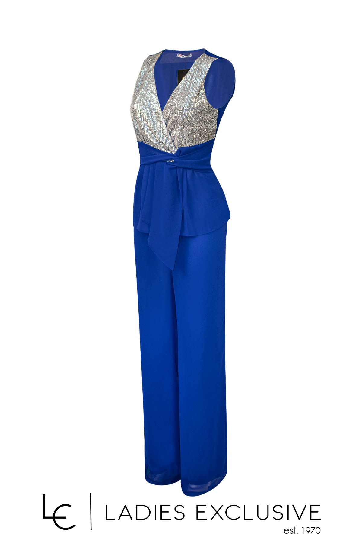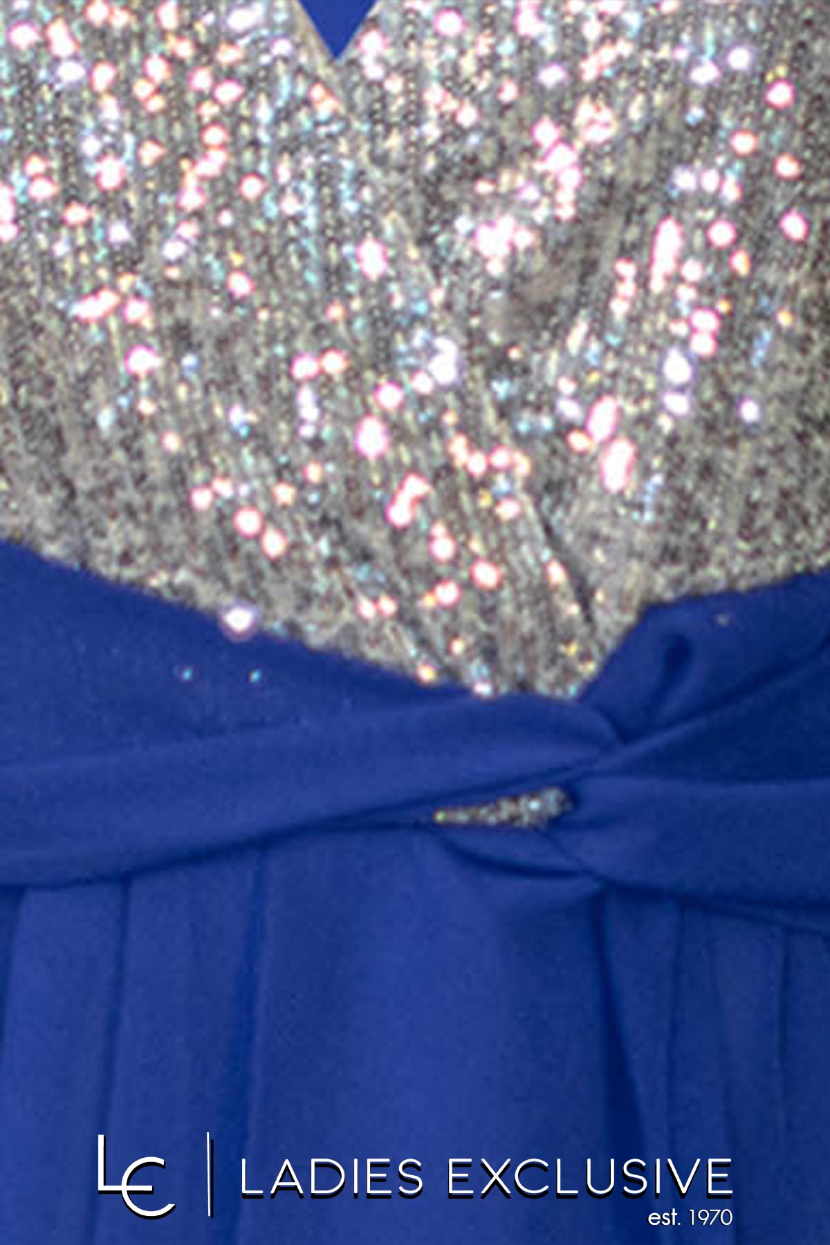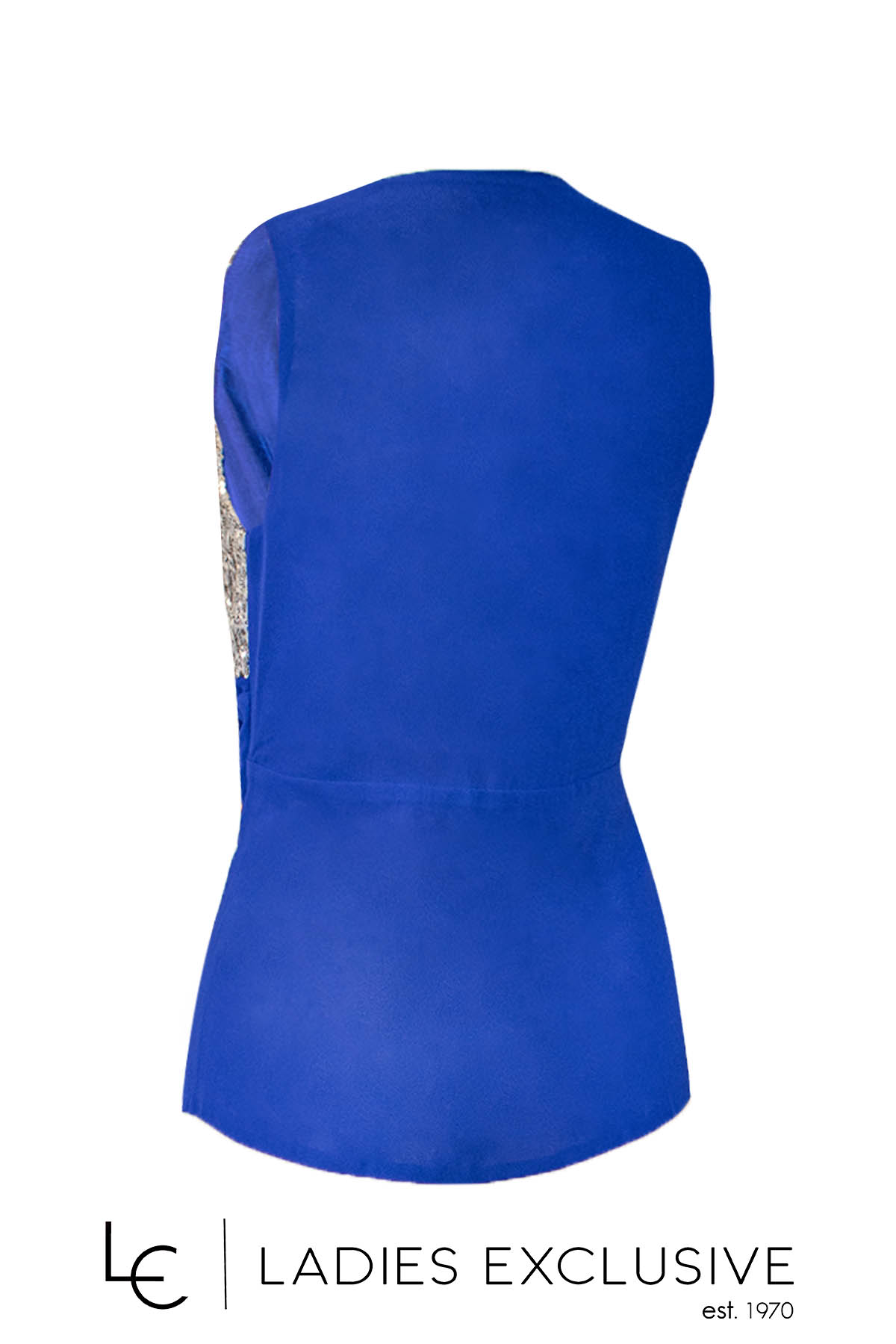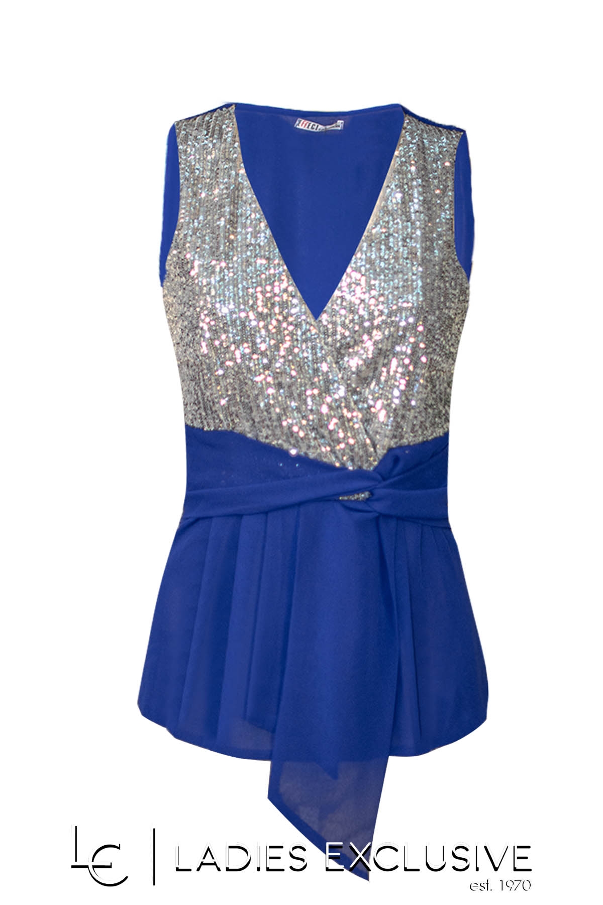 EFFECT Μπλούζα μπλε ρουά αμάνικη βραδινή, κρουαζέ, με παγιέτες στο μπούστο και μουσελίνα στο κάτω μέρος και στο πίσω. Γίνεται σετ με την παντελόνα με κωδικό 23-501-2235.14.