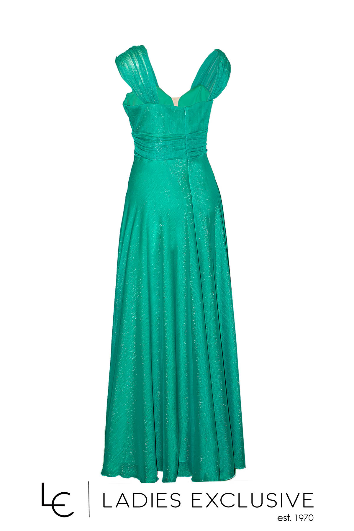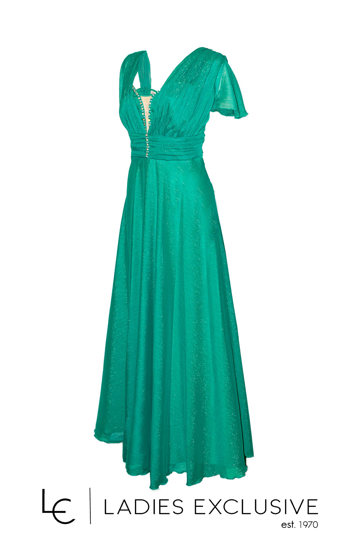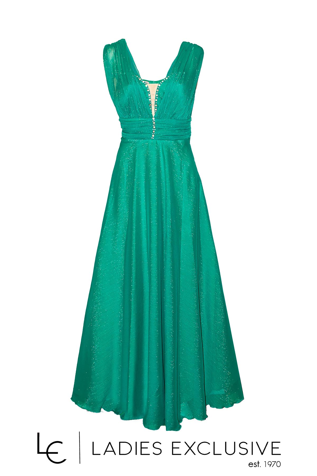 STELLA DERLOU Φόρεμα πράσινο αμάνικο βραδινό ντραπέ μακρύ με διακοσμητικά στρας στο μπούστο και χρυσοκλωστή στην ύφανση. Διαθέτει επιπλέον ύφασμα για τοποθέτηση μανικιού.