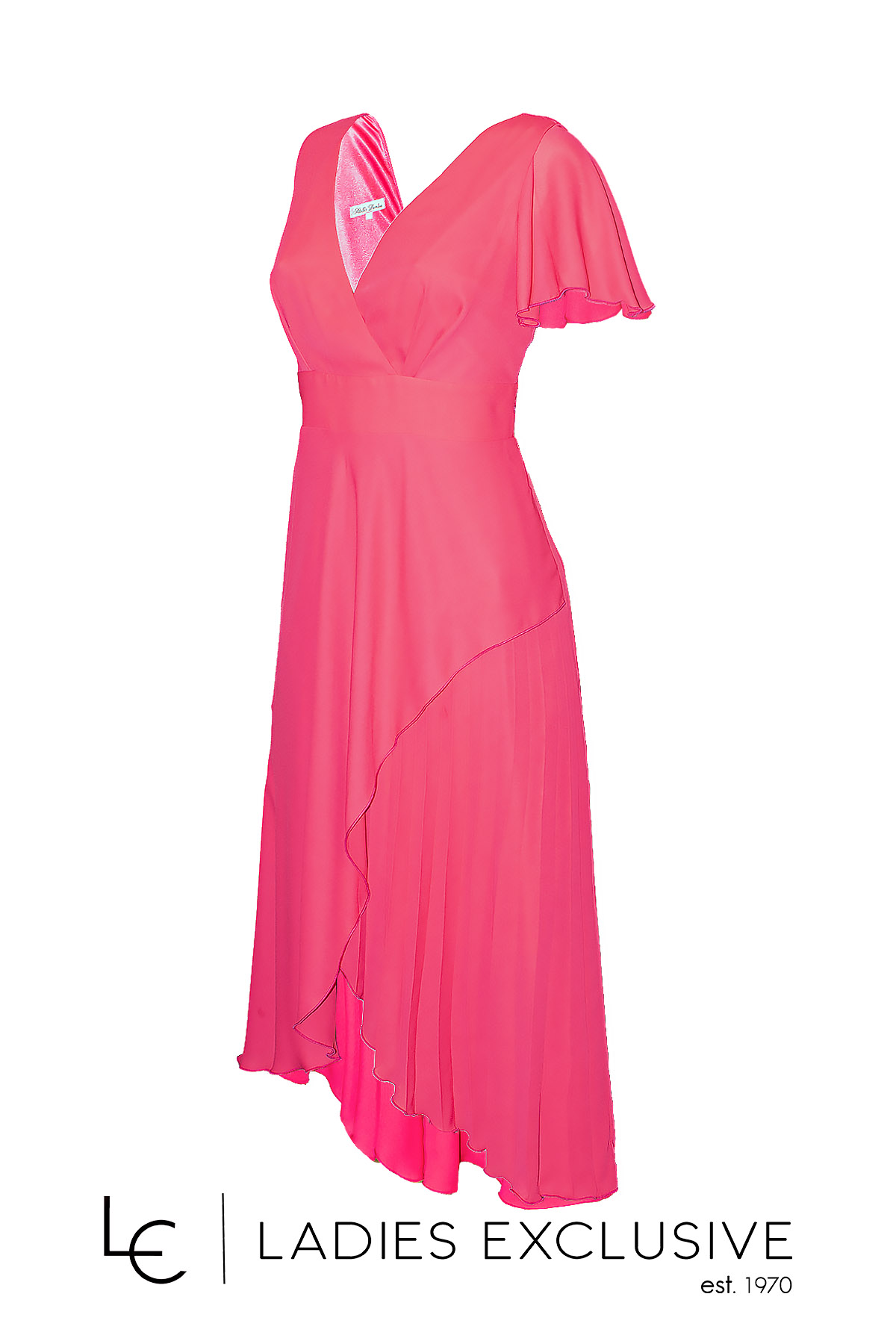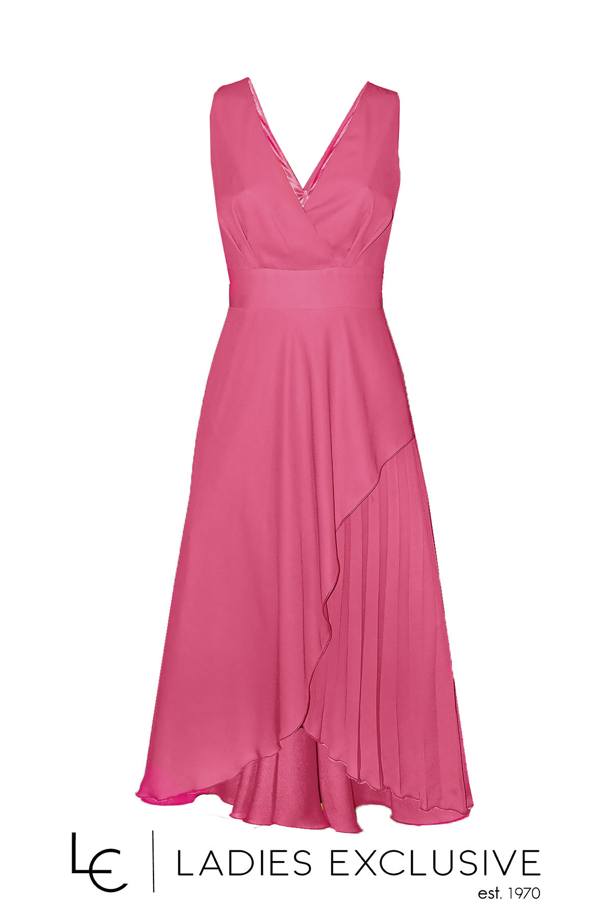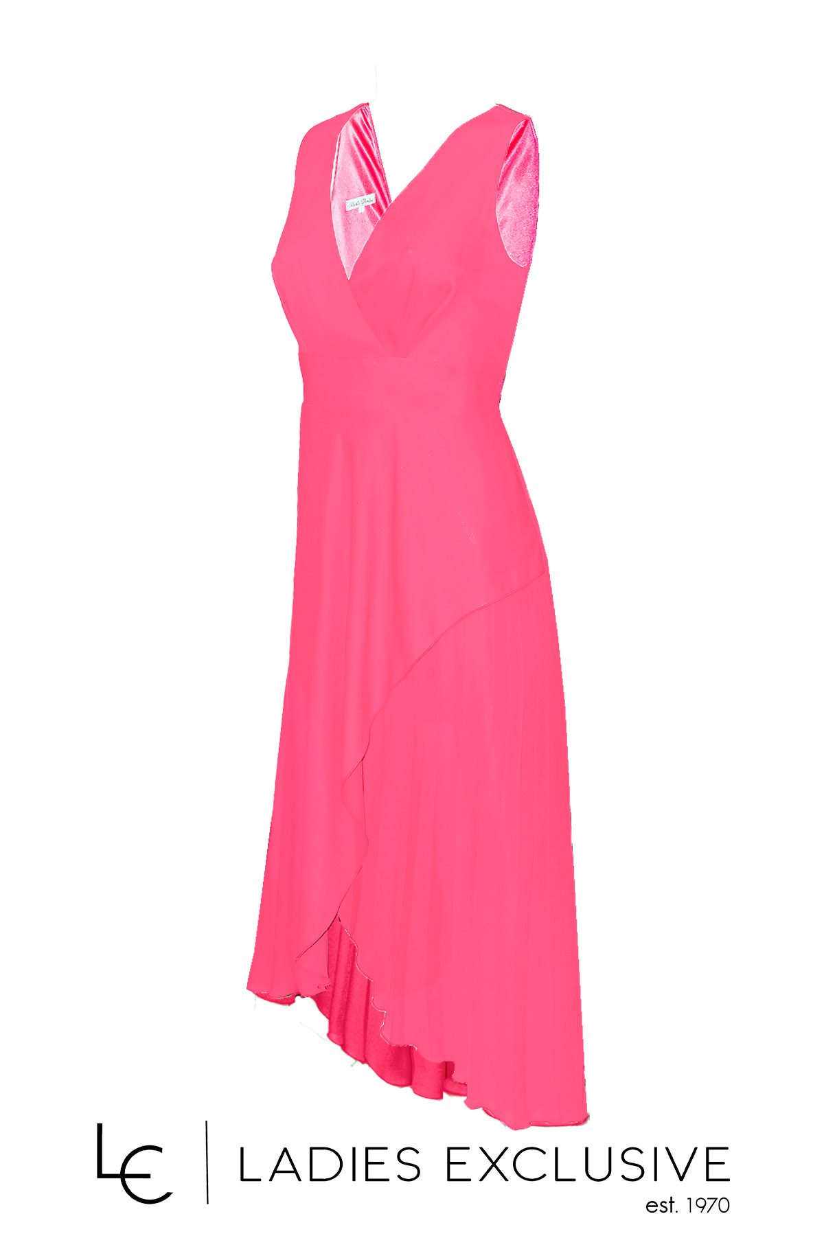 STELLA DERLOU Φόρεμα αμάνικο κρουαζέ από μουσελίνα διπλή, ίσια από τη μια πλευρά και πλισέ από την άλλη. Διαθέτει επιπλέον ύφασμα για τοποθέτηση μανικιού.