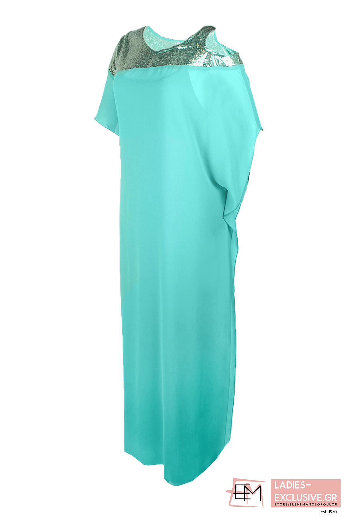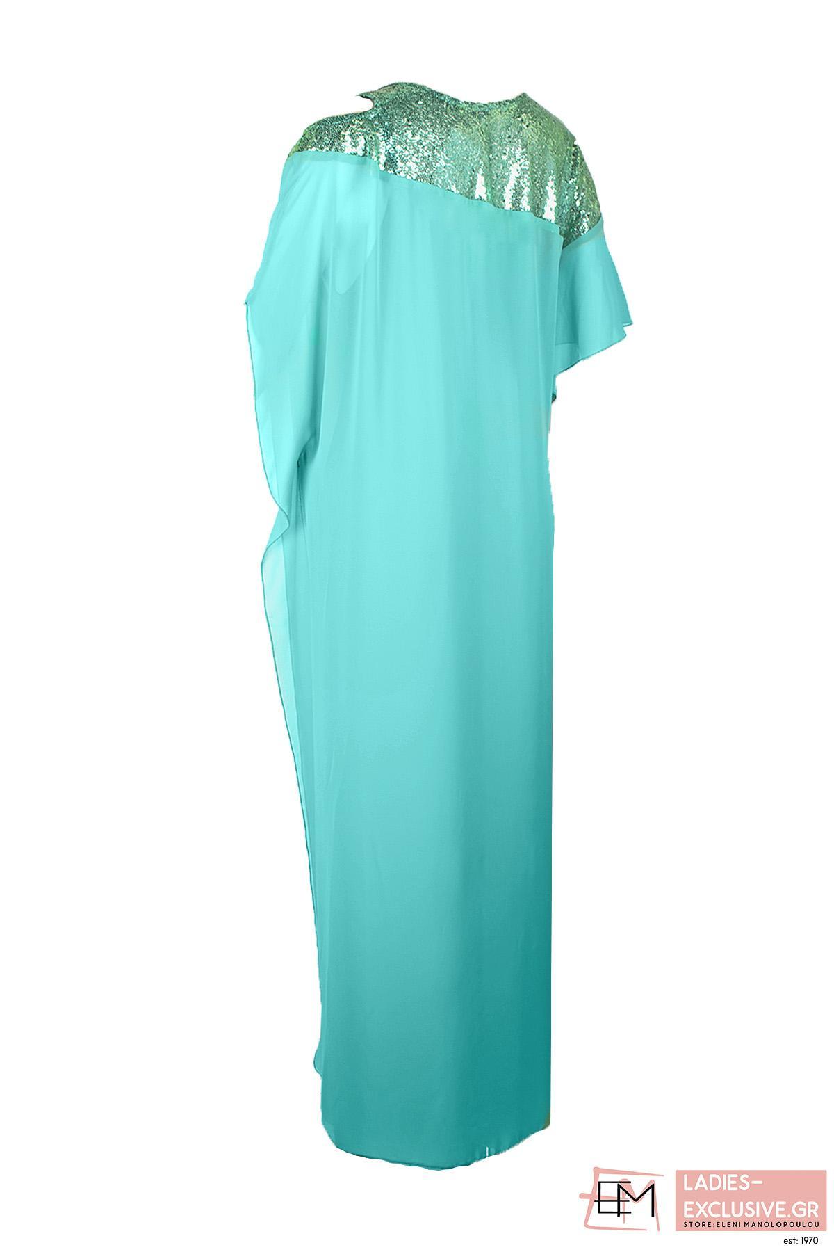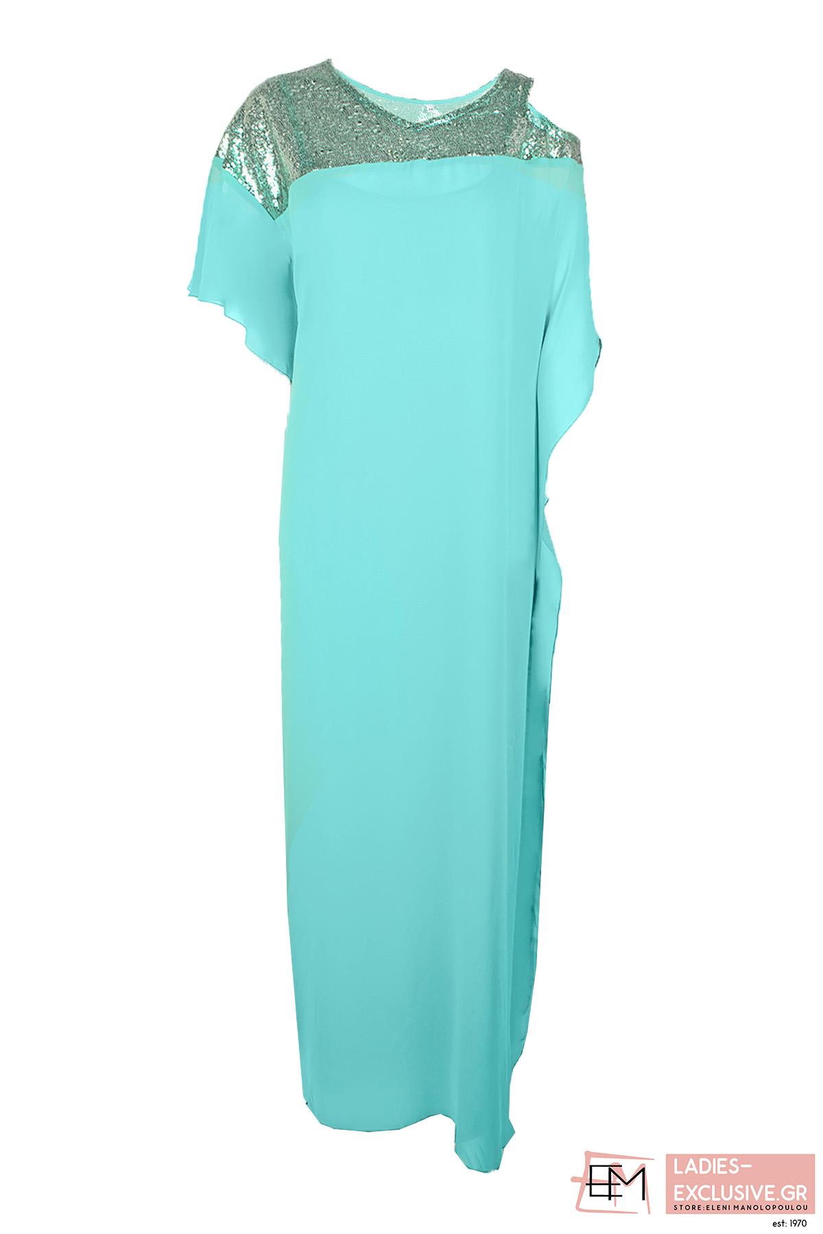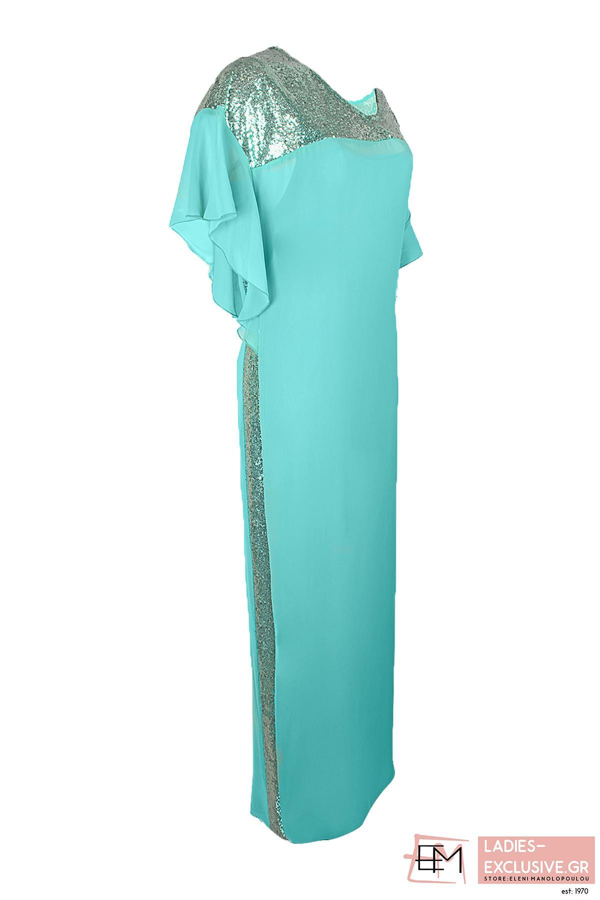 STELLA DERLOU Φόρεμα τιρκουάζ μάξι βραδινό με ένα ώμο έξω και βολάν στο άλλο χέρι. Διαθέτει εντυπωσιακό σχέδιο με παγιέτες στο μπροστινό μέρος και στο πλάι.