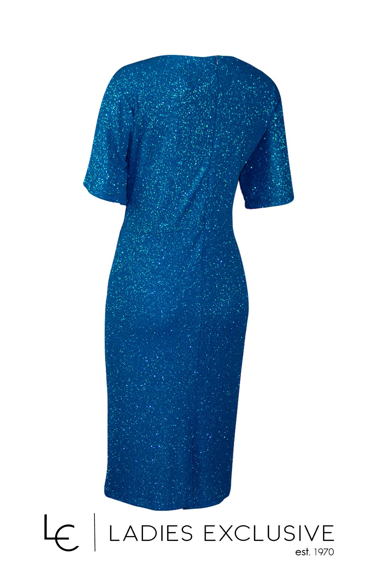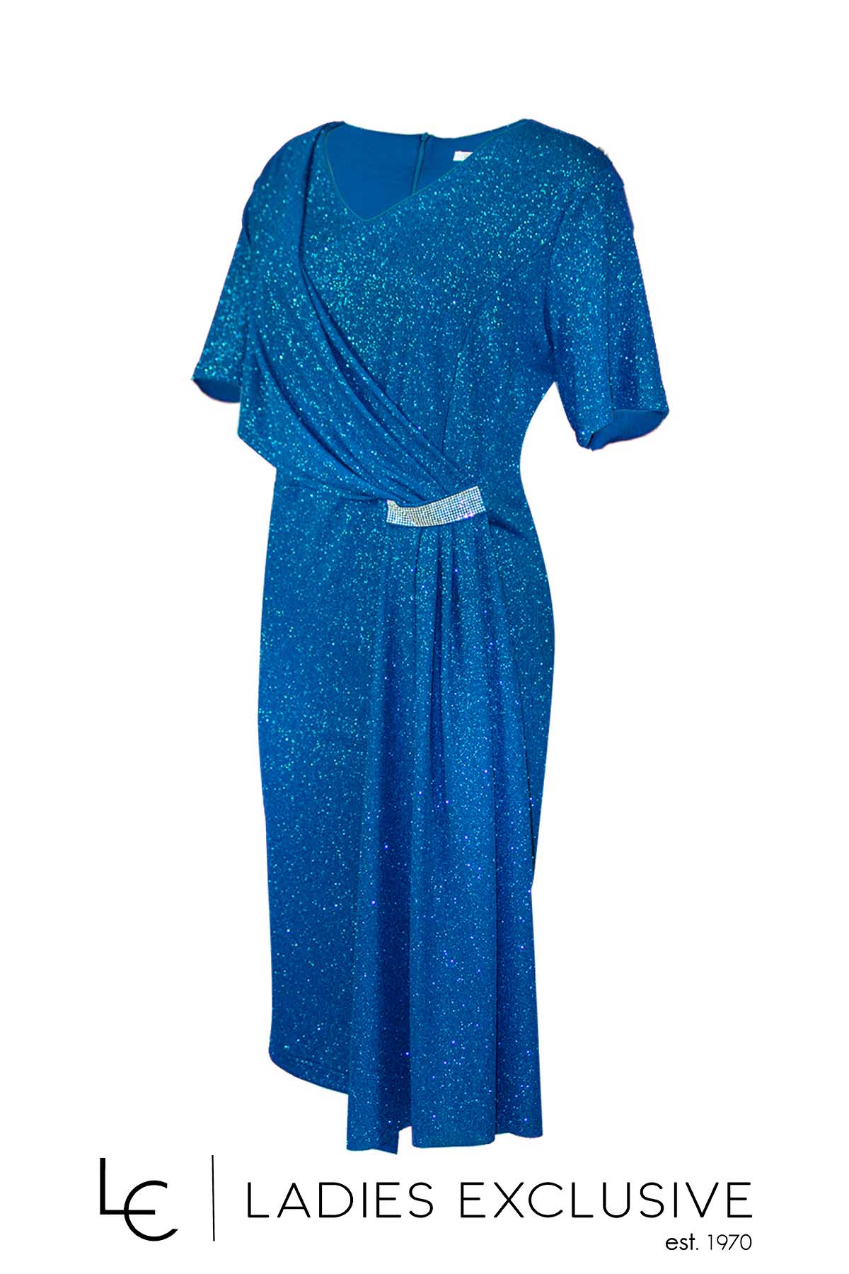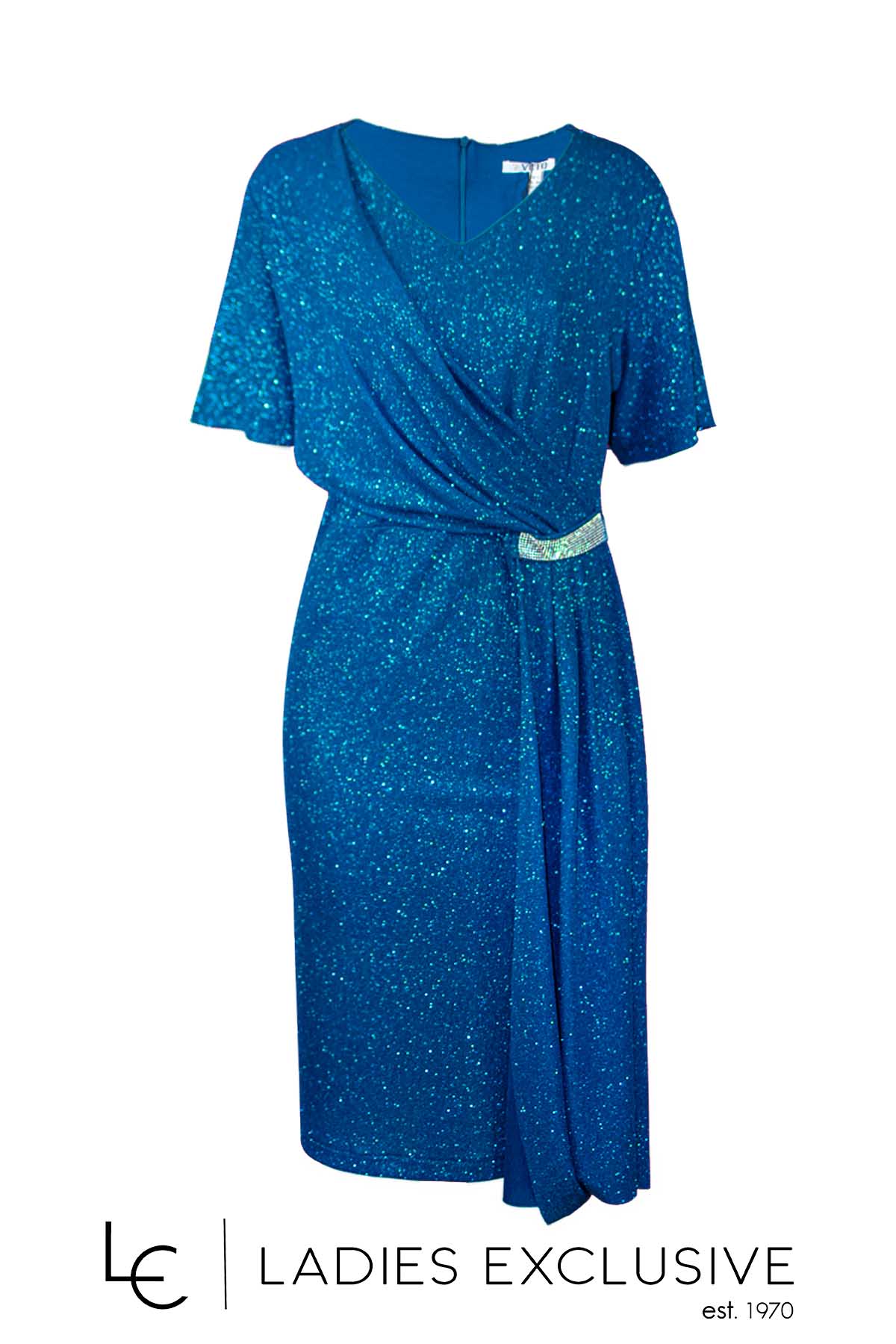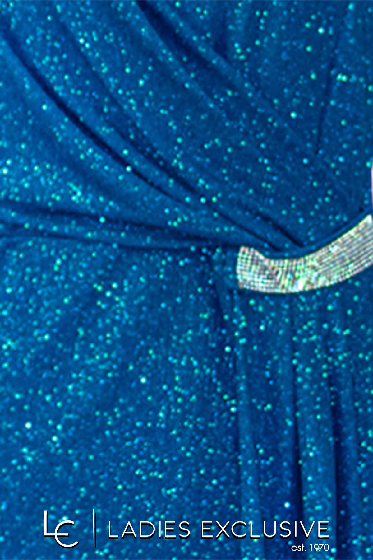 VETO Φόρεμα πετρόλ βραδινό κοντομάνικο ντραπέ, με ιδιαίτερο κόσμημα στη μέση από ύφασμα λούρεξ με λάμψη.
