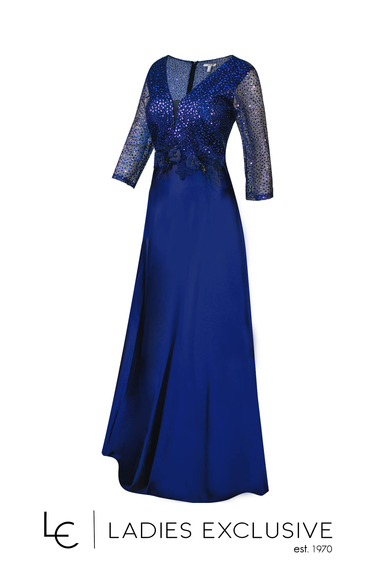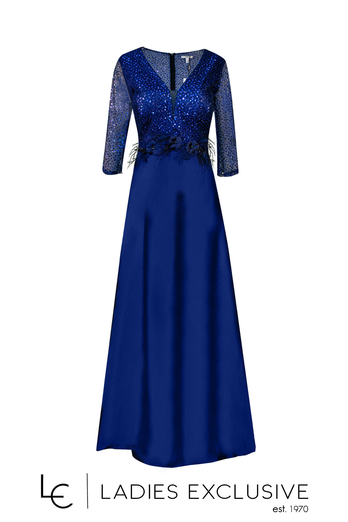 VETO Φόρεμα μπλε βραδινό μακρύ με πσγιέτες στο μπούστο και κεντημένο λουλούδι με φτερά. Η φούστα είναι αέρινη κλος.