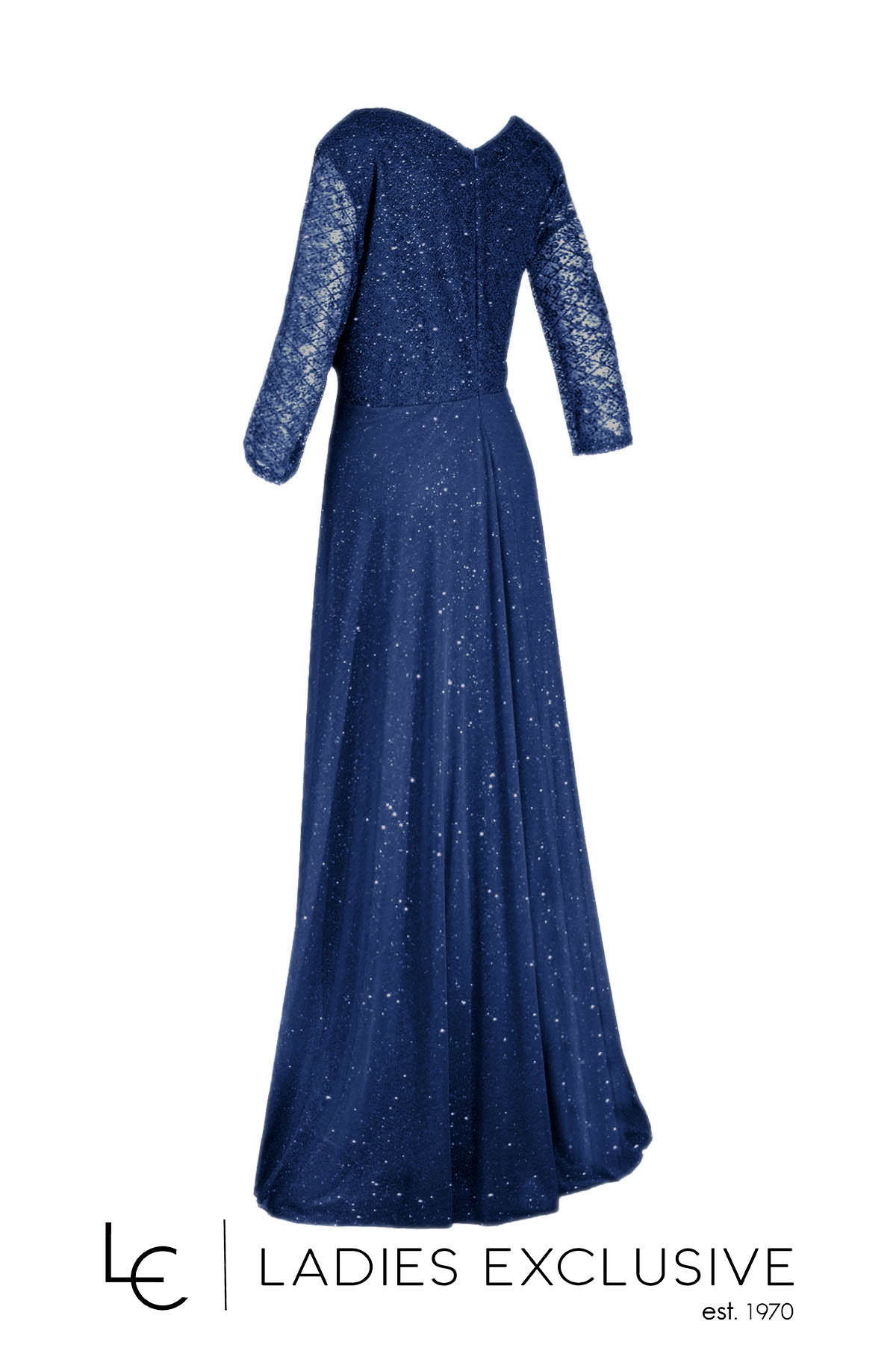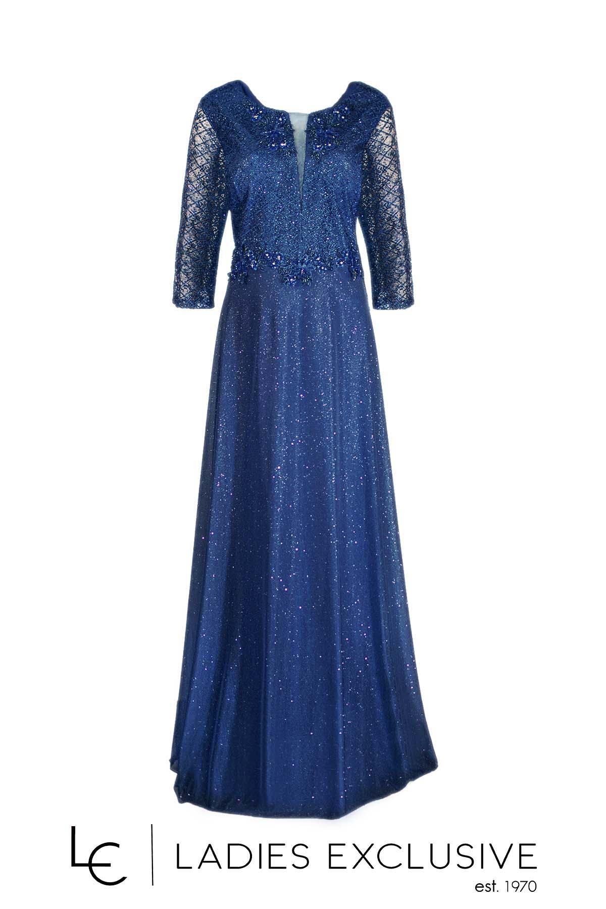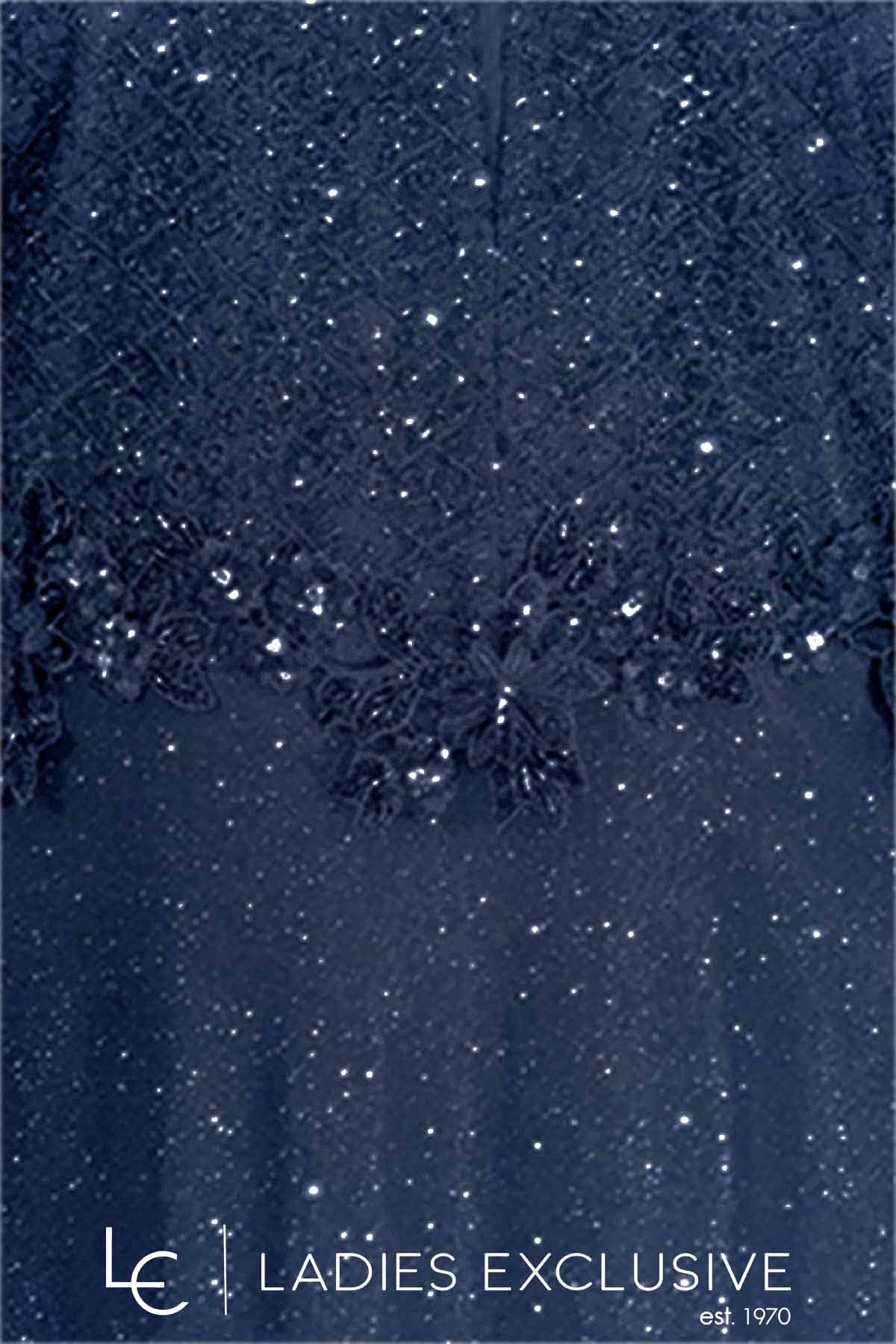 VETO Φόρεμα μπλε βραδινό μακρύ με κεντημένο μπούστο και μανίκι και αέρινη μουσελίνα με λάμψη στη φούστα. Διαθέσιμο σε μεγάλα μεγέθη.