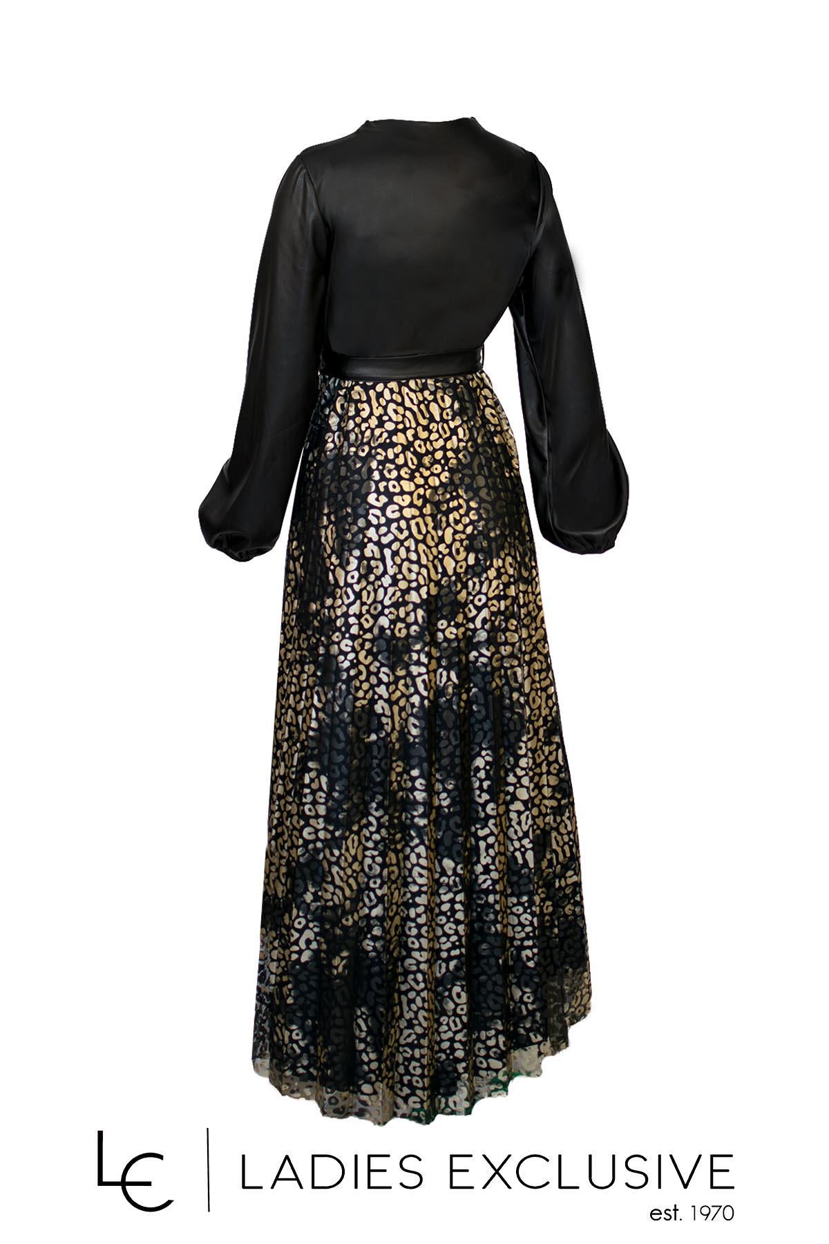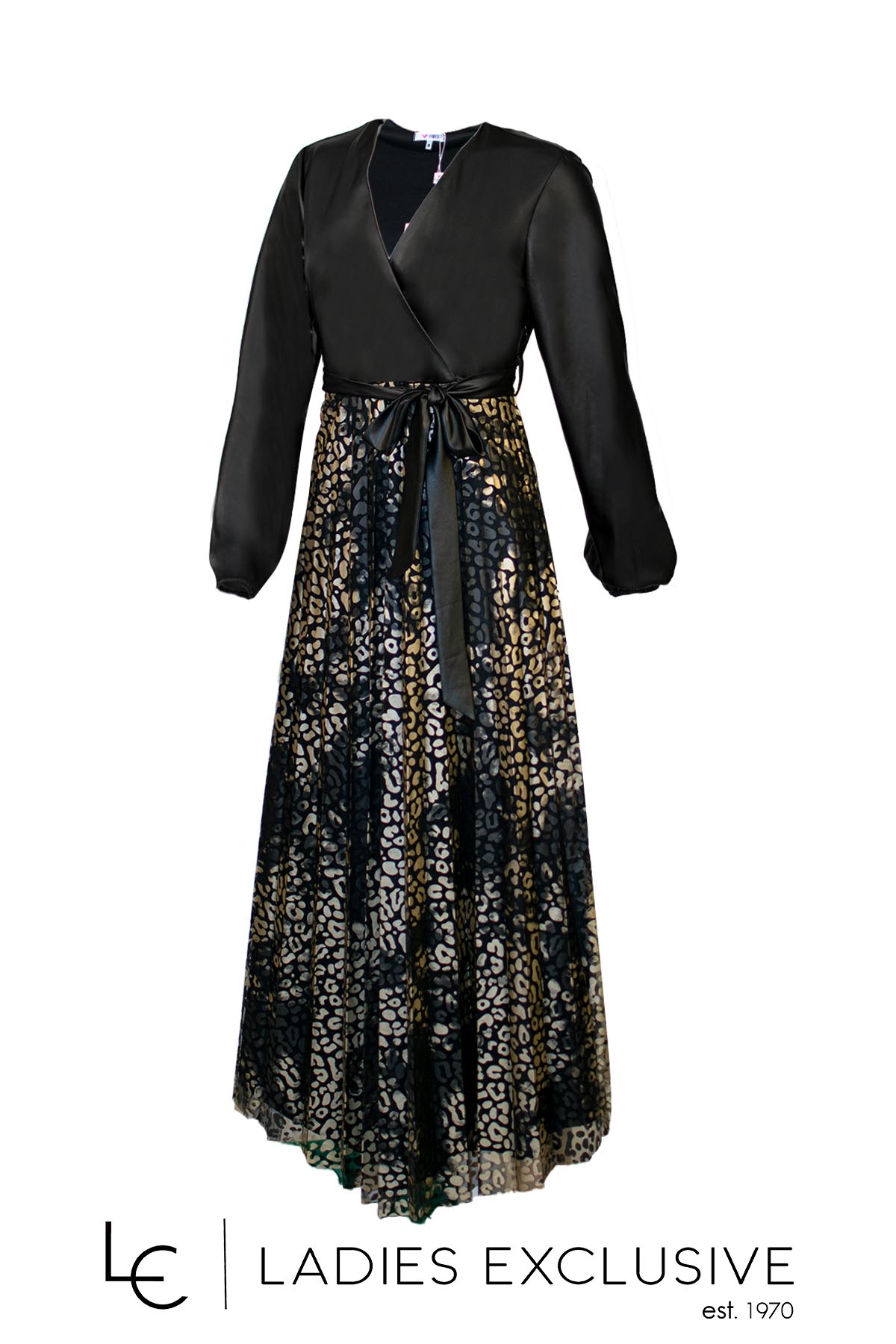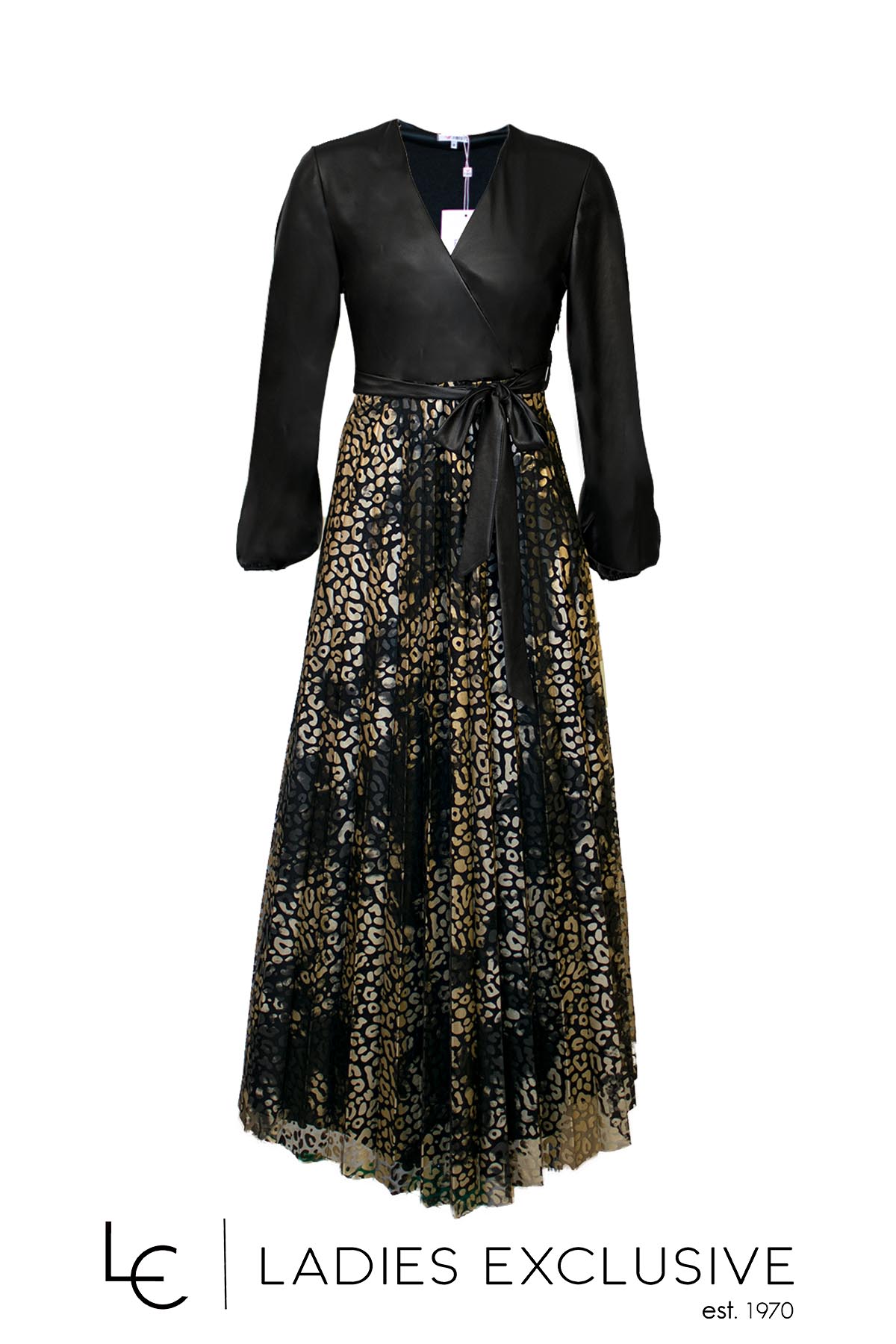VETO Φόρεμα κρουαζέ μακρύ από δερματίνη στο πάνω μέρος και πλισέ animal print στο κάτω. Έχει ζώνη από δερματίνη.