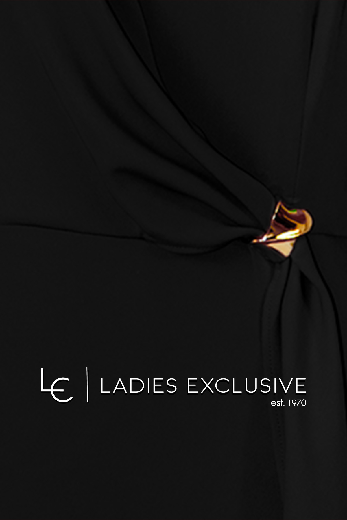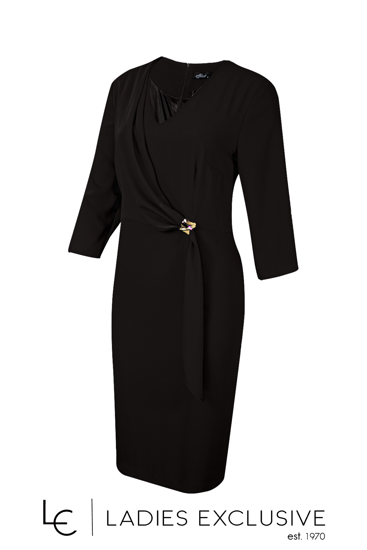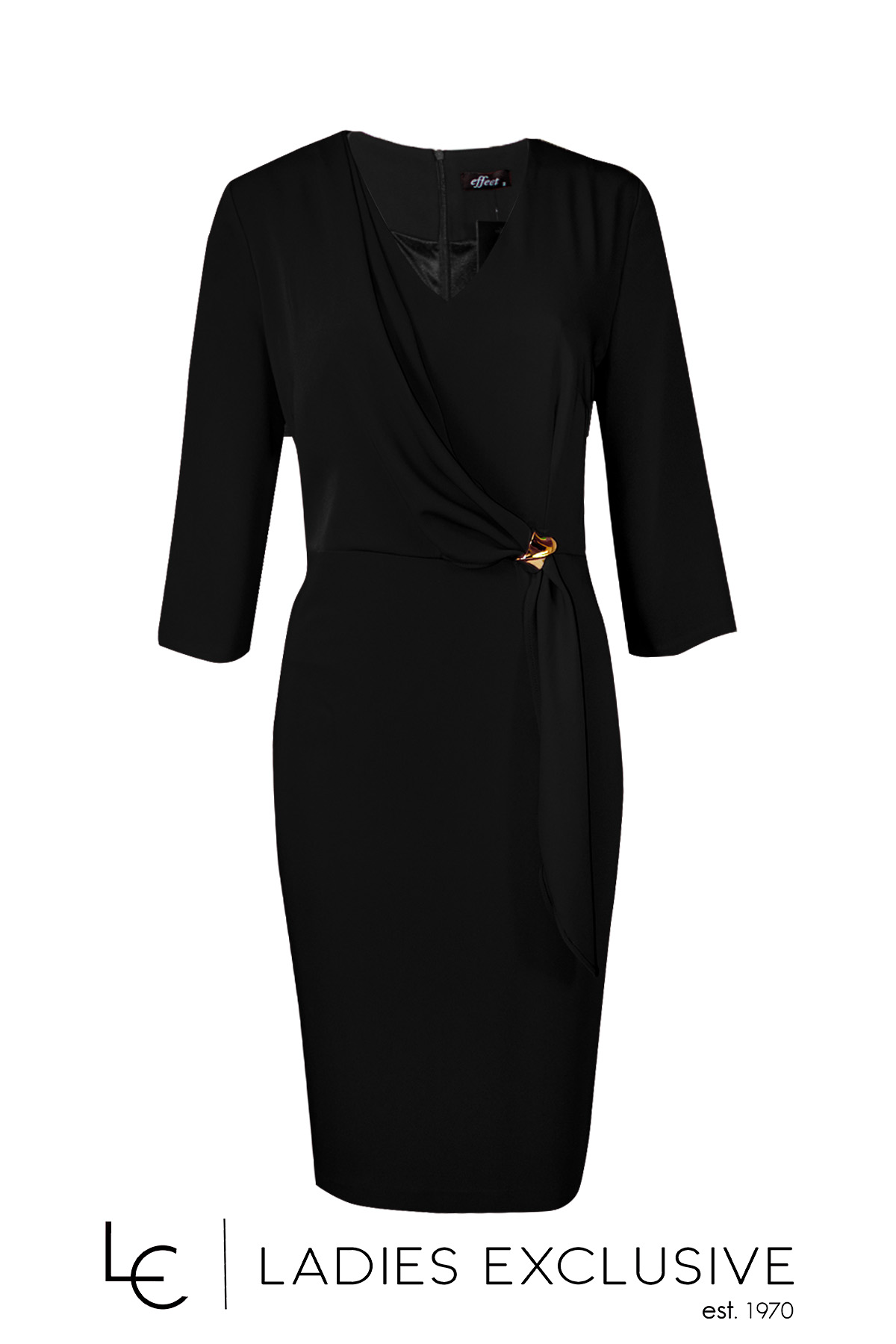 EFFECT Φόρεμα μαύρο κρεπ με ντραπέ σχέδιο με μεταλλίκη λεπτομέρεια, άνοιγμα v και μανίκι 3/4.