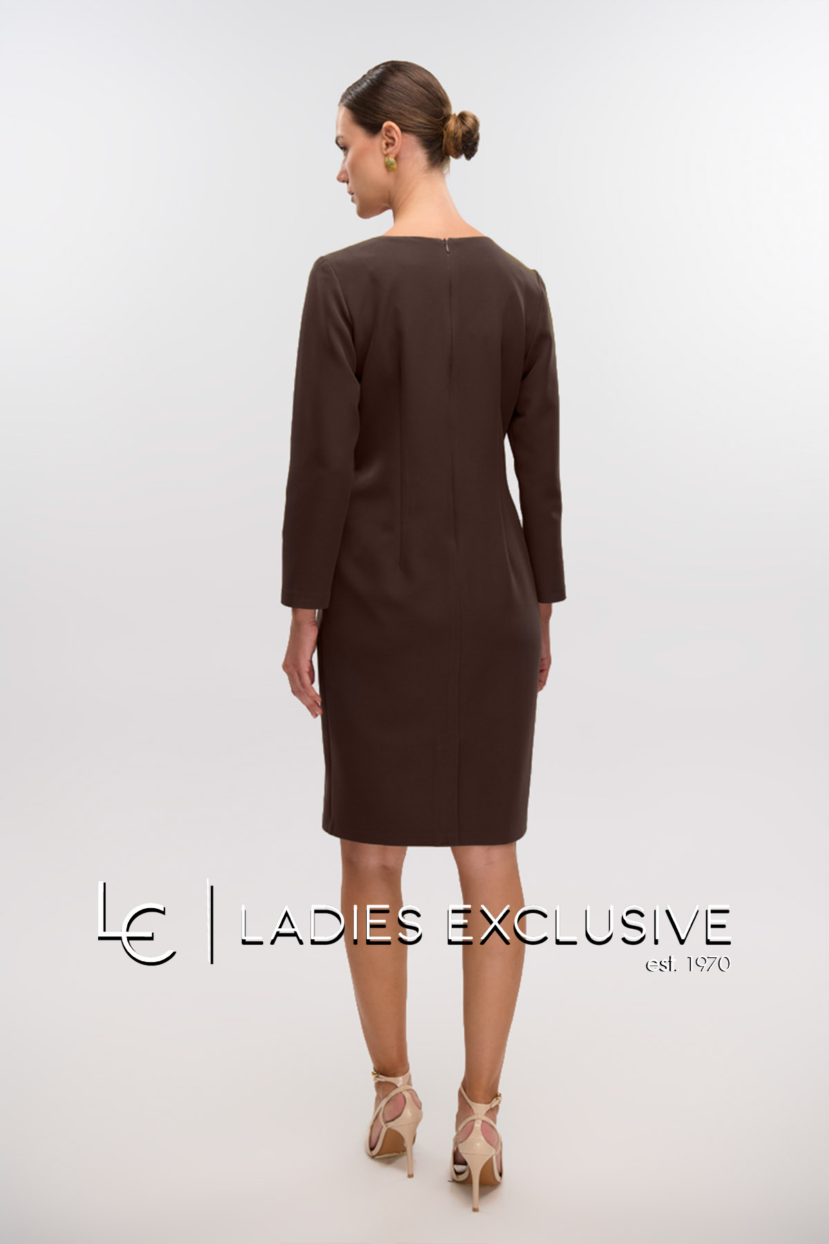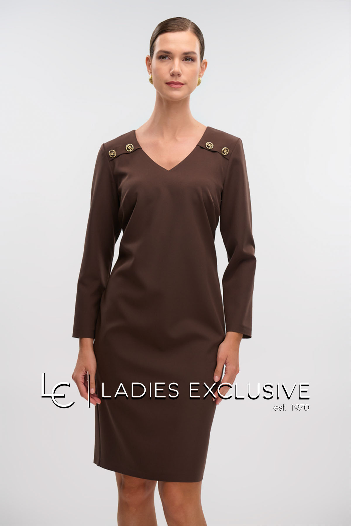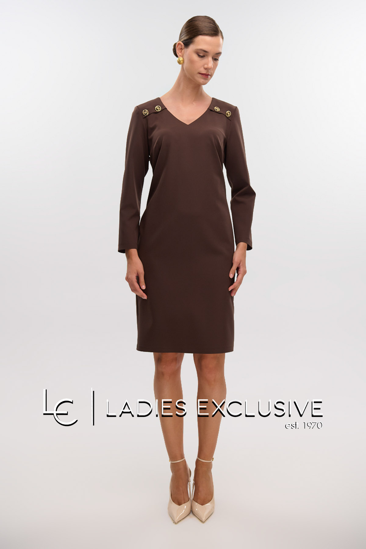 FIBES Φόρεμα καφέ κρεπ σε ίσια γραμμή, με άνοιγμα v και μανίκι 3/4. Στο μπροστινό μέρος έχει διακοσμητικά κουμπιά.
