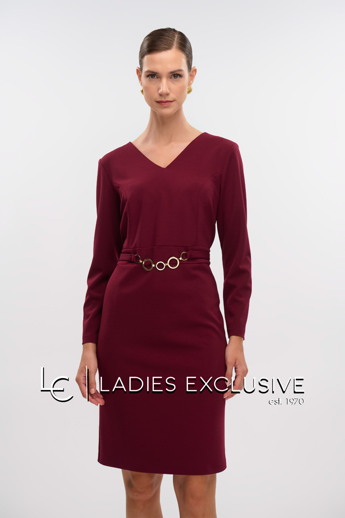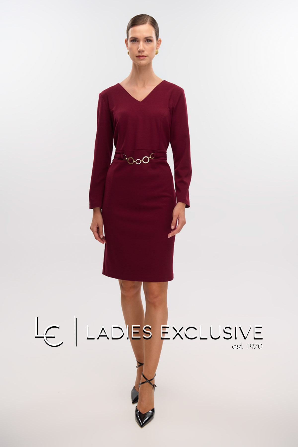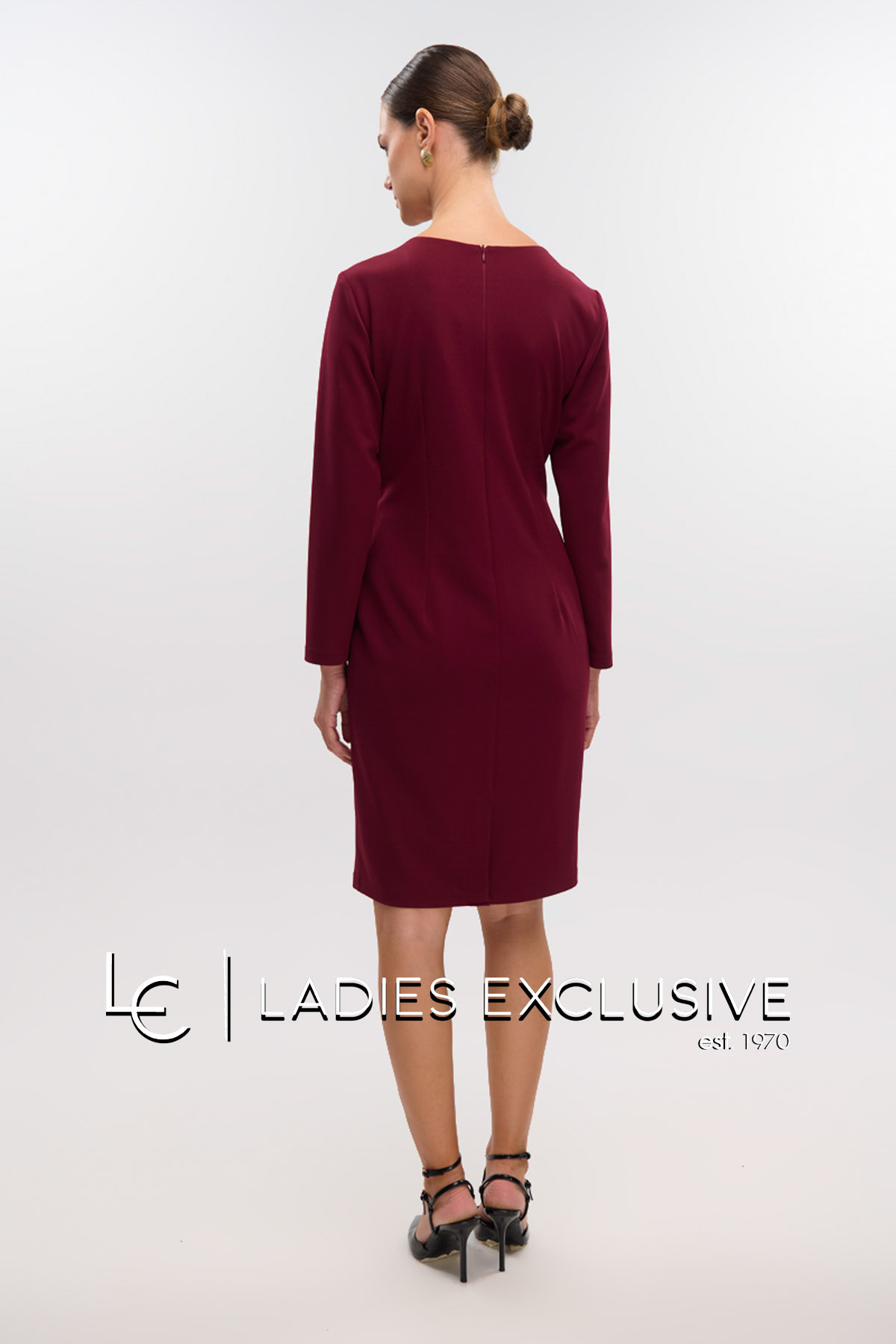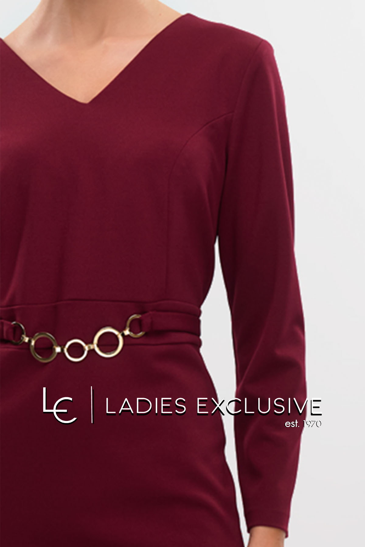 FIBES Φόρεμα μπορντώ κρεπ σε ίσια γραμμή με άνοιγμα v και διακοσμητική αγκράφα με κρίκους στη μέση.