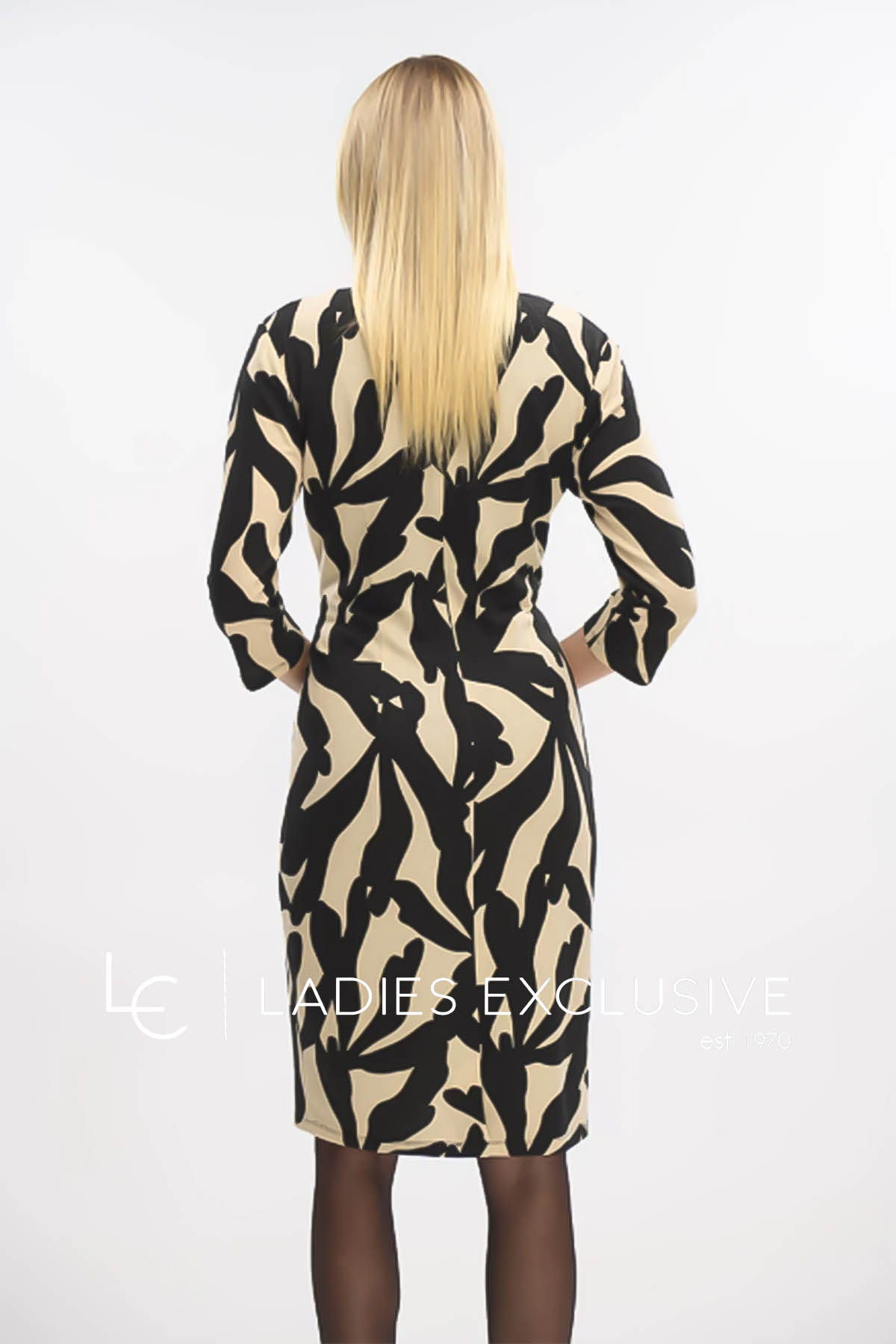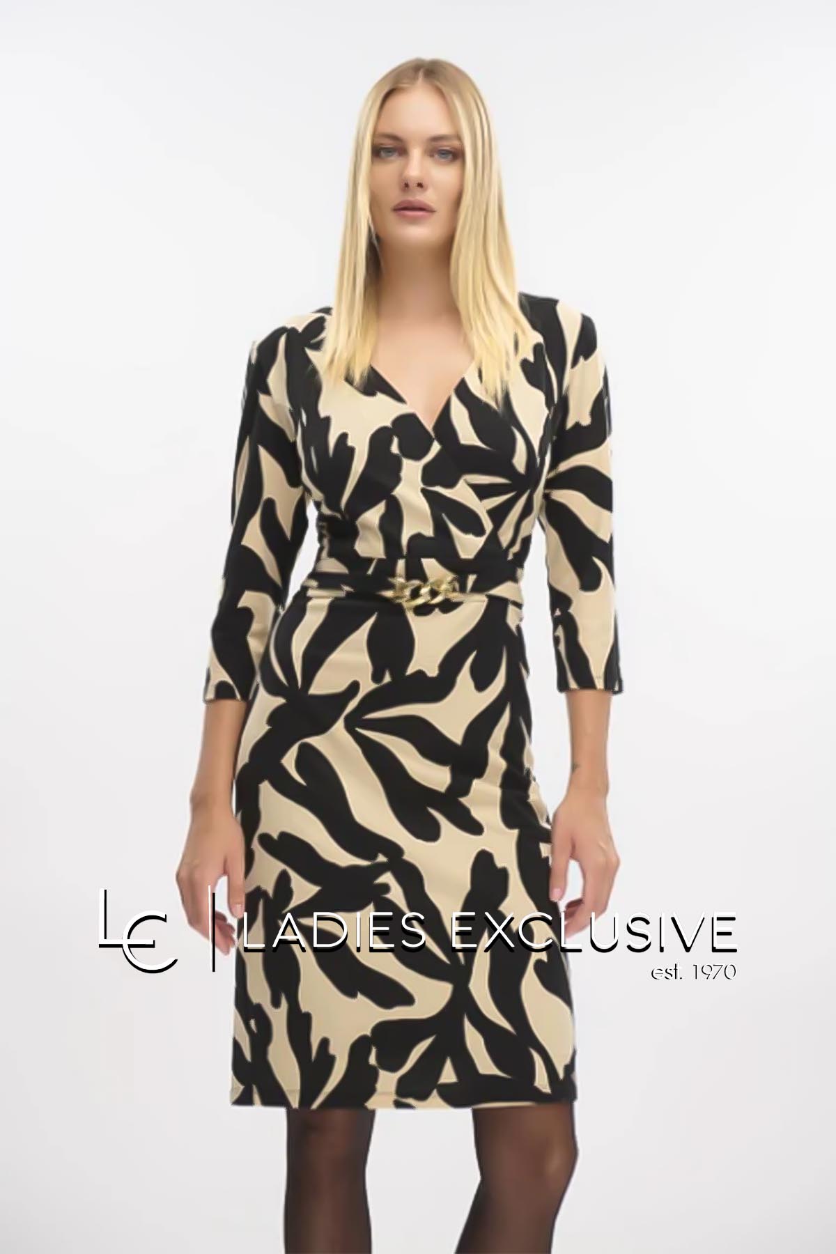 FIBES Φόρεμα ασπρόμαυρο σε ίσια γραμμή κρουαζέ, με μεταλλική λεπτομέρεια στη μέση.