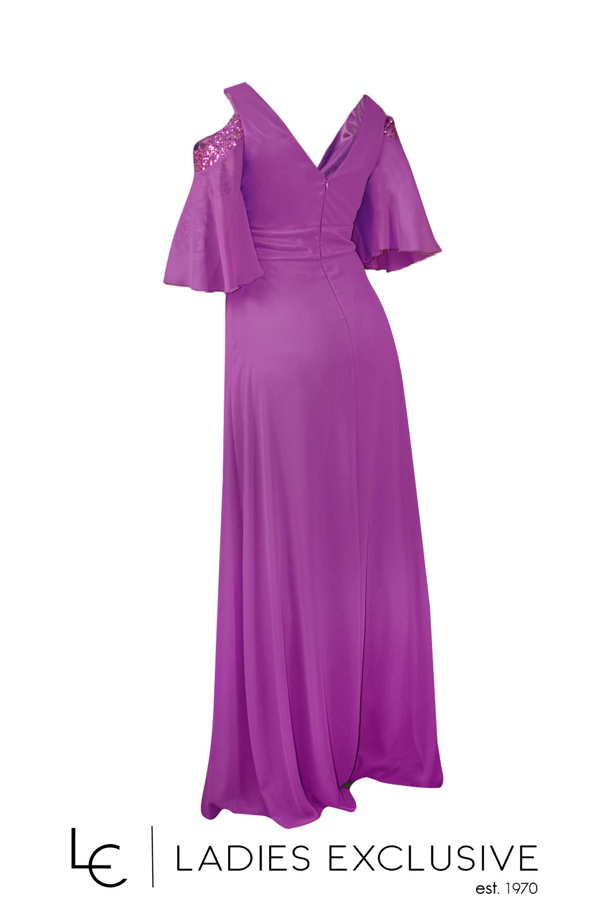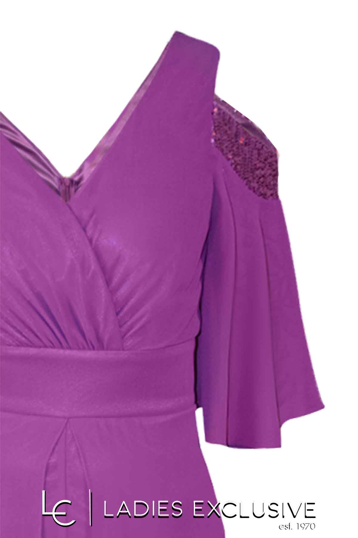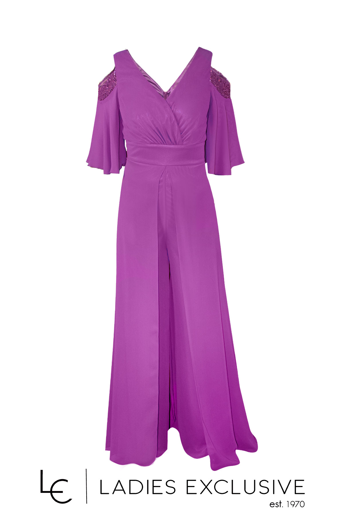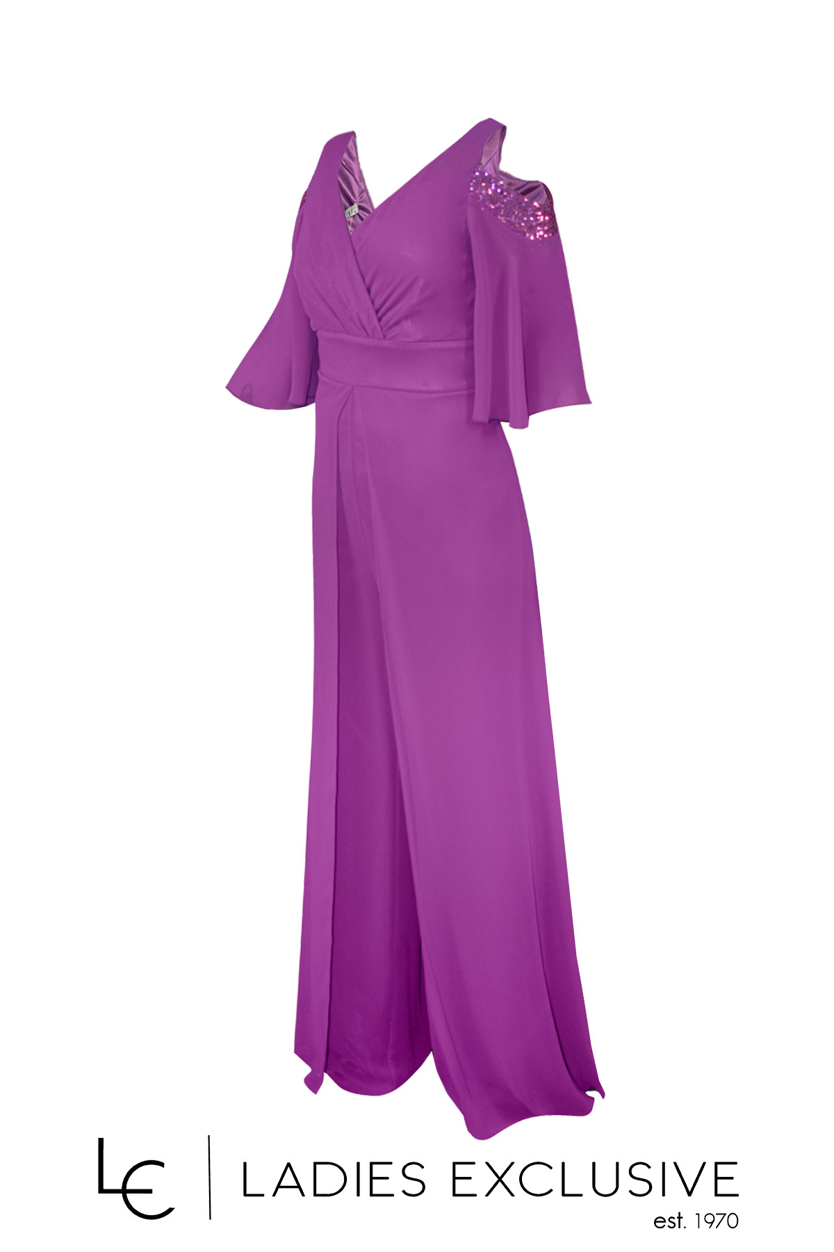 EFFECT Φόρμα ματζέντα ολόσωμη βραδινή από μουσελίνα, με παγιέτες και ιδιαίτερο άνοιγμα στους ώμους.