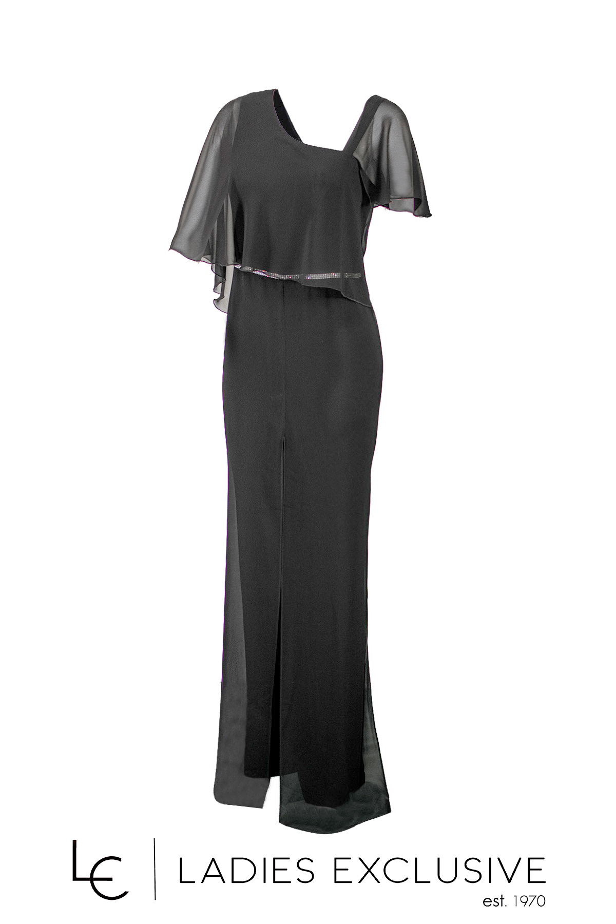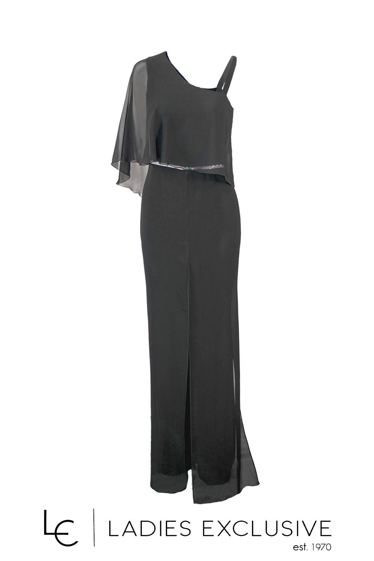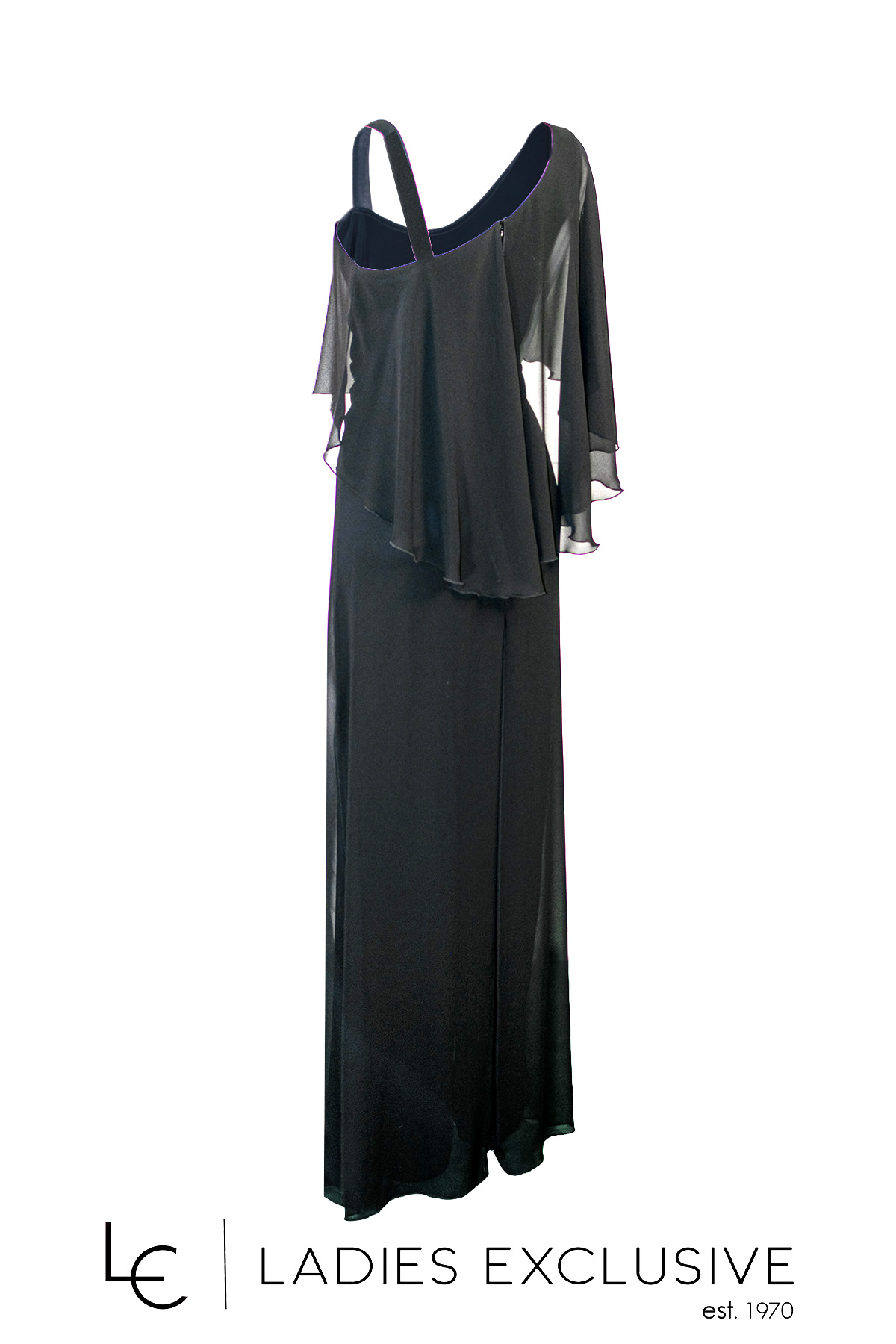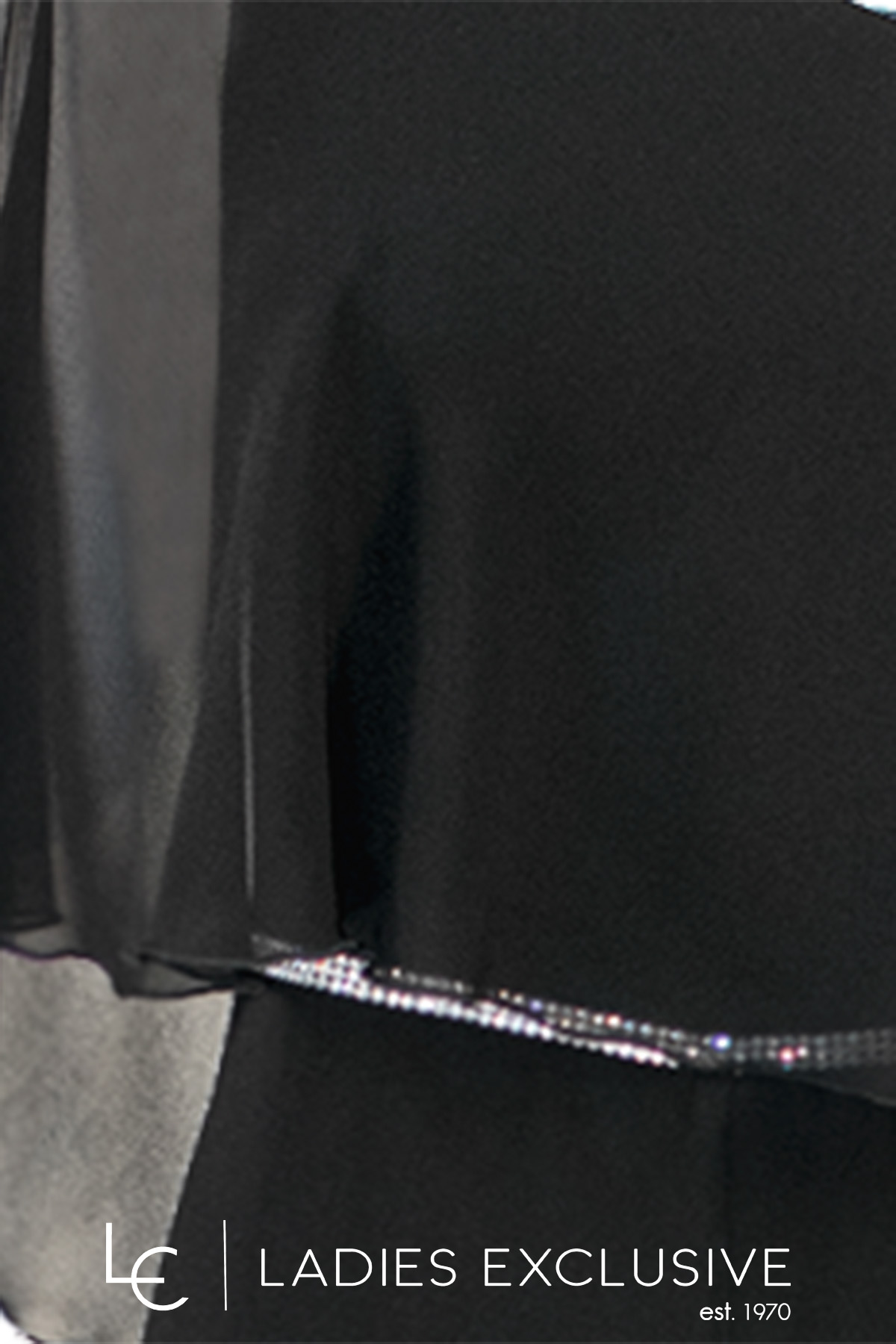 STELLA DERLOU Φόρμα ολόσωμη βραδινή διπλή μαύρη, εσωτερικά από ελαστικό κρεπ, εξωτερικά ριχτή, αέρινη μουσελίνα. Στον ένα ώμο έχει φαρδιά ράντα και στον άλλο πέφτει η μουσελίνα. Διαθέτει επιπλέον ύφασμα για να μπει μανίκι στον ακάλυπτο ώμο.