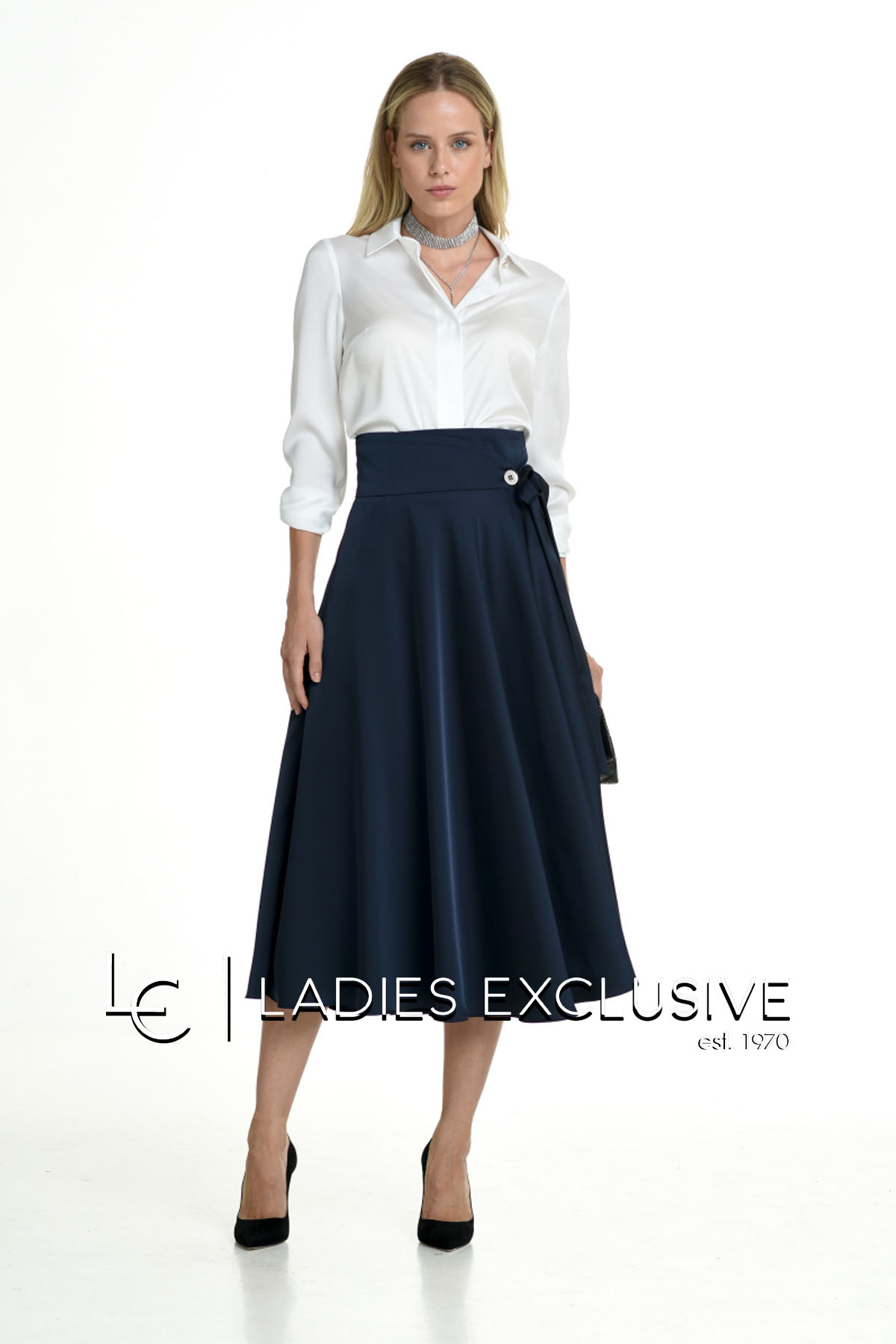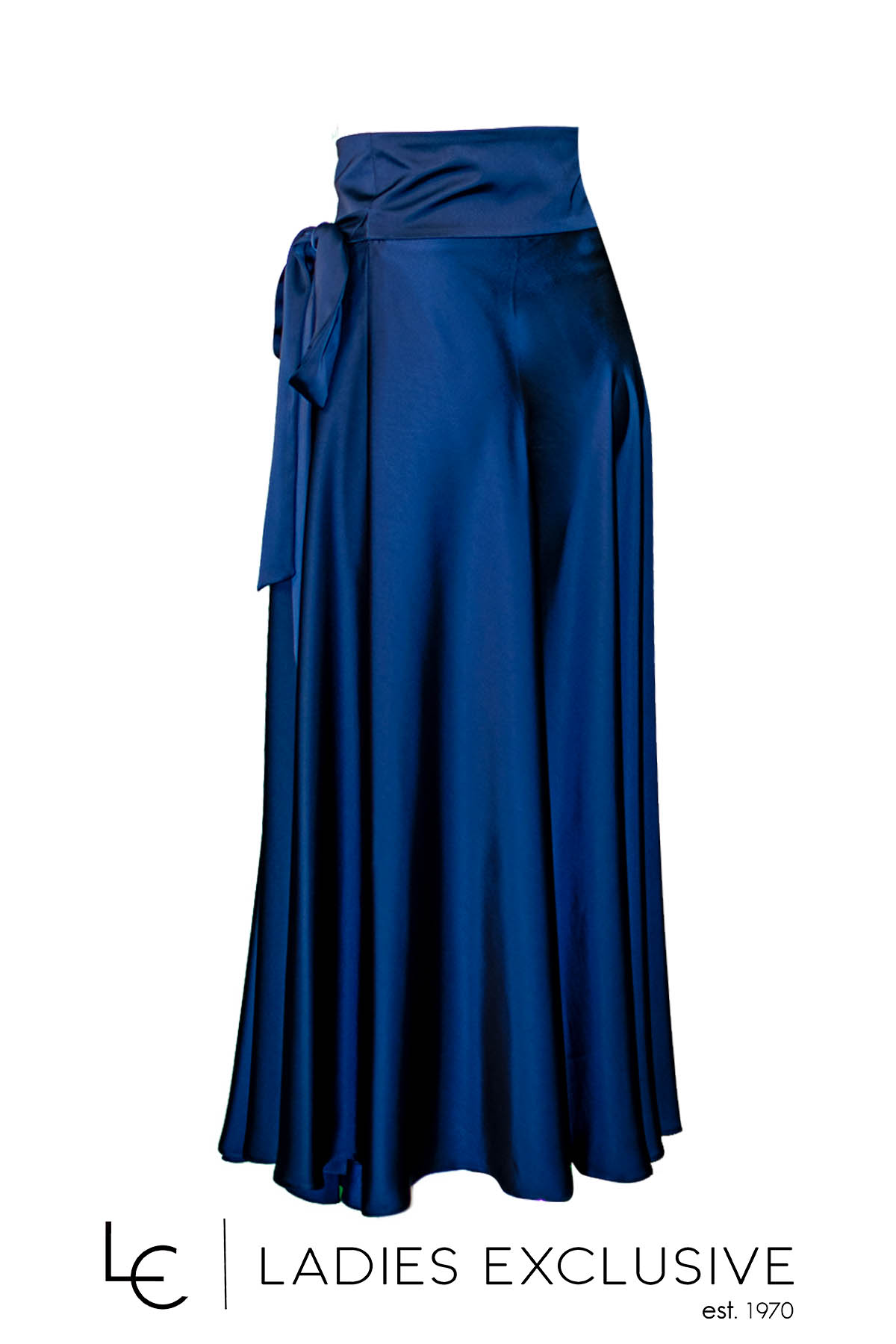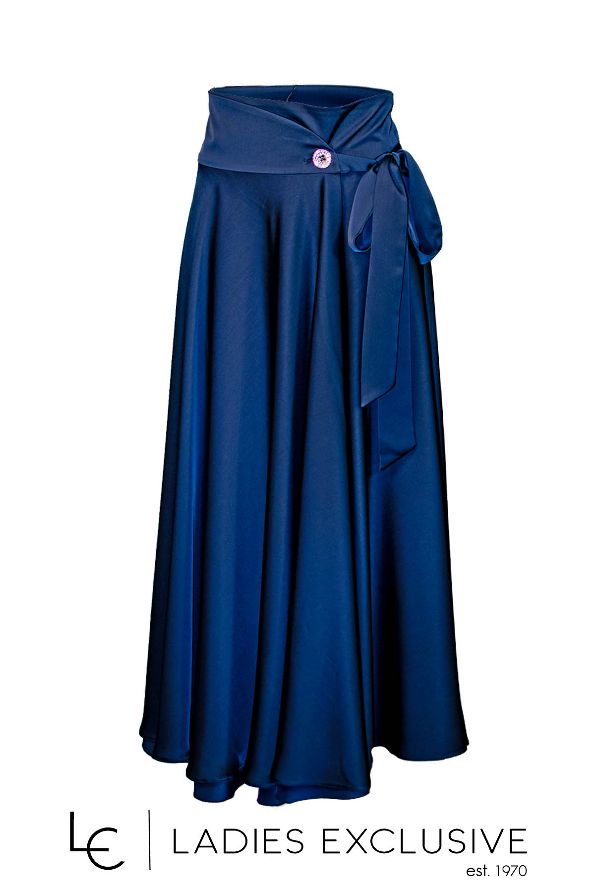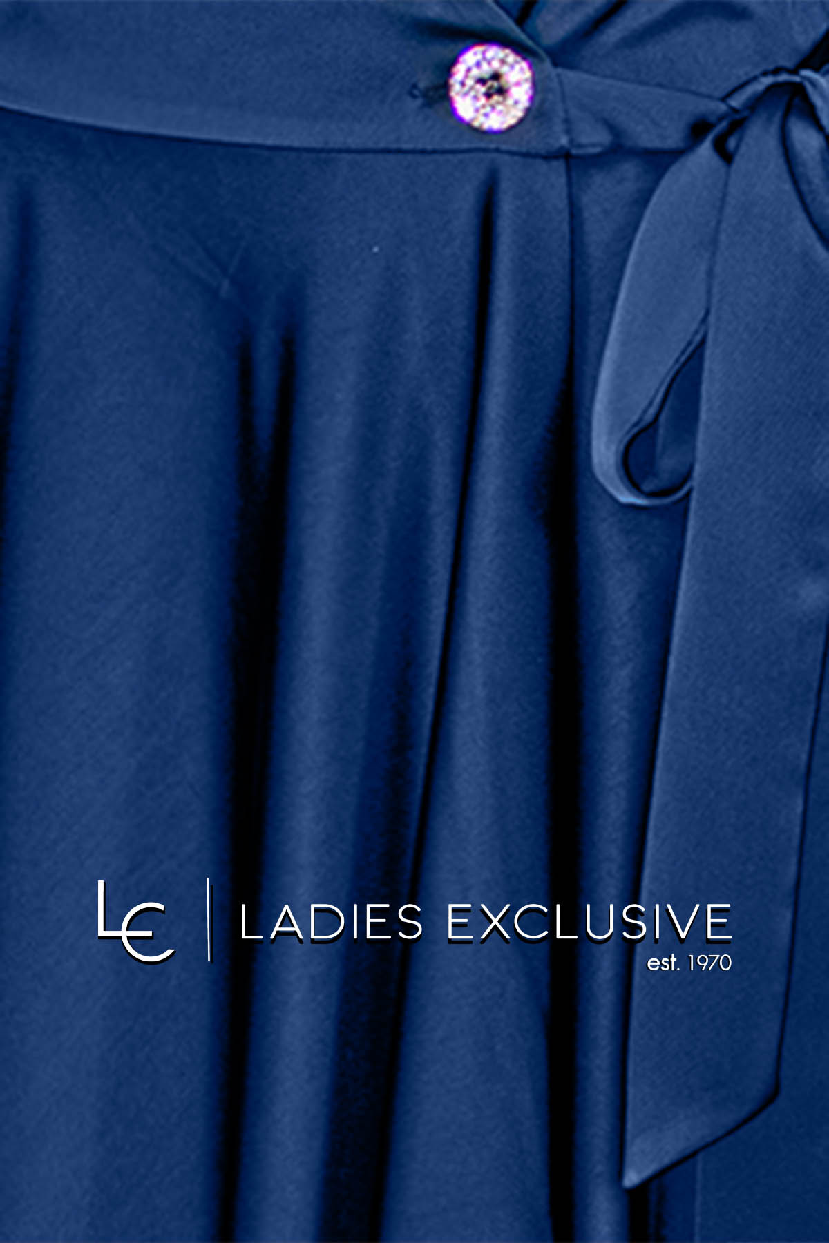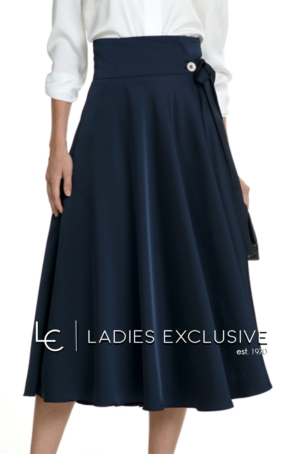 ESTEL Φούστα μπλε σατέν φάκελος κλος, που δένει στο πλάι και έχει ιδιαίτερο κουμπί.