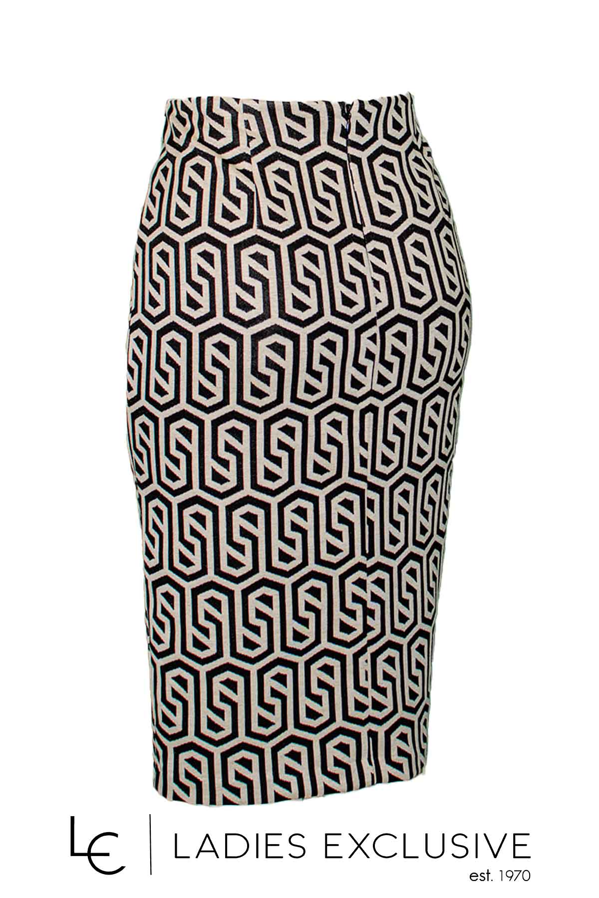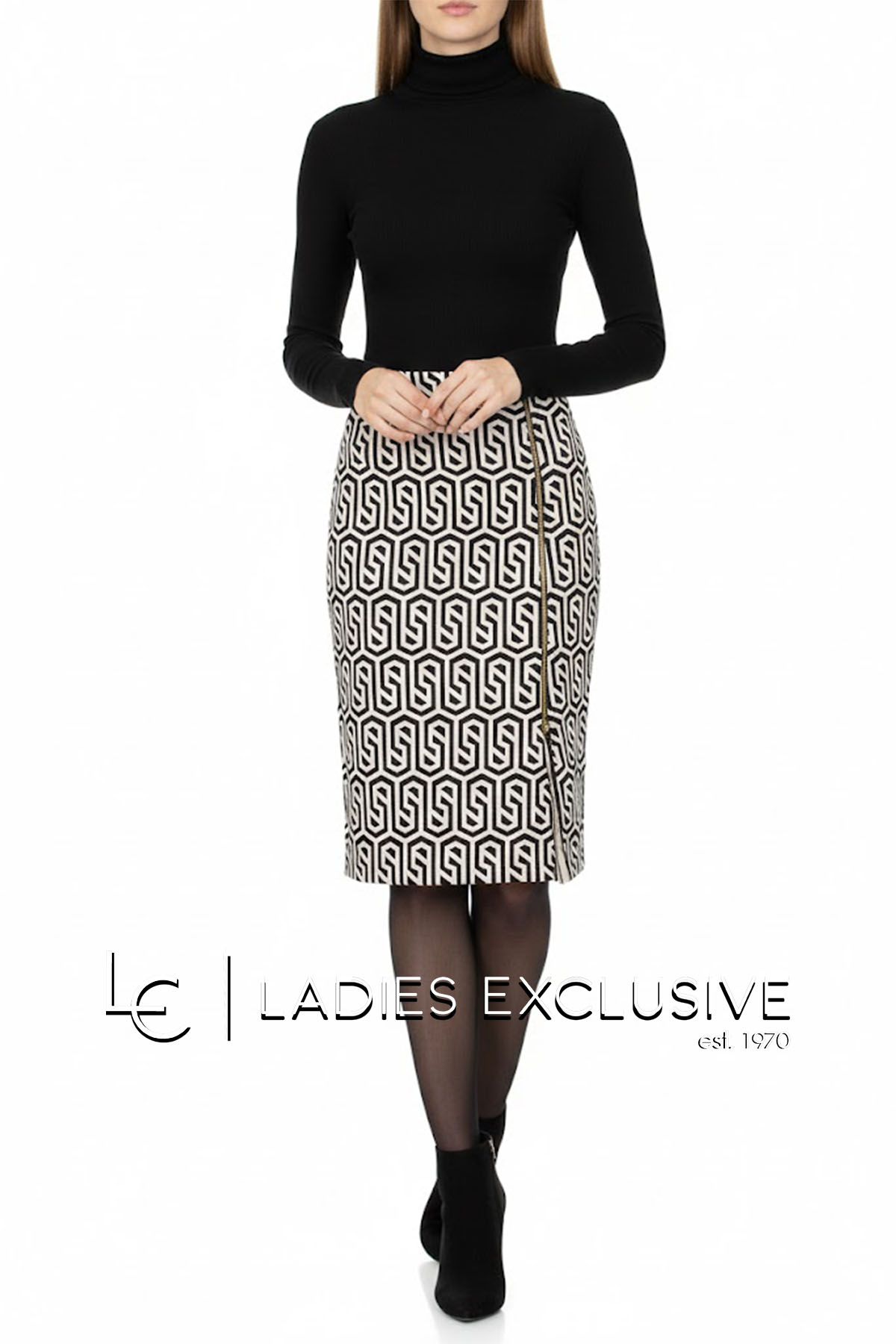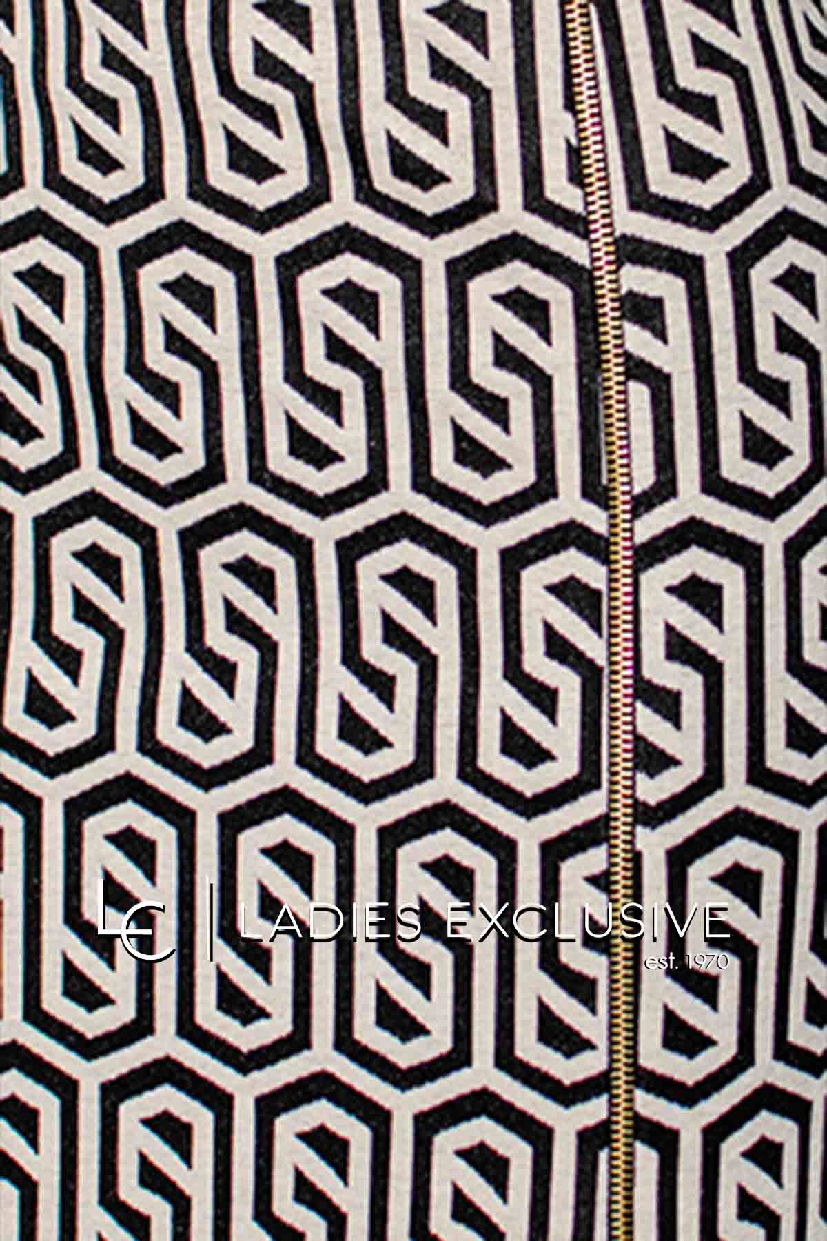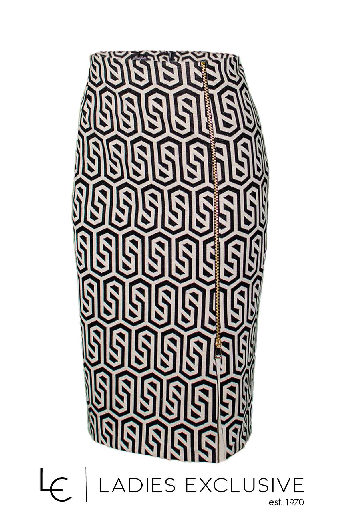 LUCIFAIR Φούστα ασπρόμαυρη μίντι ελαστική με φερμουάρ που ανοίγει μπροστά και κάνει σκίσιμο.
