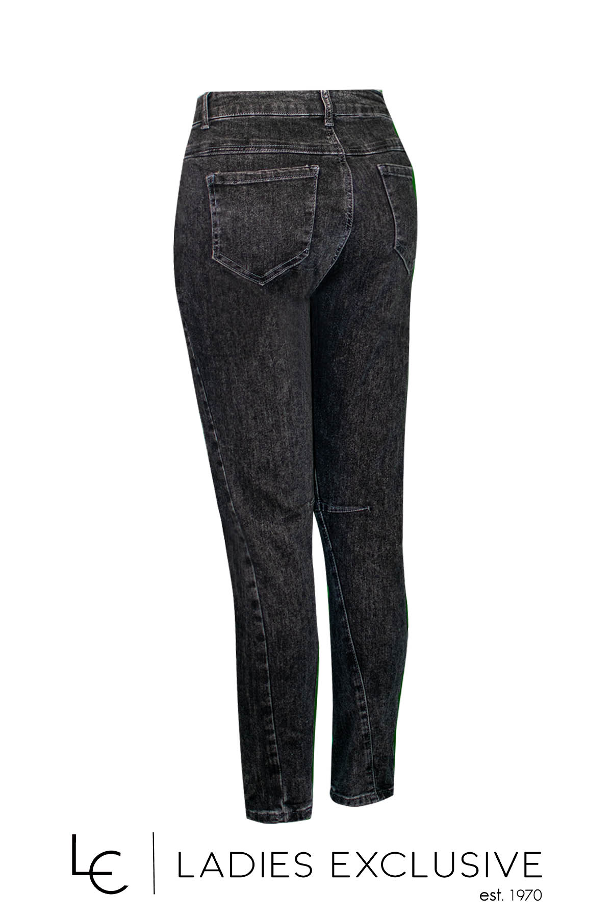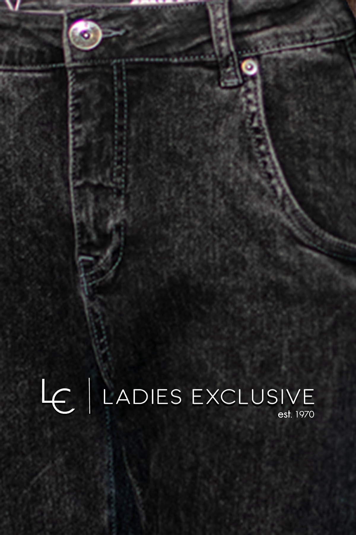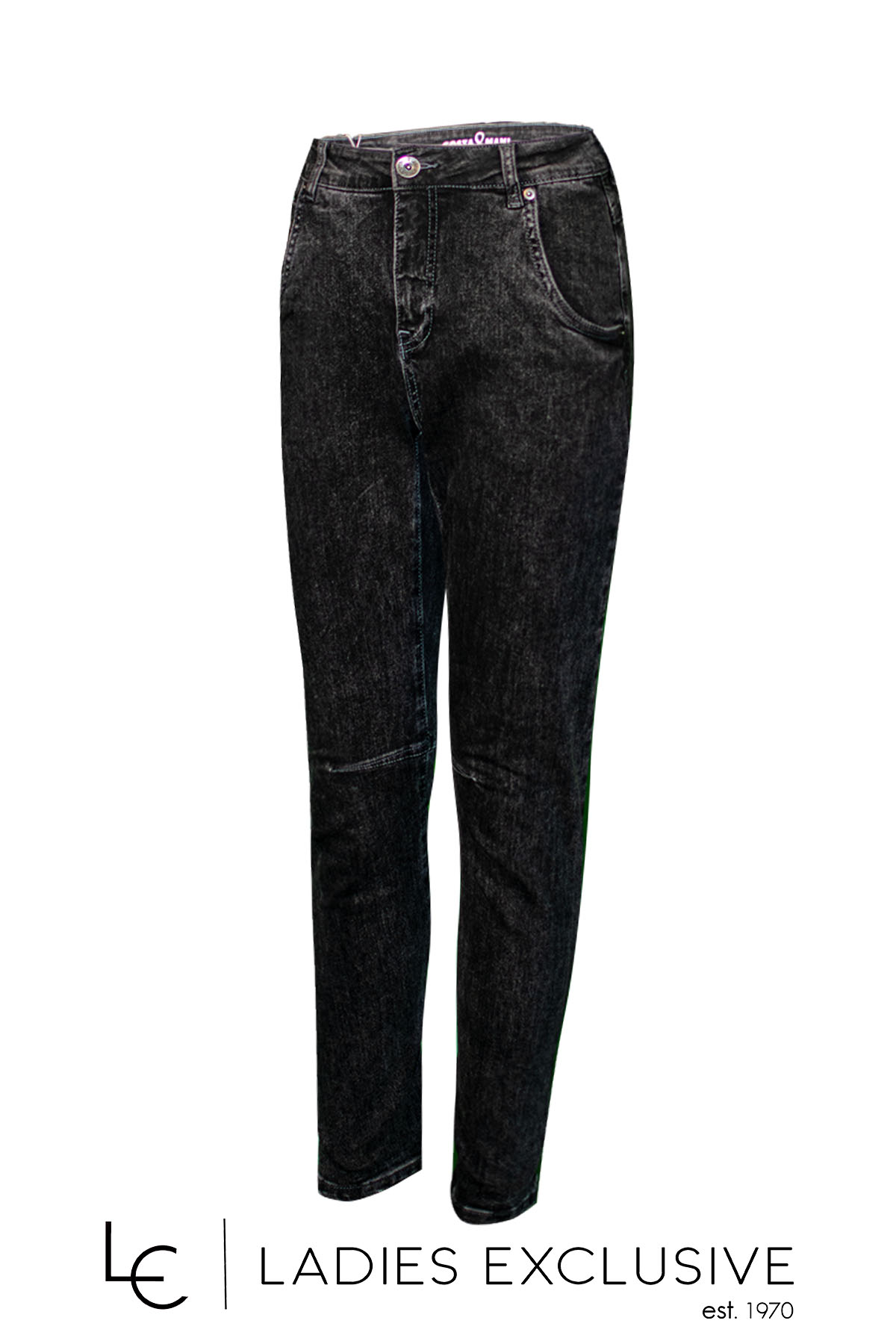 COSTA MANI Παντελόνι μαύρο τζην, με πλαϊνές τσέπες και ασύμμετρες ραφές στο κάτω μέρος. Είναι ελαστικό.