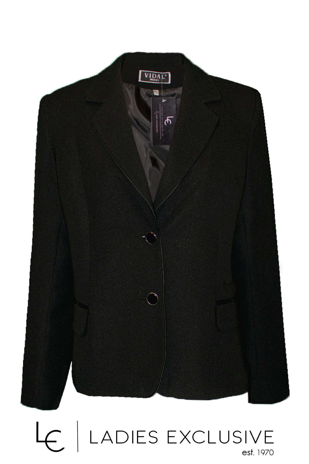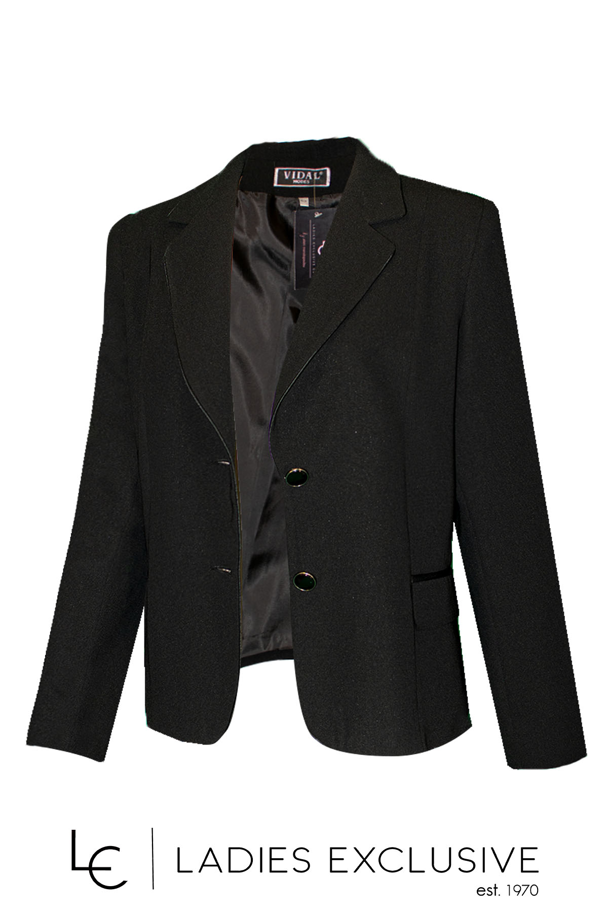 VIDAL Σακάκι μαύρο κρεπ με σατέν τελειώματα και τσέπες με καπάκι. Είναι σετ με τη φούστα με κωδ. 102.01.