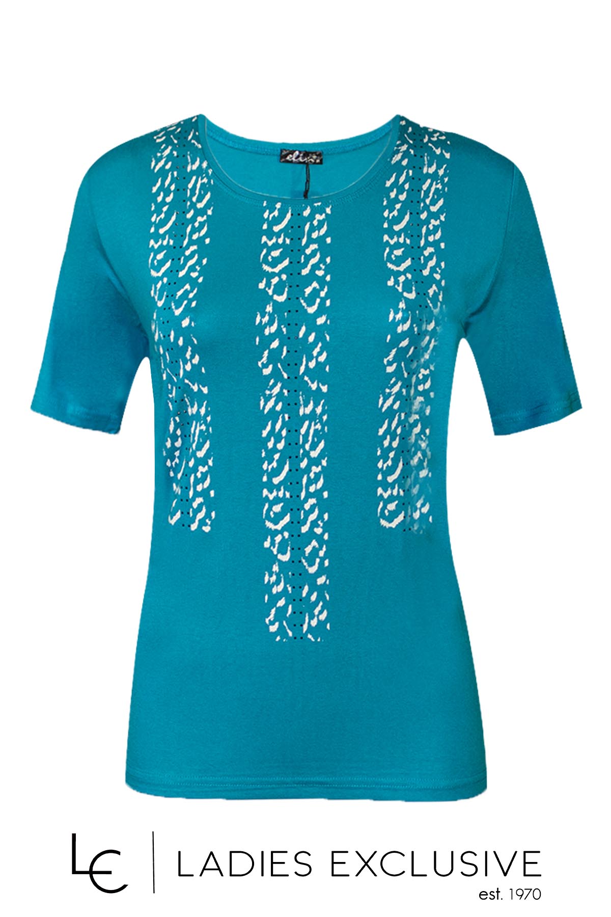 ELIN Μπλούζα τιρκουάζ κοντομάνικη με στάμπα και στρας.