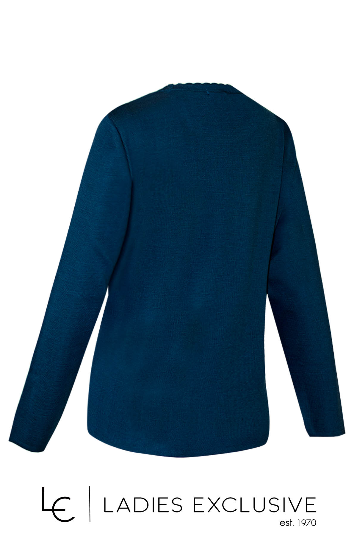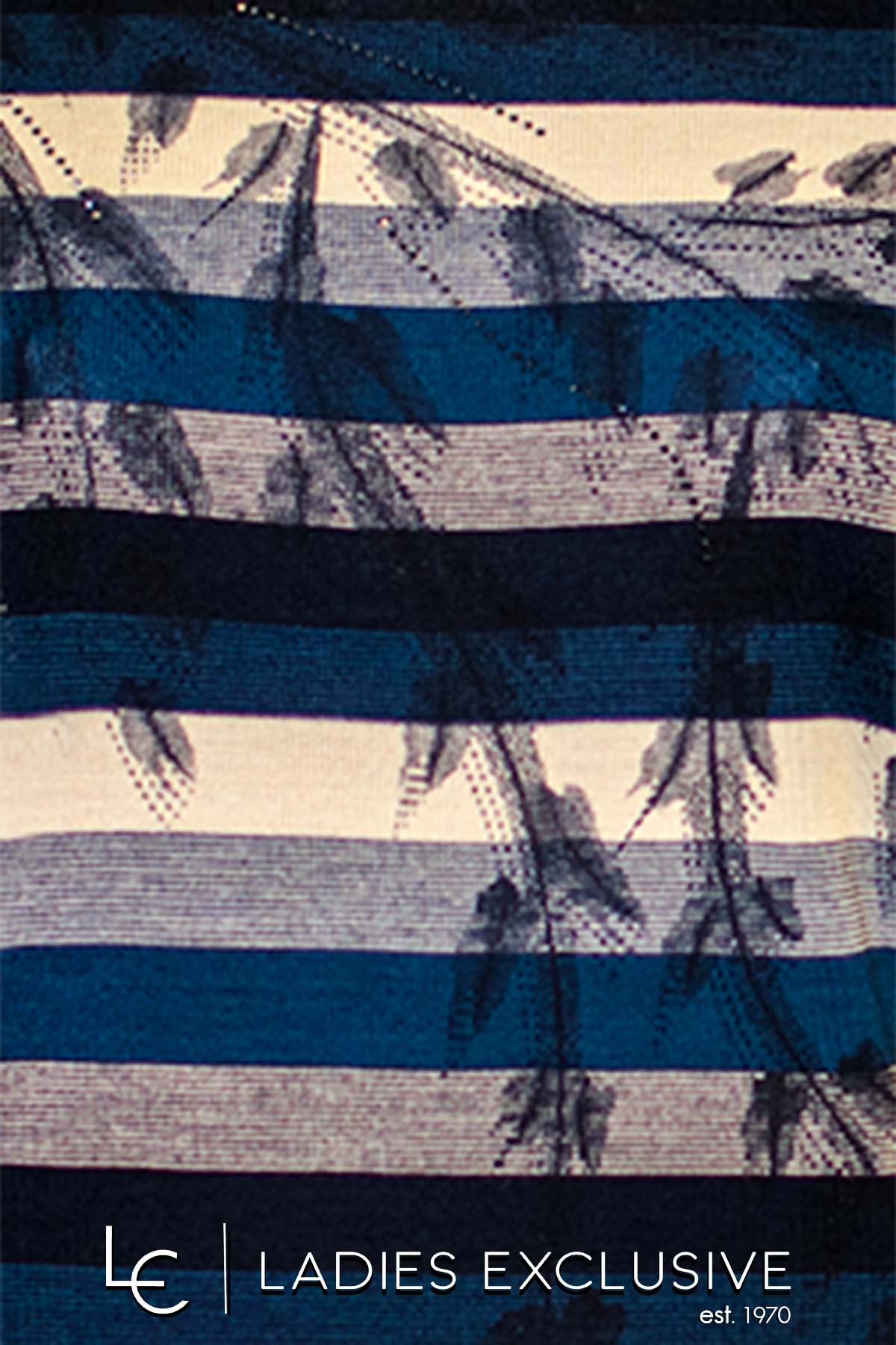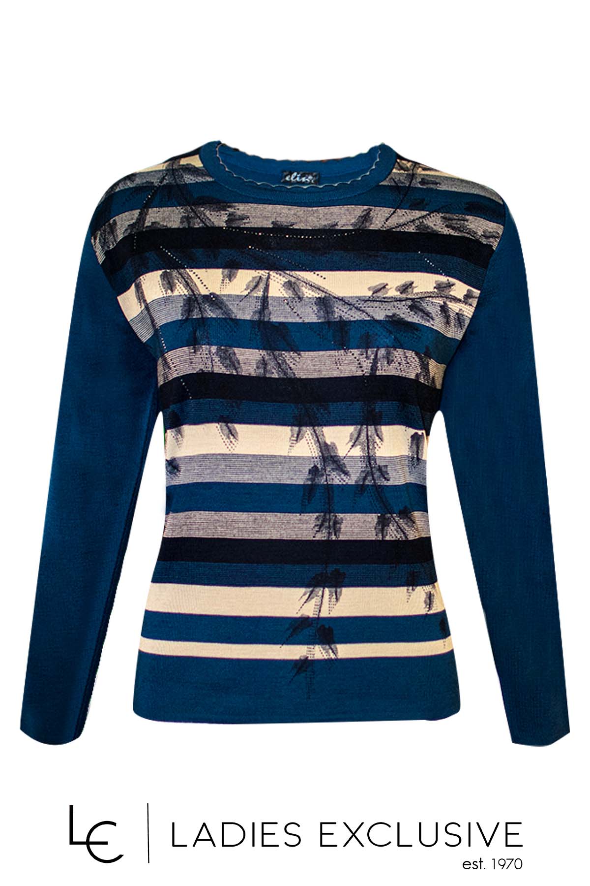 ELIN Μπλούζα μάλλινη με ρίγες πετρόλ και μπεζ και φύλλα. Έχει ιδιαίτερη λαιμόκοψη με σχέδιο.