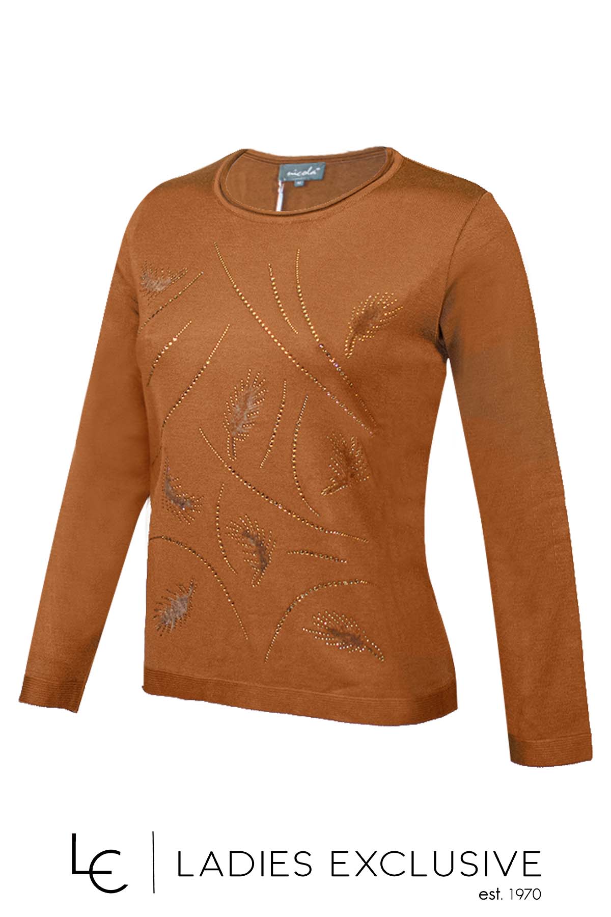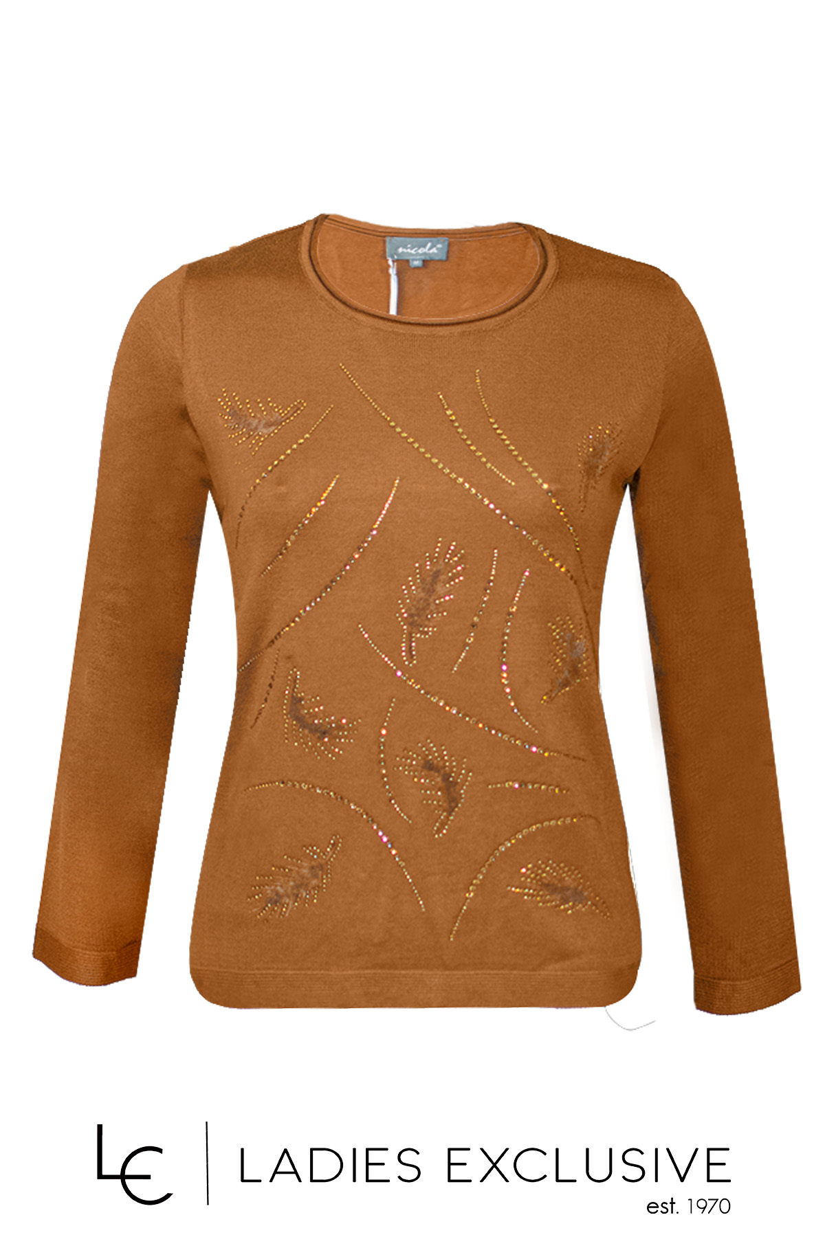 NICOLA Μπλούζα ταμπά με στρας και λαιμόκοψη. Στην ύφανση έχει ανάγλυφα βελούδινα φύλλα.