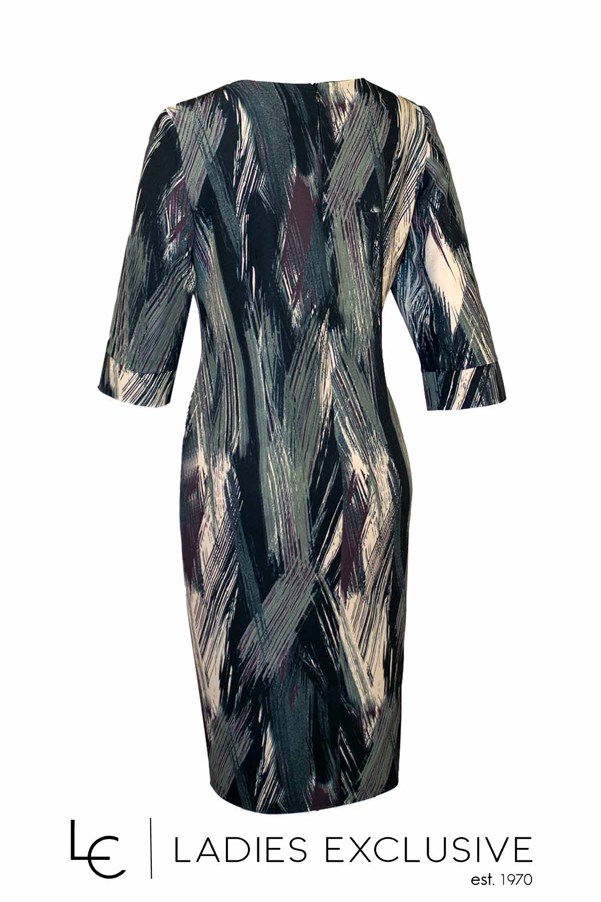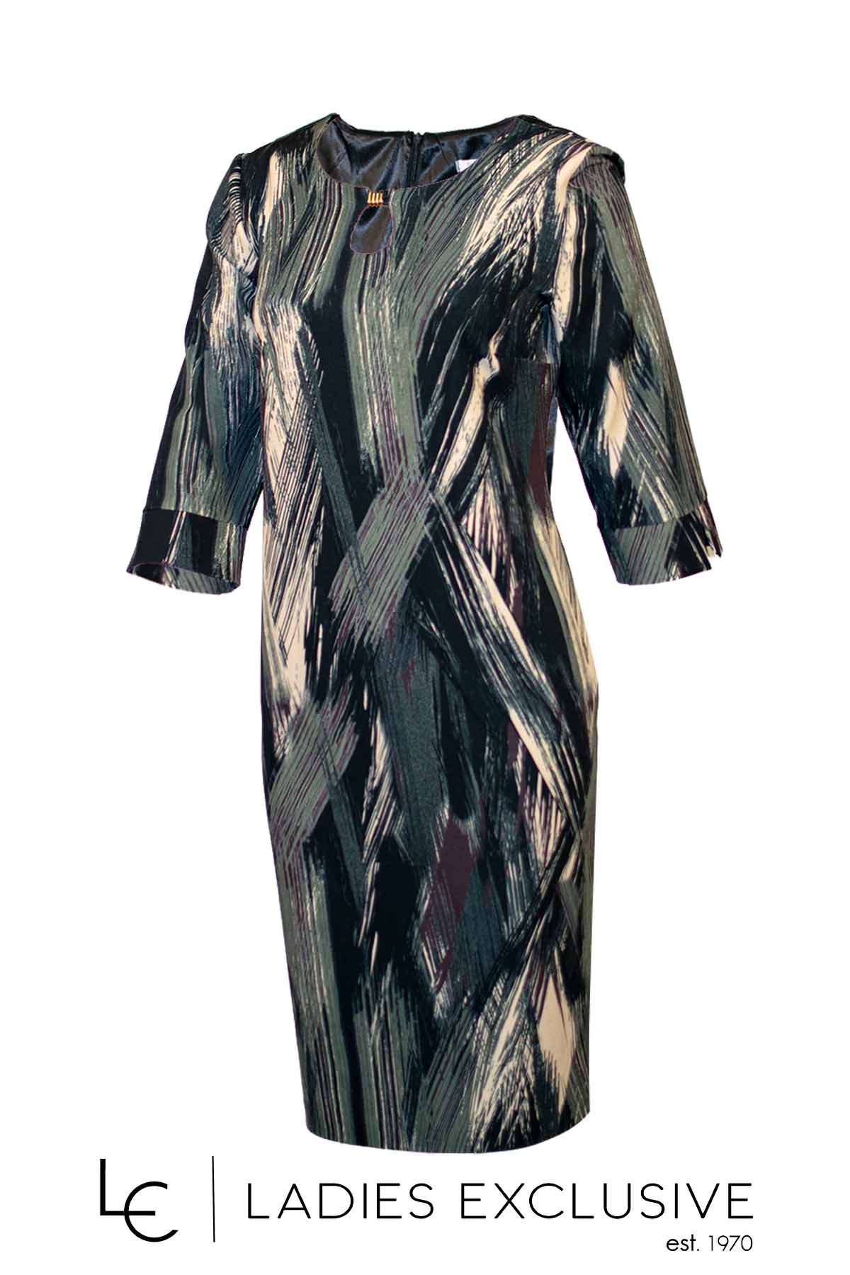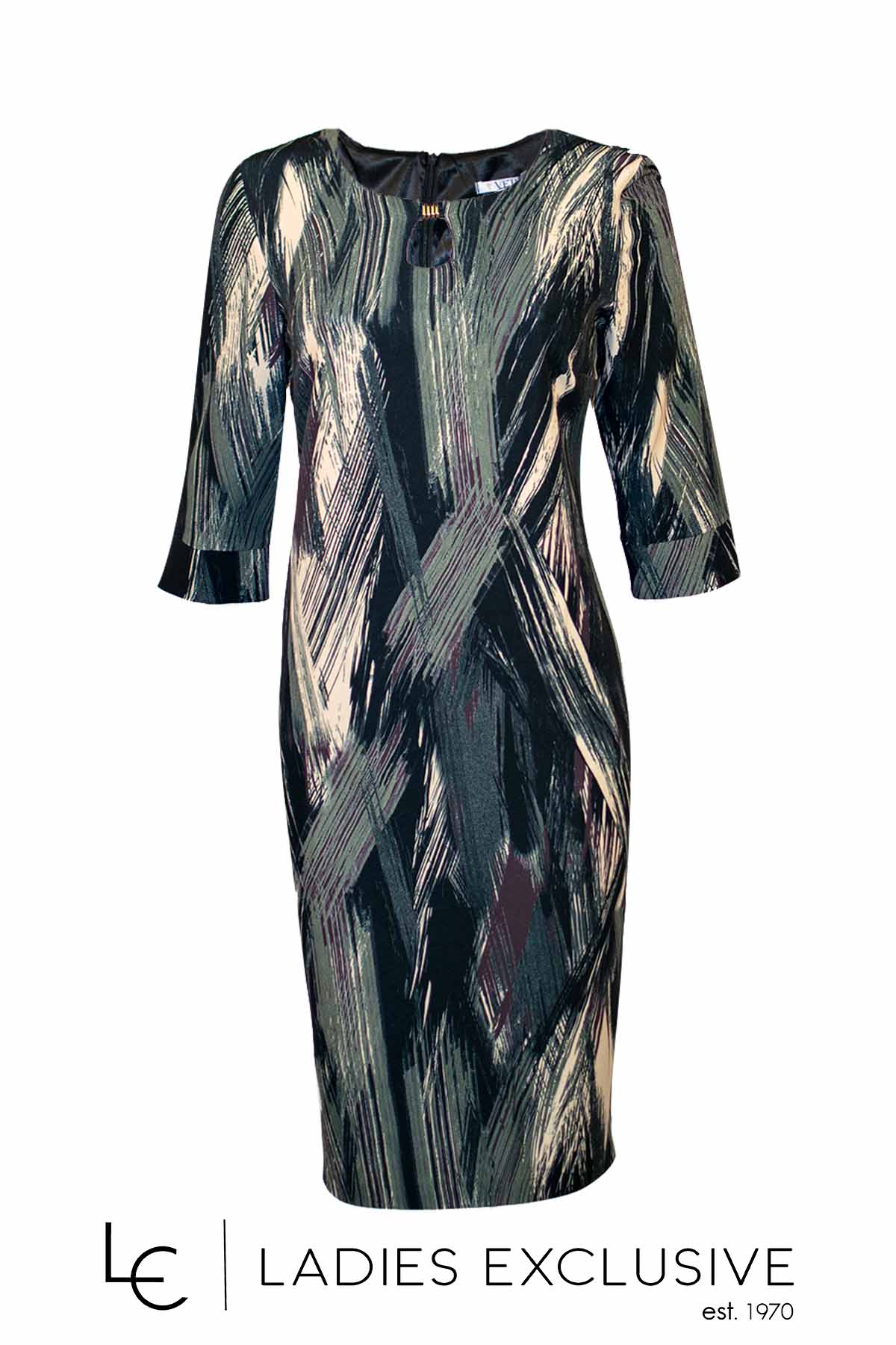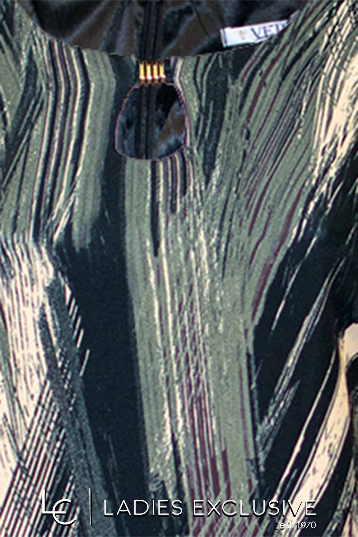 VETO Φόρεμα εμπριμέ κρεπ σε ίσια γραμμή, με μανίκι 3/4 και ιδιαίτερο άνοιγμα στο μπροστινό μέρος.