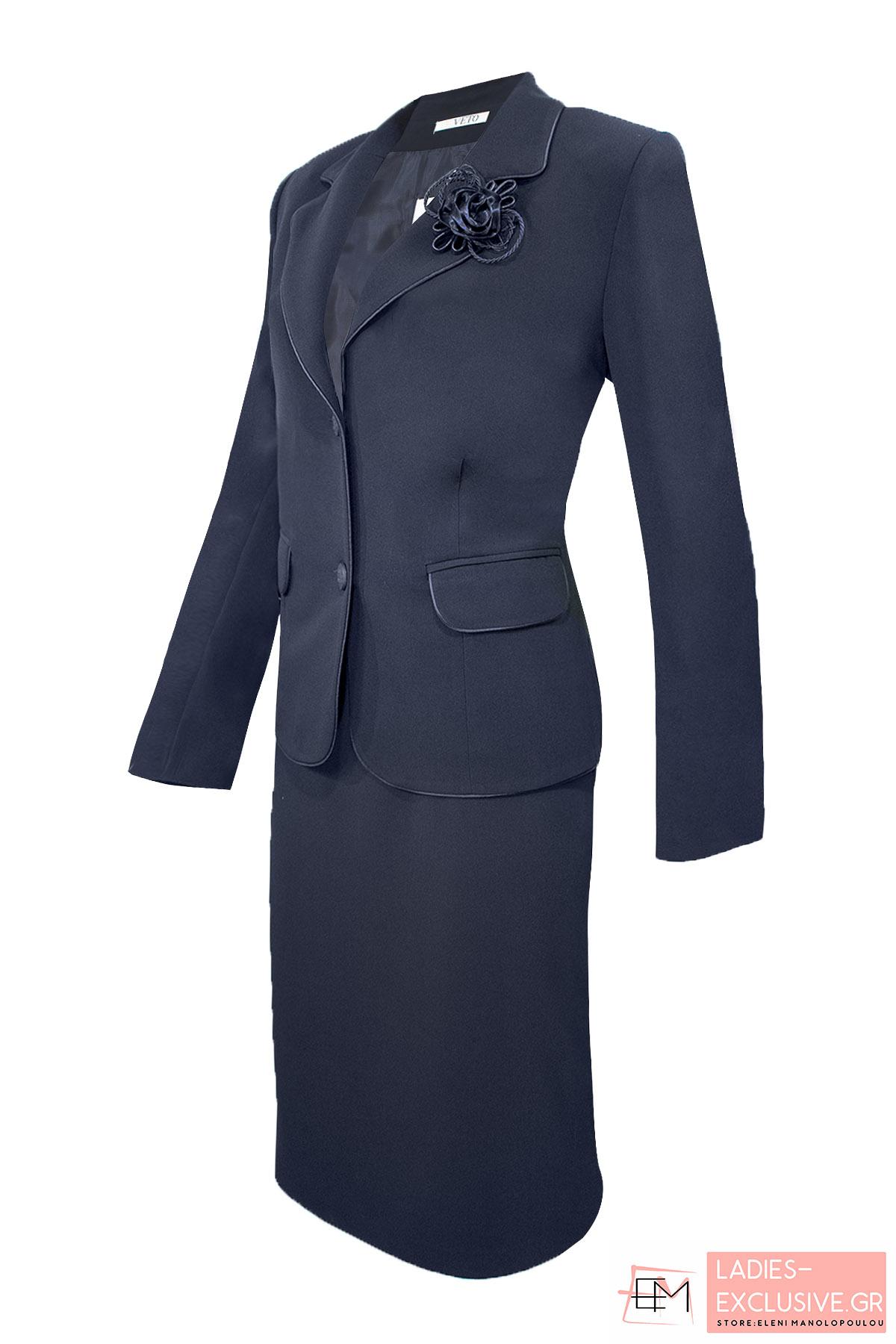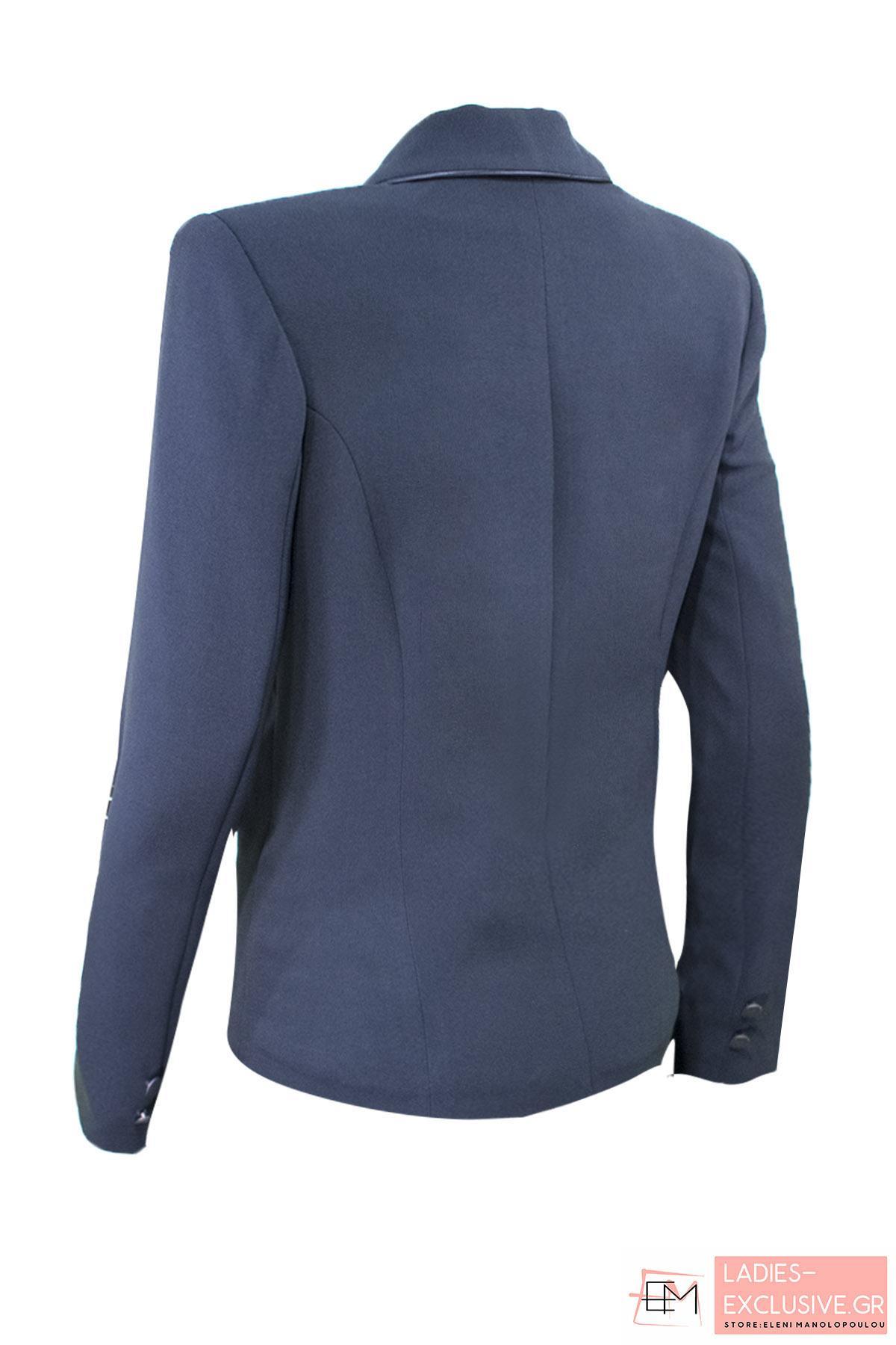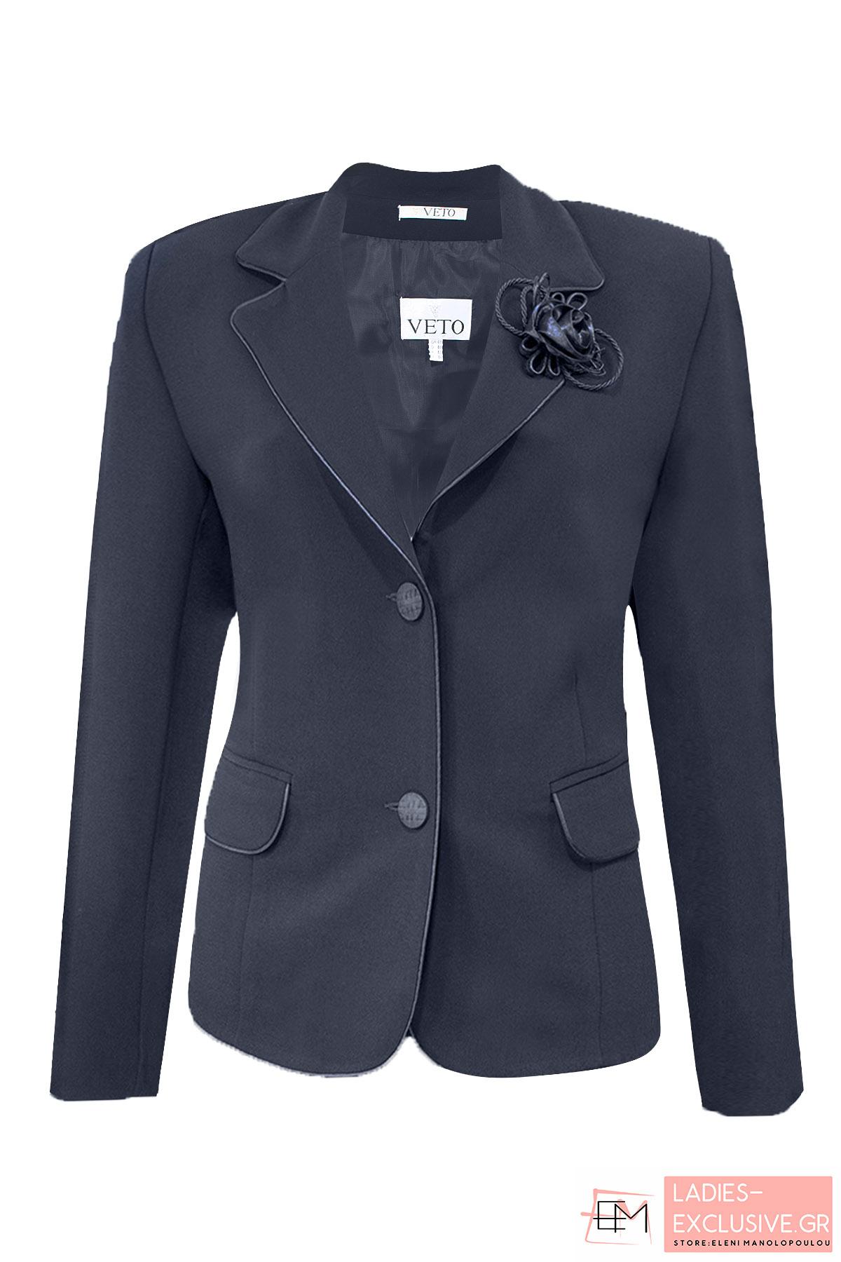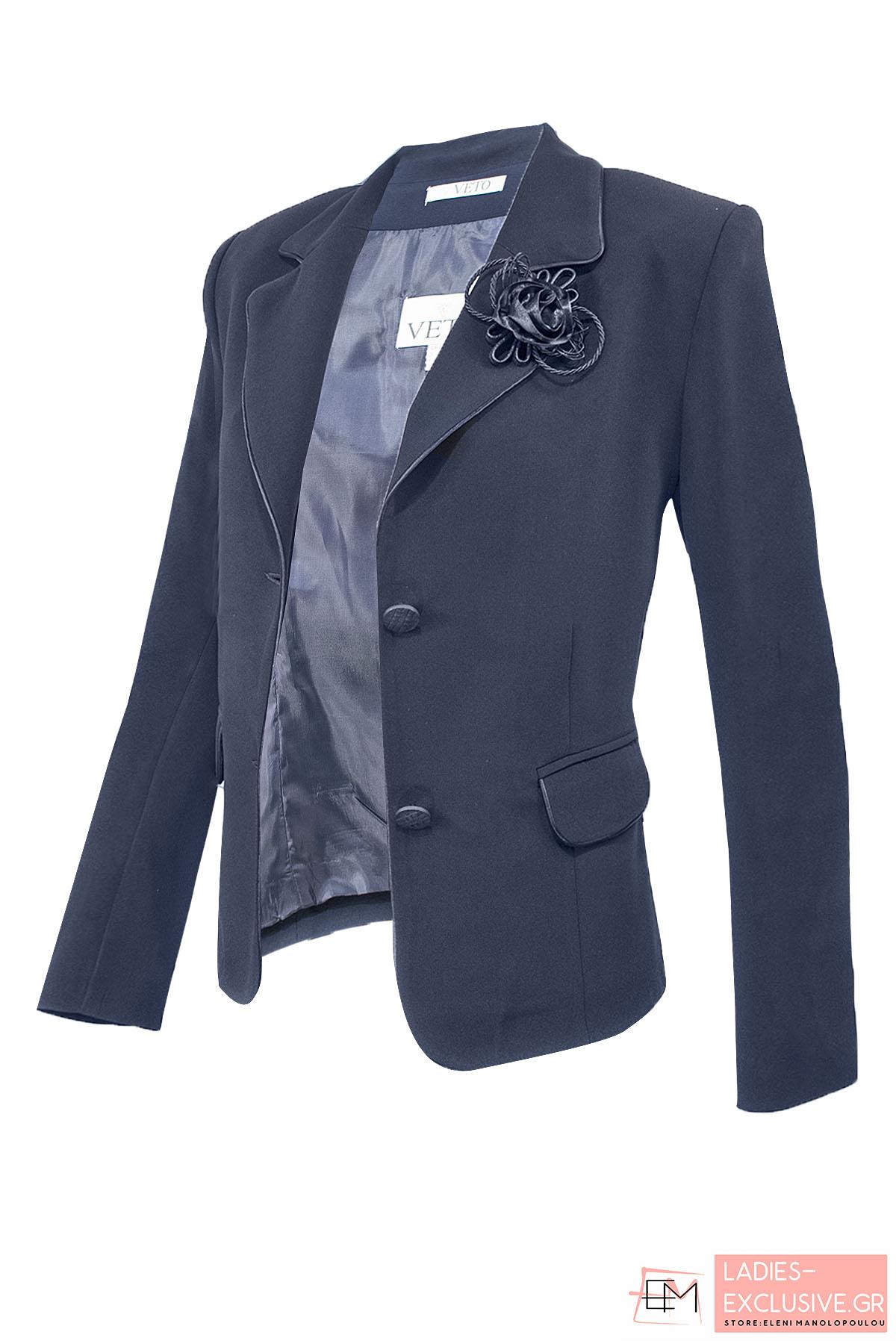 VETO Σακάκι μπλε κρεπ κλασικό, με μακρύ μανίκι, σατέν φυτίλια στα τελειώματα και μπουτουνιέρα στο πέτο. Ταιριάζει με τη φούστα κωδ.04-1005 δημιουργώντας ταγέρ