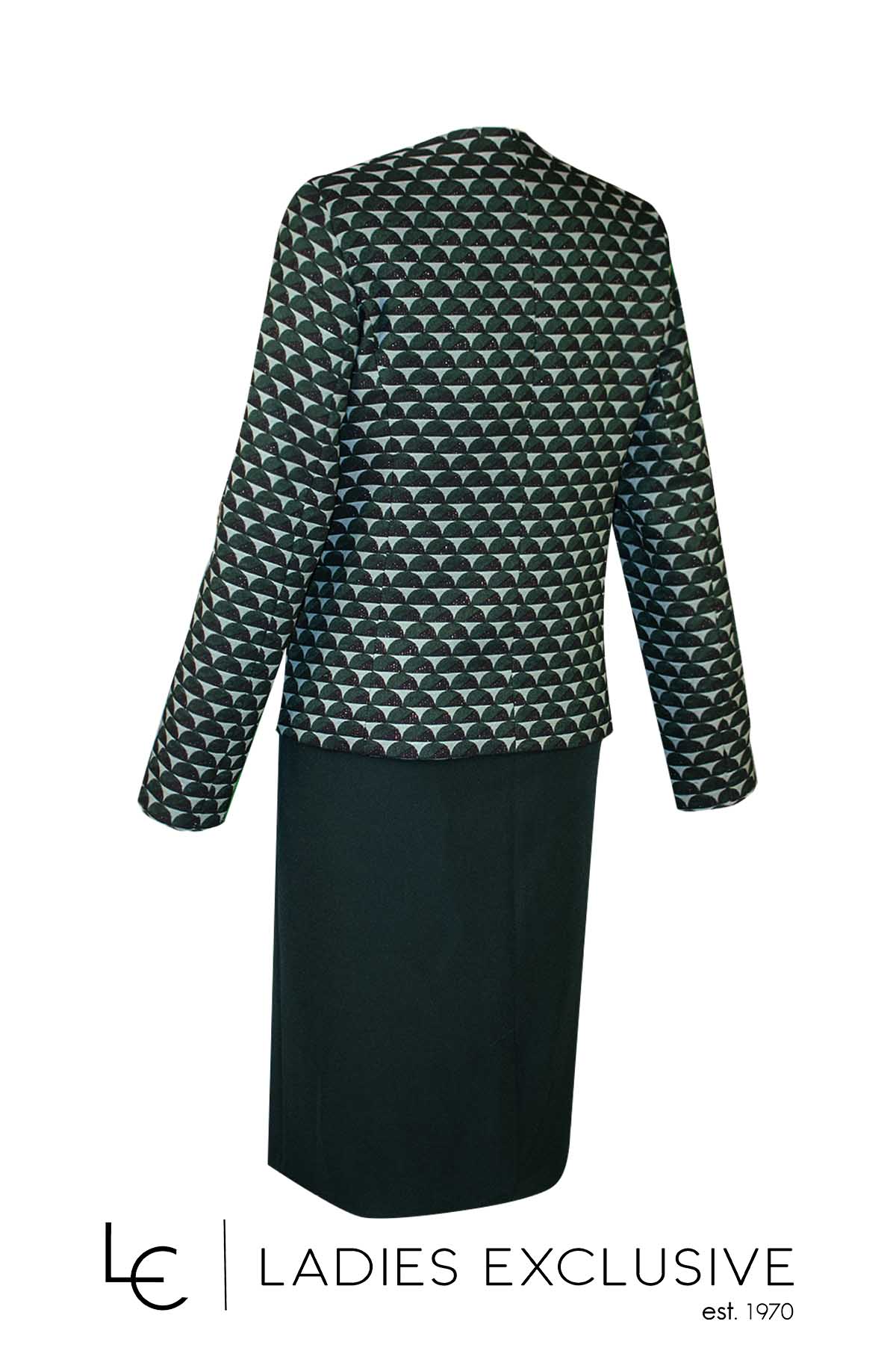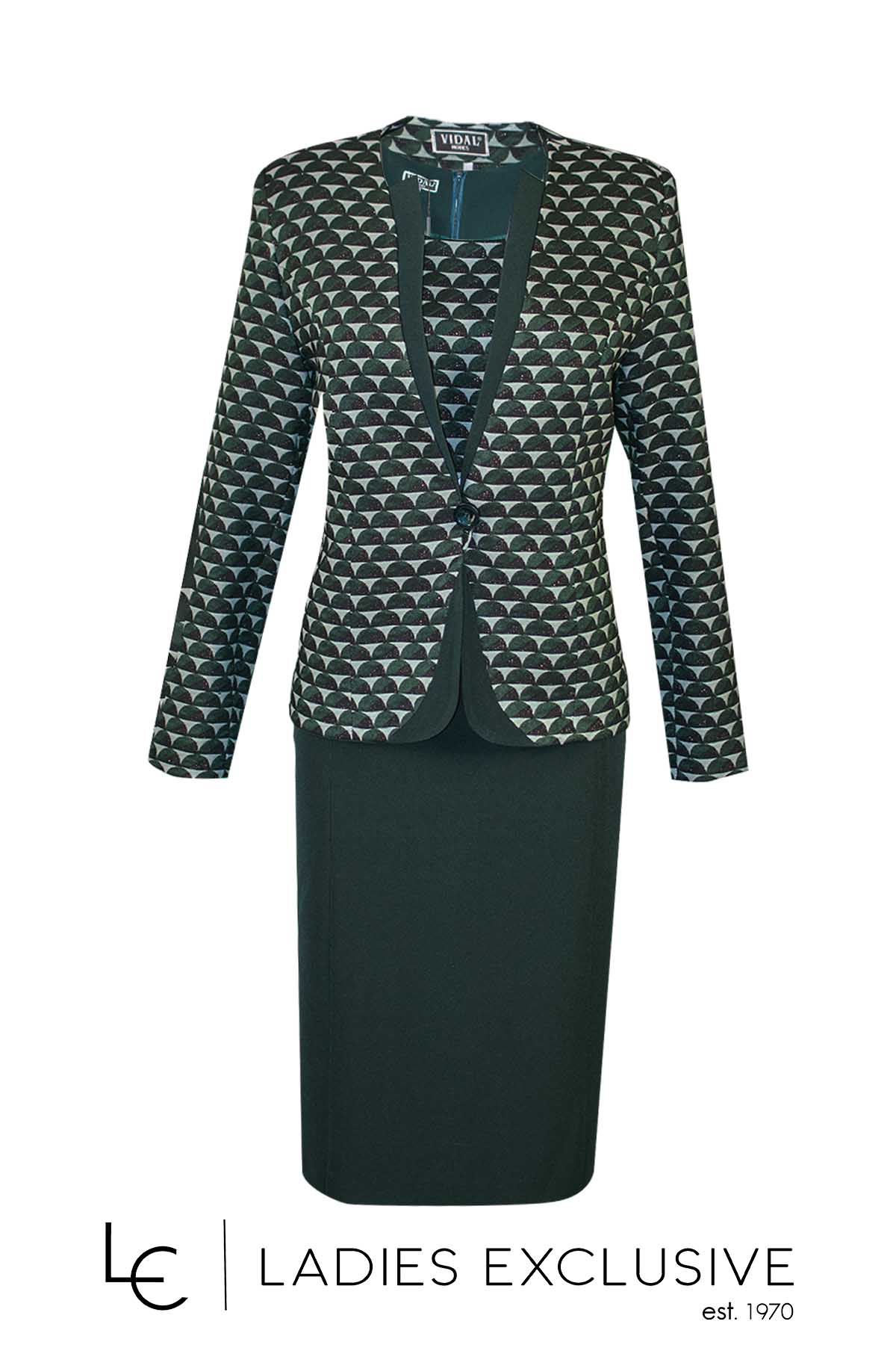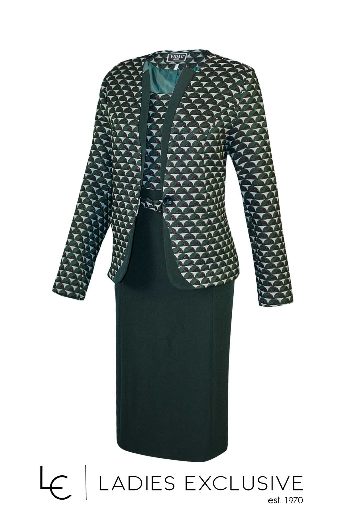VIDAL Σετ 2 τεμαχίων. Φόρεμα πράσινο κυπαρισσί σε ίσια γραμμή, με ιδιαίτερο σχέδιο στο πάνω μέρος και σακάκι με το μοτίβο του φορέματος χωρίς πέτο.