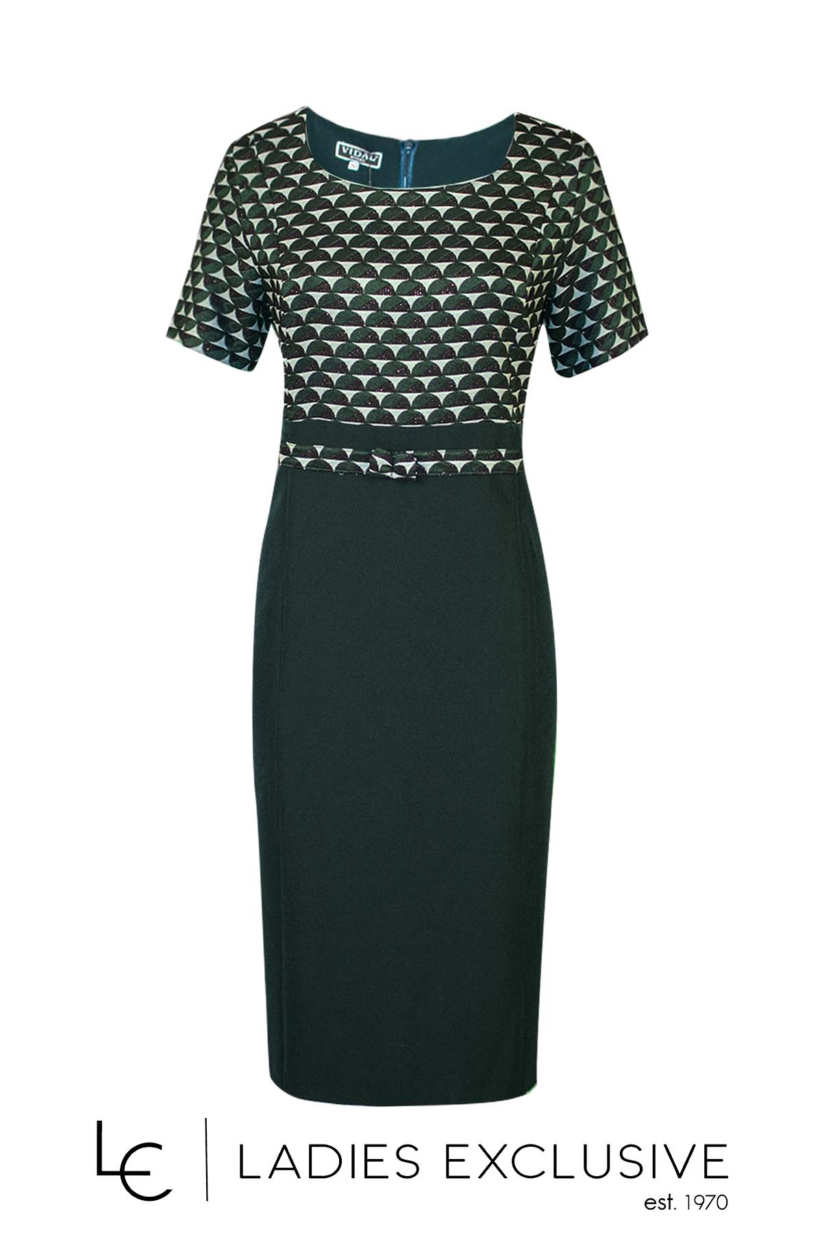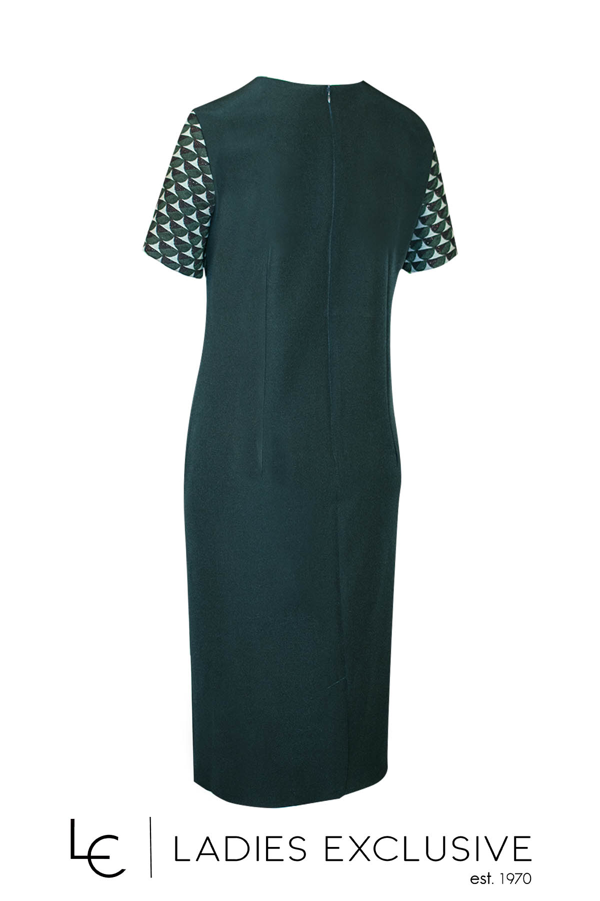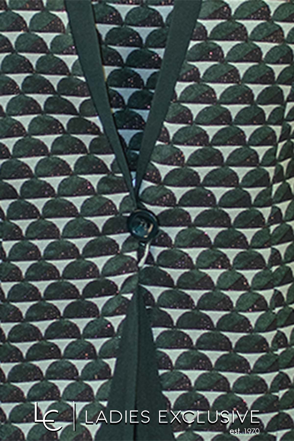 VIDAL Σετ 2 τεμαχίων. Φόρεμα πράσινο κυπαρισσί σε ίσια γραμμή, με ιδιαίτερο σχέδιο στο πάνω μέρος και σακάκι με το μοτίβο του φορέματος χωρίς πέτο.