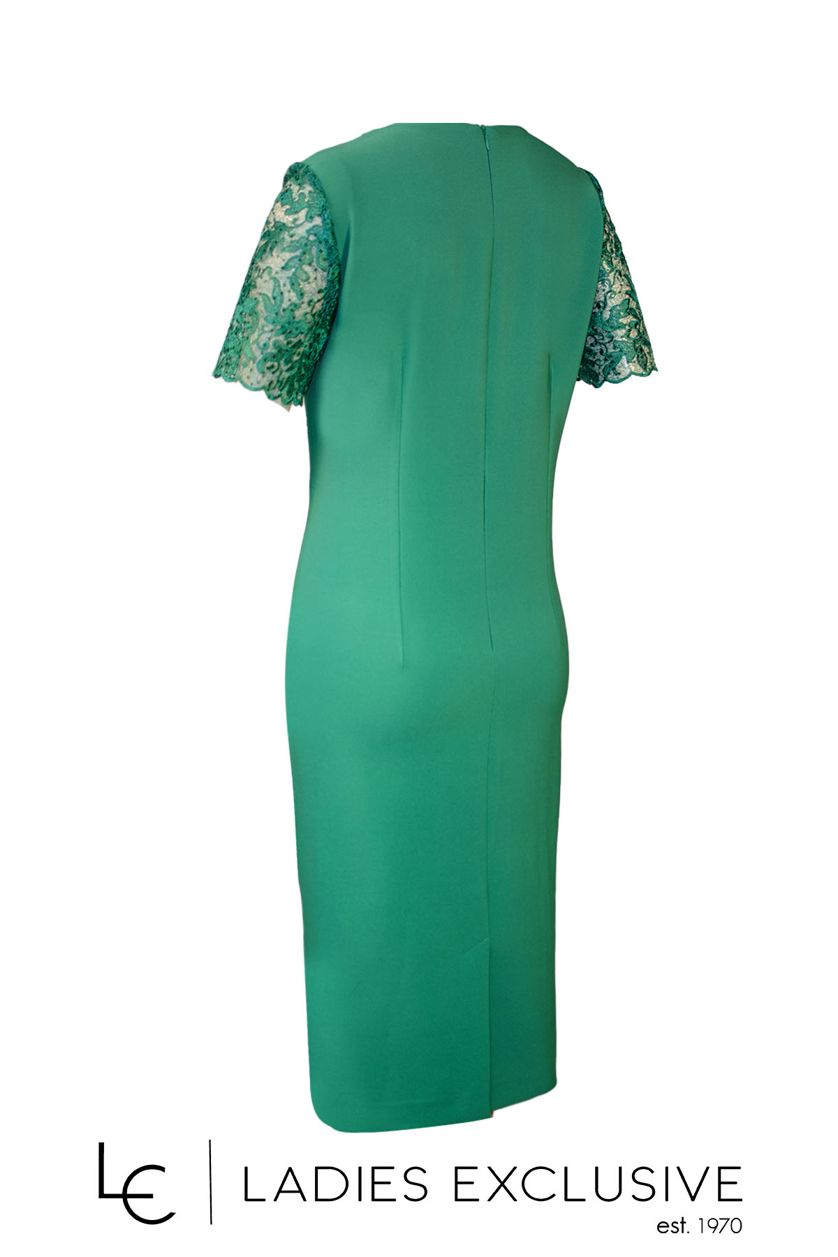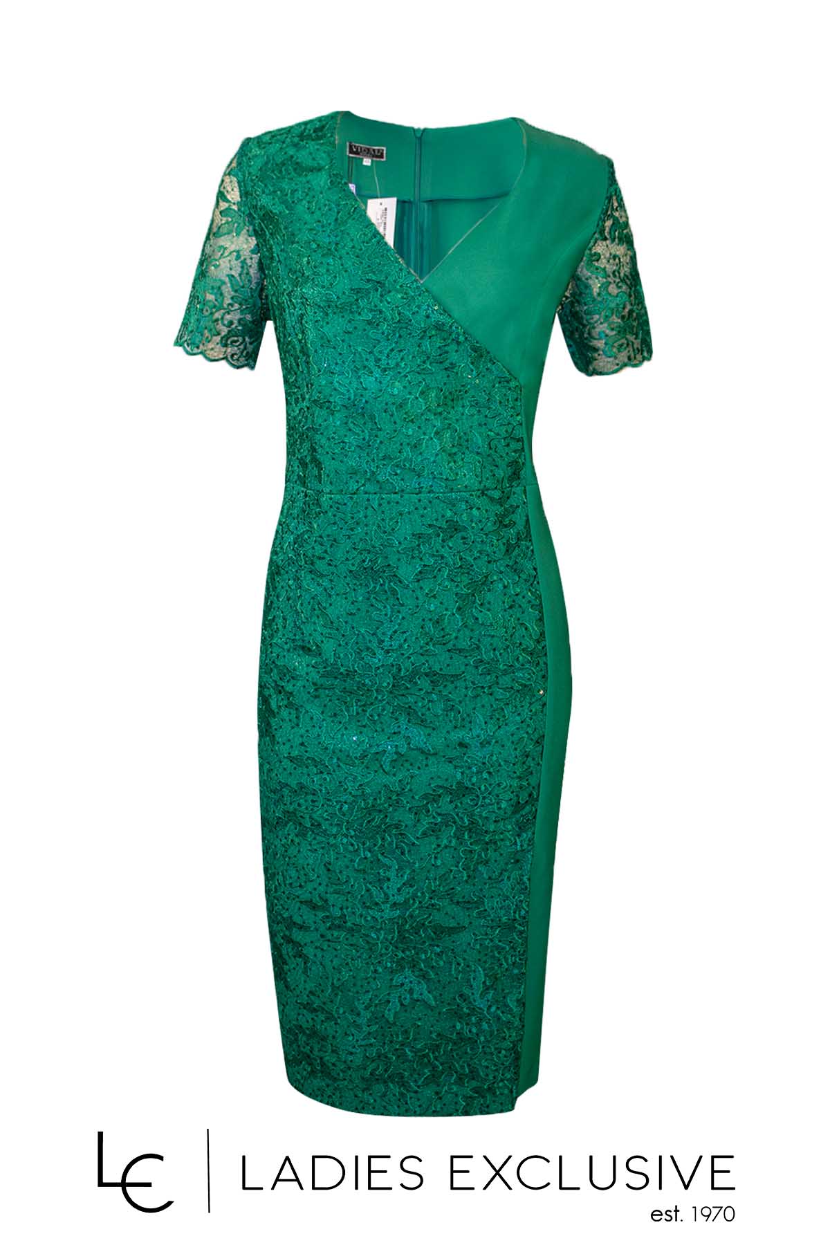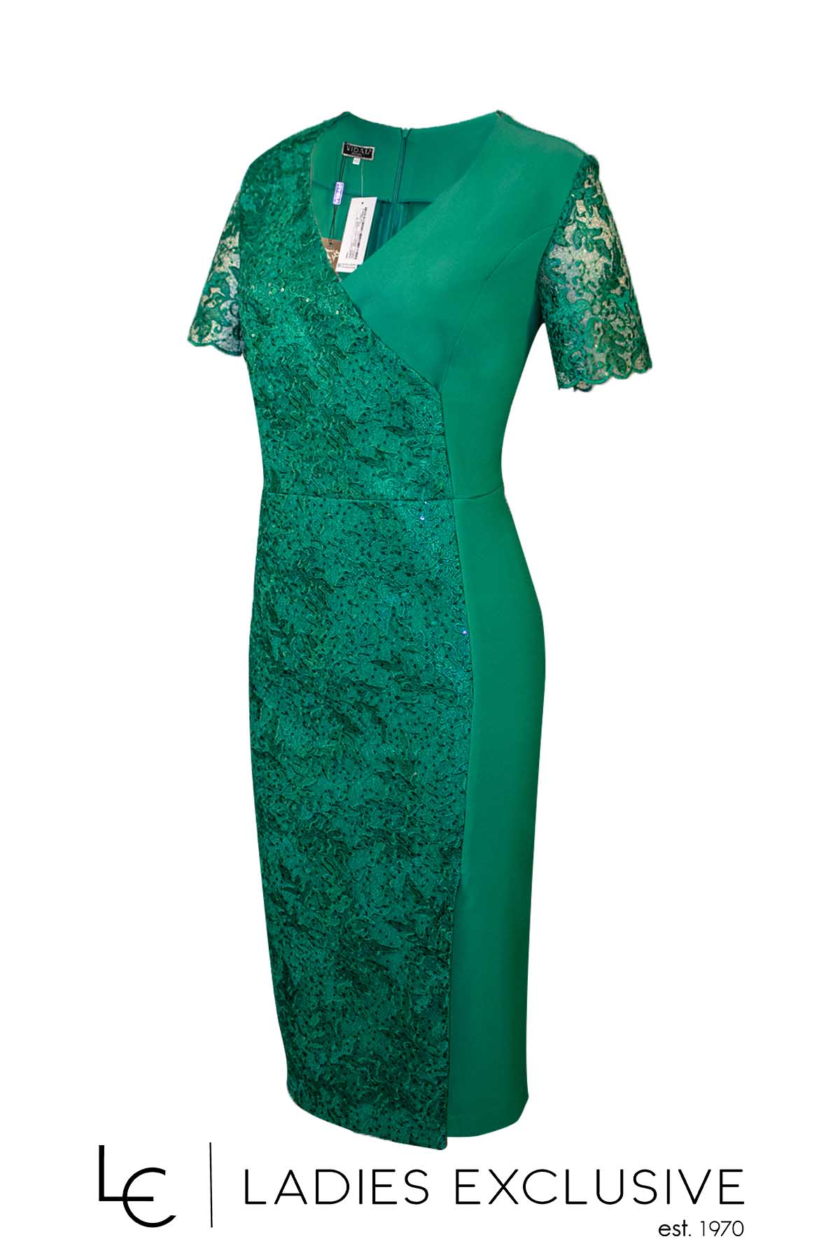 VIDAL Φόρεμα πράσινο βραδινό κοντομάνικο με δαντέλα και διακριτικά στρας.