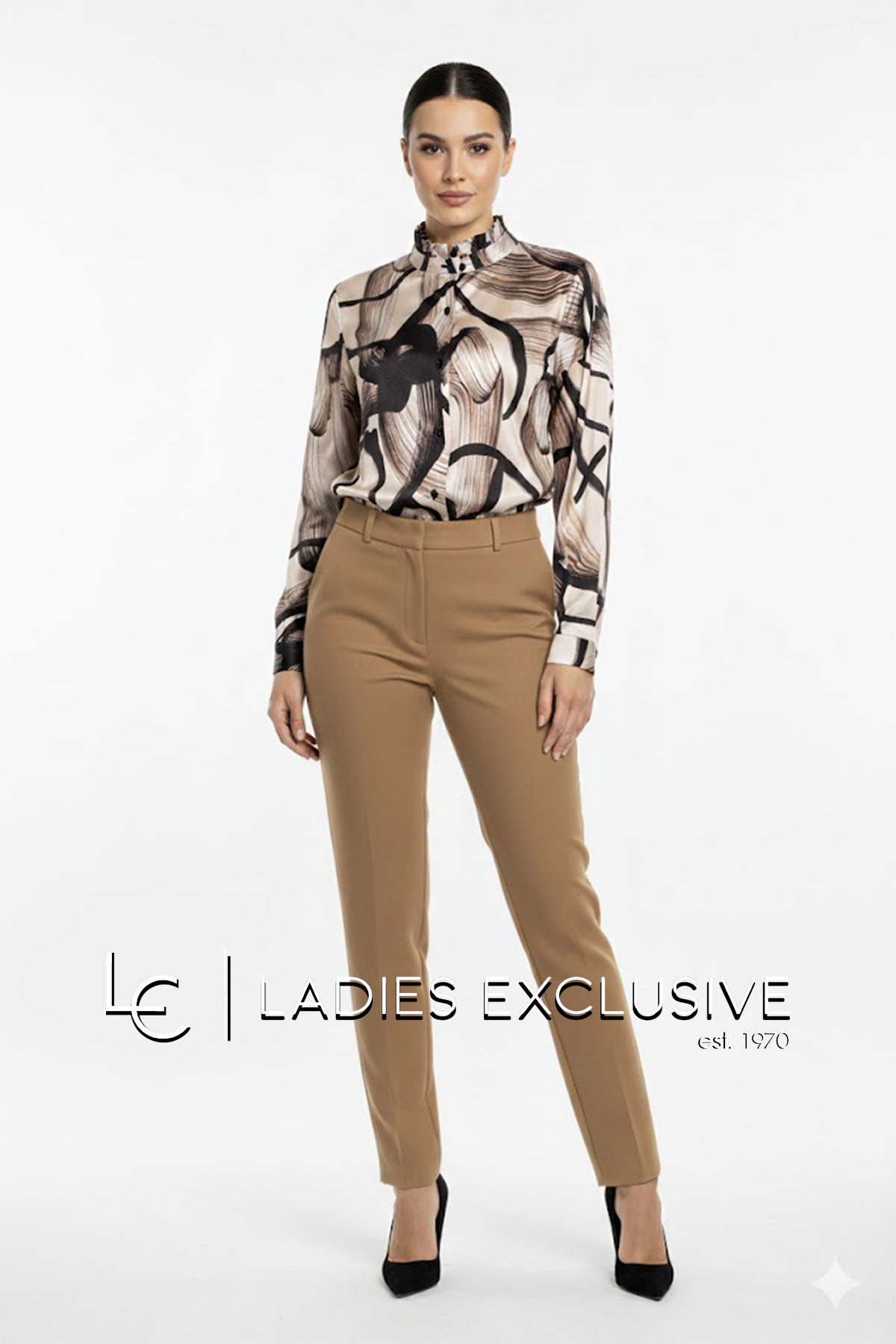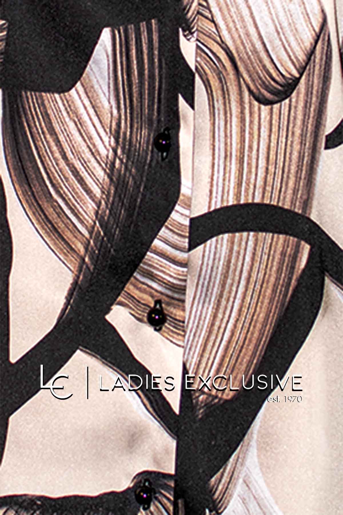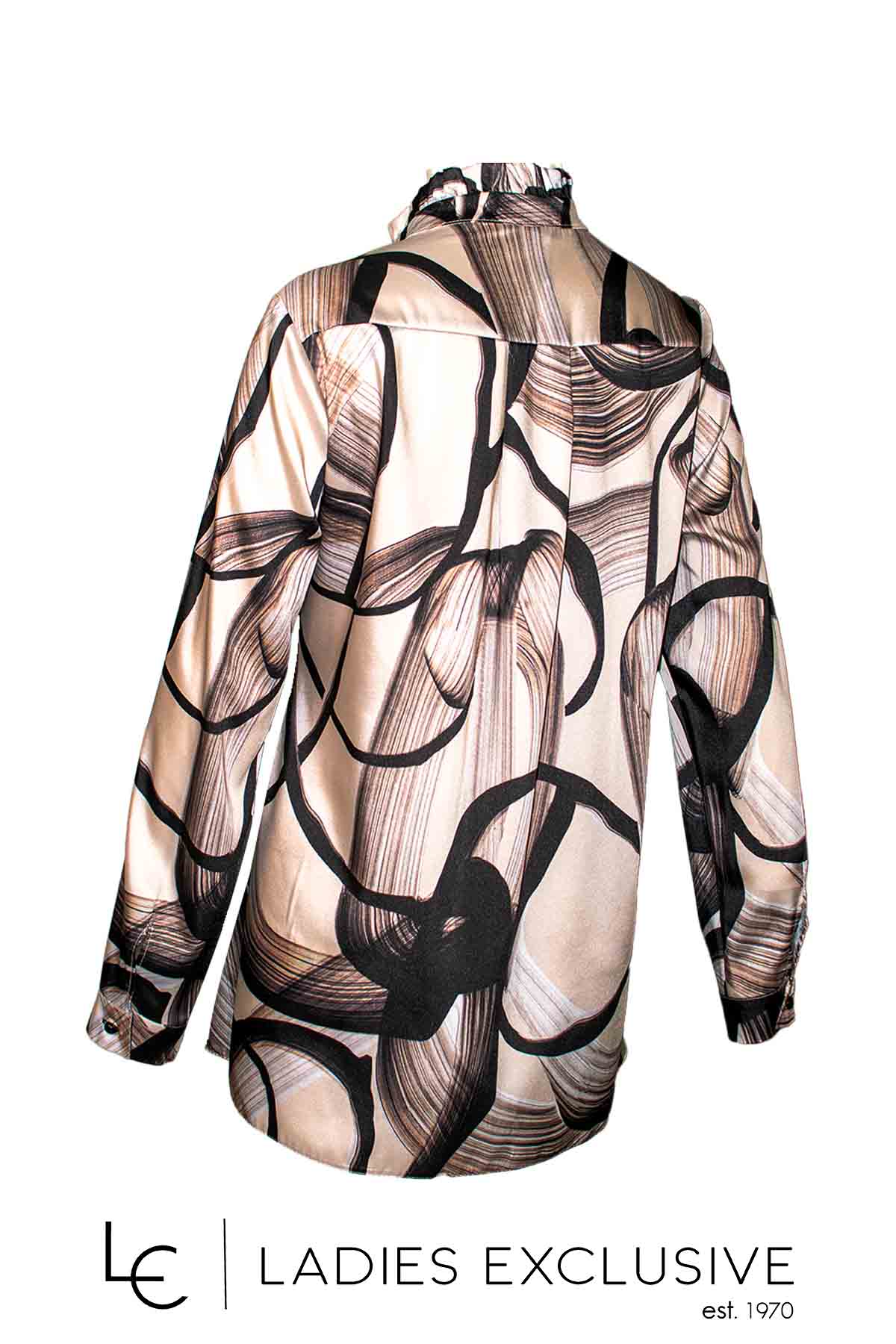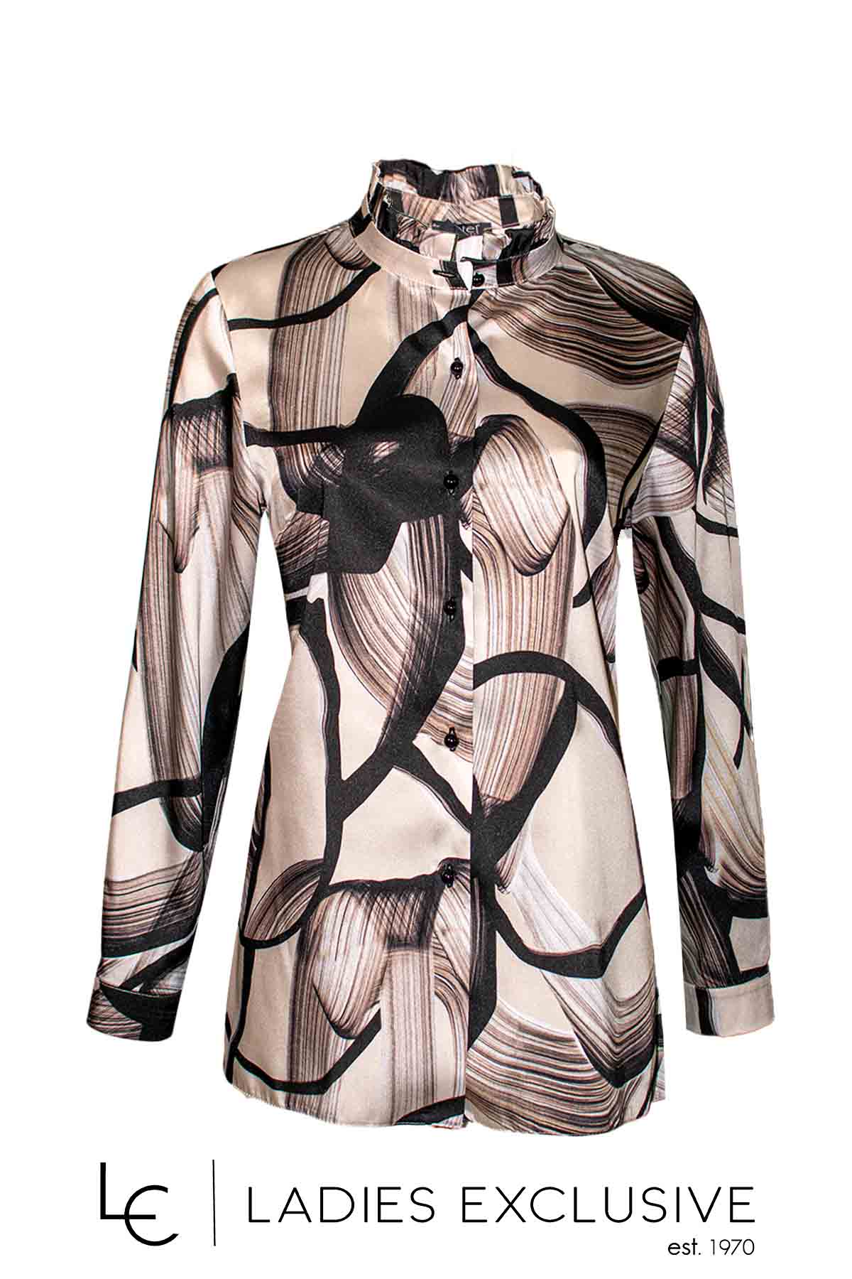 ESTEL Πουκάμισο σατέν σε γήινα χρώματα χωρίς πέτο, με μικρό βολάν στο λαιμό.